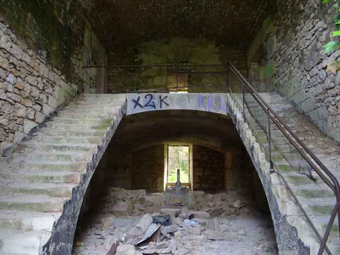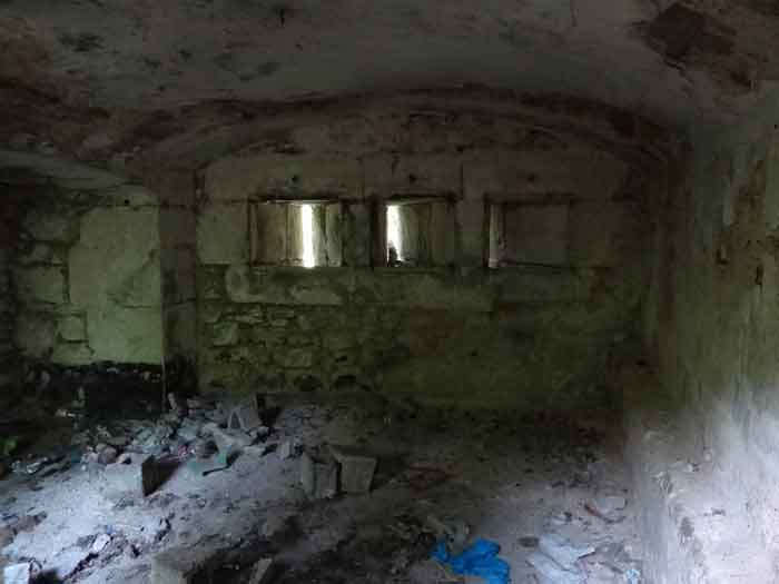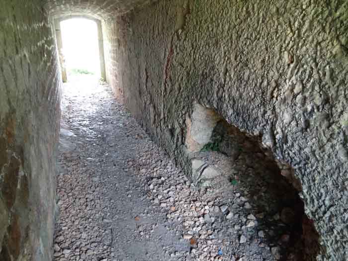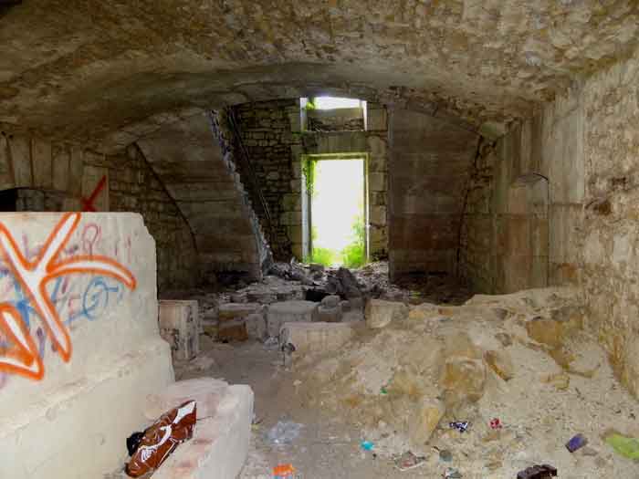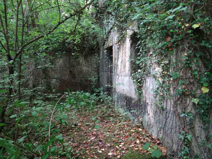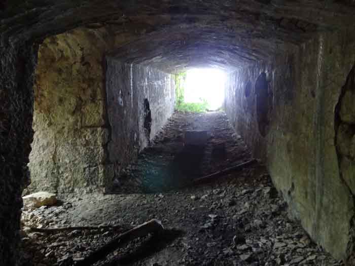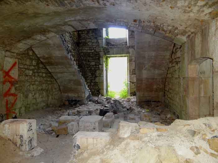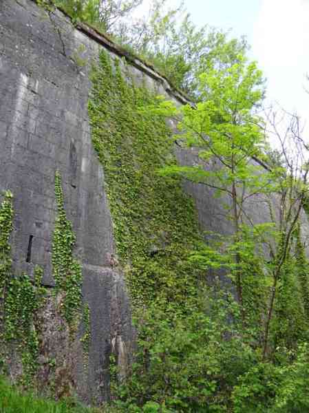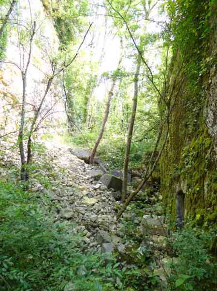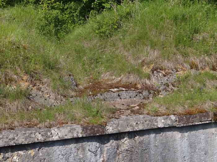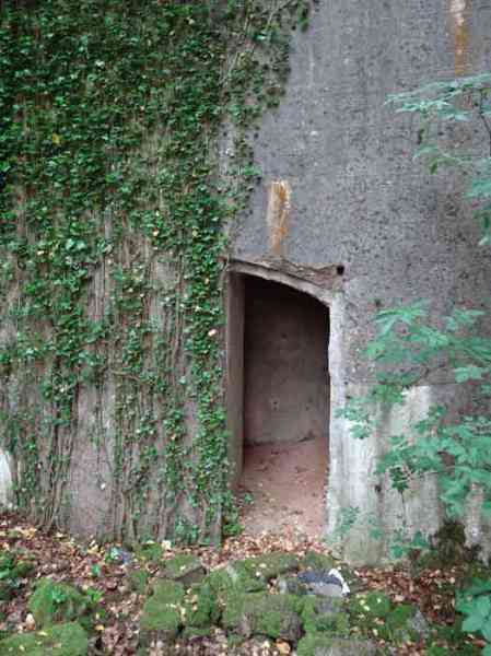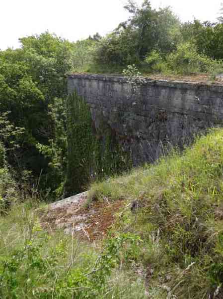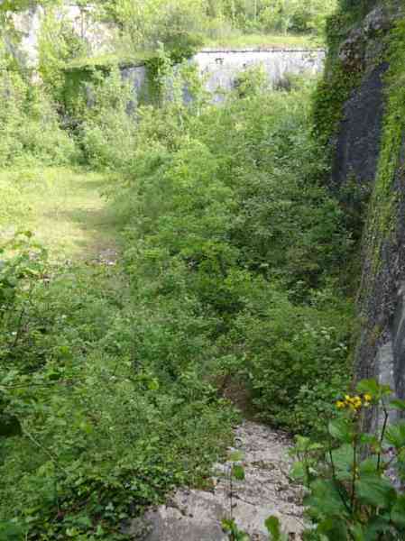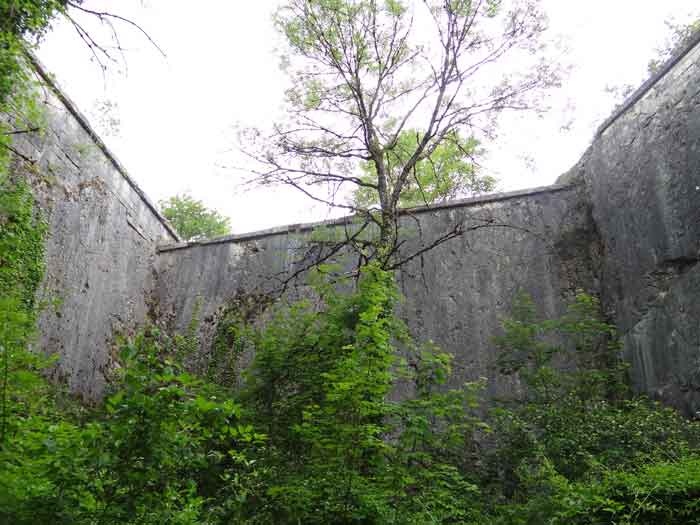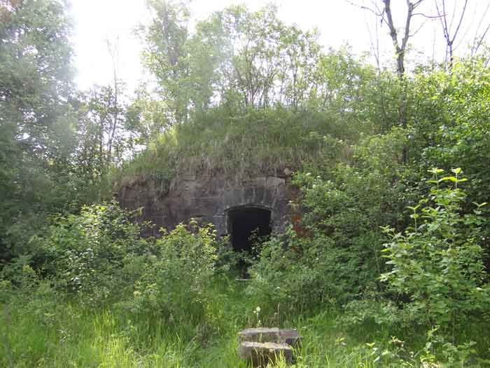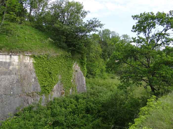 Belfort fortified camp, northeast of the city. 440 m/alt. Built between 1825 and 1842 with the Fort de la Miotte to which it is connected by the Vallon front. It was, in fact, an outgrowth of the city wall made necessary by the configuration of the terrain. This fort, part of the bastion system and with extremely tortuous contours since it followed the natural whims of the ridge supporting it, no longer had much value against rifled artillery. We did not have time to visit it, but we were assured that its powder magazine had, like that of the Fort de la Miotte, undergone transformations with the addition of one or more lamp battlements and lateral ducts. To its rear, no fewer than 2 (3?) central magazines will be built. See central stores in Belfort.