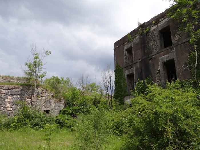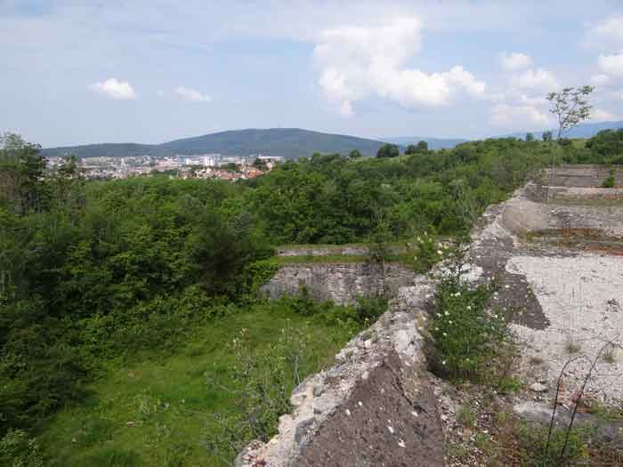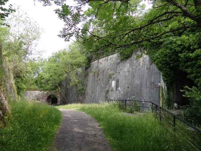 Verschansd kamp van Belfort, ten noordoosten van de stad. 440 m/hoogte. Gebouwd tussen 1825 en 1842 met het Fort de la Miotte, waarmee het verbonden is via de Vallon-front. Het was in feite een uitloper van de stadsmuur, noodzakelijk gemaakt door de configuratie van het terrein. Dit fort, onderdeel van het bastionsysteem en met extreem kronkelige contouren omdat het de natuurlijke grillen van de heuvelrug volgde, had niet veel waarde meer tegen getrokken artillerie. We hadden geen tijd om het te bezoeken, maar ons werd verzekerd dat het kruitmagazijn, net als dat van Fort de la Miotte, transformaties had ondergaan met de toevoeging van een of meer lampenkantelen en zijkanalen. Aan de achterkant ervan zullen minstens twee (3?) centrale magazijnen worden gebouwd. Bekijk centrale winkels in Belfort.