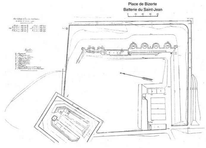 Bizerte. Gevestigd op de djebel Demna, op 186 meter hoogte, en op 4 kilometer ten noorden van Bizerte, maakt deze batterij deel uit van het programma van 1898. Het is een hybride werk, dat in een omheining, deels door een muur, deels door een verdedigingsrooster gesloten, een bombardementsbatterij van 4 G-kanonnen 240 Mle 1884 op affuit G Mle 1890 PC, en een nevenbatterij van 4 G-kanonnen 95 Mle 1888 op affuit G Mle 1892 omvat. Het front, en de zuidflank, zijn beschermd door een gracht, geflankeerd door een contrescarpkoffer. Deze is niet bekleed. Op de noordwesthoek herbergt een réduit, omringd door een gracht geflankeerd door 2 contrescarpkoffers, de commandopost van de noordgroep van de artillerie van de zeefront. Het werk beschikt over een belangrijke inkwartiering en een grotmagazijn. Het wordt gemoderniseerd vanaf 1904. Het ontvangt aldus een betonnen gevechtsonderkomen tussen de stukken 2 en 3 van de 240, affuiten Mle 1904 voor zijn 95 kanonnen, en affuiten Mle 1890-03 voor zijn 240 kanonnen. Vanaf begin 1915 moet de 7e Afrikaanse Artilleriegroep, die de kustwerken bewapent, een groot deel van haar artilleristen naar het moederland sturen. Zij worden, in onvoldoende aantal, vervangen door territorialen en hulptroepen. Hun gebrek aan vorming, toegevoegd aan de behoefte aan zwaar artilleriemateriaal voor het front, zal de gedeeltelijke, dan totale ontwapening van bepaalde batterijen veroorzaken. Een ministerieel telegram van 10 maart 1916 schrijft de ontwapening voor van de batterijen Saint-Jean, Aïn Roumi, Aïn Bittar en Chreck ben Chabane. De lopen van de 240 van Saint-Jean worden gedemonteerd, en naar het moederland verzonden op 25 en 26 augustus 1916. De batterij wordt tussen de twee oorlogen niet herbewapend. In 1939 verenigt zij de rol van commandopost van de artillerie van de zeefront, en van commandopost van de noordgroep. Op het einde van de jaren 50, in het kader van de Koude Oorlog, wordt onder het werk een zendcentrum gebouwd, beschermd onder 40 meter rots. Tegenwoordig is de site, zoals satellietfoto's tonen, diepgaand gewijzigd en ontoegankelijk. In Franse documenten wordt het werk evenzeer batterij van Saint-Jean, van Saint-Jean of Saint-Jean genoemd. JJM 14/10/07