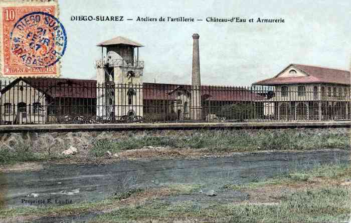 Diego-Suarez. La loi du 2 mars 1901 alloue 10 000 000 francs pour la construction du bassin de radoub et de l’arsenal. Cette somme est prélevée sur le crédit de 75 000 000 francs, prévu pour l’outillage des ports de guerre, et l’établissement des bases d’opération de la flotte. Le bassin de radoub, de 200 mètres sur 25, ne sera effectivement réalisé qu’entre 1905 et 1913, et ne sera mis en service effectif qu’après la Première Guerre mondiale. Un réseau de voie de 60 parcourt l’arsenal. En septembre 1928, il se développe sur 1 720 mètres et compte 10 aiguillages et 18 plaques tournantes, mais n’est pratiquement pas utilisé. On ne compte que 10 wagonnets utilisables. À l’origine, la traction était animale, mais on peut penser que la traction mécanique l’a remplacée. À la restitution de l’arsenal, qu’ils occupent depuis novembre 1942, les Britanniques laissent sur place deux locomoteurs diesel de 28 cv, qui attestent de l’utilisation du réseau pour leurs besoins. Das Gesetz vom 2. März 1901 bewilligt 10 000 000 Francs für den Bau des Trockendocks und des Arsenals. Diese Summe wird aus dem Kredit von 75 000 000 Francs entnommen, der für die Ausrüstung der Kriegshäfen und die Einrichtung der Operationsbasen der Flotte vorgesehen ist. Das Trockendock, 200 Meter auf 25, wird tatsächlich erst zwischen 1905 und 1913 realisiert und erst nach dem Ersten Weltkrieg in Betrieb genommen. Ein Feldbahnnetz der Spurweite 60 durchzieht das Arsenal. Im September 1928 erstreckt es sich über 1 720 Meter und umfasst 10 Weichen und 18 Drehscheiben, wird aber praktisch nicht genutzt. Es sind nur 10 brauchbare Kipploren vorhanden. Ursprünglich war die Zugtiere, aber man kann annehmen, dass sie durch mechanische Zugkraft ersetzt wurde. Bei der Rückgabe des Arsenals, das sie seit November 1942 besetzt halten, hinterlassen die Briten zwei 28 PS starke Diesellokomotiven vor Ort, die von der Nutzung des Netzes für ihre Bedürfnisse zeugen. De wet van 2 maart 1901 kent 10 000 000 frank toe voor de bouw van het droogdok en het arsenaal. Dit bedrag wordt onttrokken aan het krediet van 75 000 000 frank, voorzien voor de uitrusting van de oorlogshavens en de vestiging van de operatiebasissen van de vloot. Het droogdok, 200 meter bij 25, zal pas tussen 1905 en 1913 worden gerealiseerd en pas na de Eerste Wereldoorlog in gebruik worden genomen. Een veldspoor van spoorwijdte 60 doorkruist het arsenaal. In september 1928 strekt het zich uit over 1 720 meter en telt 10 wissels en 18 draaischijven, maar wordt praktisch niet gebruikt. Er zijn slechts 10 bruikbare kiplorries. Oorspronkelijk werd de tractie door dieren verzorgd, maar men kan aannemen dat mechanische tractie deze heeft vervangen. Bij de teruggave van het arsenaal, dat ze sinds november 1942 bezet houden, laten de Britten twee diesellocomotieven van 28 pk achter, die getuigen van het gebruik van het netwerk voor hun behoeften. The law of 2 March 1901 allocates 10,000,000 francs for the construction of the dry dock and the arsenal. This sum is taken from the credit of 75,000,000 francs, intended for the equipment of war ports, and the establishment of the fleet's operational bases. The dry dock, 200 metres by 25, will only actually be built between 1905 and 1913, and will only be effectively put into service after the First World War. A 60 cm gauge railway network runs through the arsenal. In September 1928, it extends over 1,720 metres and has 10 points and 18 turntables, but is practically unused. Only 10 usable tipper wagons are counted. Originally, traction was animal, but one might think that mechanical traction replaced it. Upon the restitution of the arsenal, which they have occupied since November 1942, the British leave behind two 28 hp diesel locomotives, which attest to the use of the network for their needs. Zákon z 2. března 1901 přiděluje 10 000 000 franků na stavbu suchého doku a arzenálu. Tato částka je odečtena z úvěru 75 000 000 franků, určeného pro vybavení válečných přístavů a zřízení operačních základen flotily. Suchý dok o rozměrech 200 metrů na 25 bude skutečně realizován až v letech 1905 až 1913 a do provozu bude uveden až po první světové válce. Arzenálem prochází úzkorozchodná dráha o rozchodu 60 cm. V září 1928 se rozkládá na 1 720 metrech a má 10 výhybek a 18 točen, ale prakticky se nepoužívá. Je evidováno pouze 10 použitelných kypřicích vozíků. Původně byl pohon zvířecí, ale lze se domnívat, že jej nahradila mechanická trakce. Při vrácení arzenálu, který od listopadu 1942 okupují, zanechávají Britové na místě dva dieselové lokomotivy o výkonu 28 k, které dokládají využití sítě pro jejich potřeby. © JJM 25/03/2026
