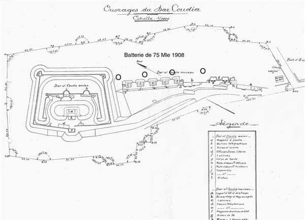 Bizerte. The Koudia battery is one of the first realized, as its location was set as early as 1888. One must wait until 1894 to see the start of its construction. It was completed and armed the following year. It is located at elevation 45, near Fort Espagne, which marks the northern limit of the town's enceinte. It is a pentagonal work, with a ditch flanked by two caponiers. It includes a cavern magazine and is armed with 4 G guns 19 cm Mle 1878 on carriage G PC. The auxiliary battery, armed with 4 guns 95 Mle 1888 on carriage G Mle 1892, is located outside, in immediate proximity to Fort Espagne. The 1900 program provides for the construction of a new battery, called Koudia Nouveau, which is to be armed with 4 G guns Mle 1884 suitable for carriage G Mle 1901. The old battery, which then takes the name Koudia Ancien, is to be rearmed with 4 G guns 240 on carriage G Mle 1890 PC. This rearmament will not take place because, on June 20, 1903, the decision is made to disarm Koudia Ancien to convert it into the command post for the sea front. Koudia Nouveau, placed between the old battery and the auxiliary battery, then receives the armament intended for Koudia Ancien, namely 4 G guns 240 Mle 1884 on carriage G Mle 1890-03. The Koudia Nouveau work is an alignment of platforms, separated by concrete combat shelters of the model adopted by the CEPAC in 1901. As for the auxiliary battery, it receives carriages Mle 1904 for its 95 Mle 1888. All this equipment is sent to metropolitan France in 1916. Between the two wars, Koudia Ancien is transformed into the command post for anti-aircraft defense, coast defense, and the group for the defense of the channels, which includes the light artillery batteries of Koudia and Maison Cantonnière. The Koudia battery is installed on the site of the Koudia Nouveau and auxiliary batteries. It is armed with 4 guns 75 Mle 1908-18. This is equipment from battleships of the Danton class, adapted for coast fire, with the addition of a light shield. Installed on platform BA Mle 25, placed in a circular pit, it fires, at an angle of 25°, a steel shell to 10,000 meters. The ammunition is fixed, and the semi-automatic breech allows a rate of fire of 15 rounds per minute. Pit 1 is placed in front and to the left of the old auxiliary battery, and pits 2 to 4 on the glacis of the old 240 battery. The FCB is located within the enclosure of Koudia Ancien. The equipment is captured intact by Axis forces and destroyed in May 1943. After the war, Koudia Ancien is still used as a command post for anti-aircraft and coast defense. Nowadays, the work has been overtaken by urbanization. In 2001, while Koudia Ancien had disappeared, the remains of the 75 battery were still visible and bore the scars of the fighting of July 1961. Since then, bulldozers have done their work, and the site has been leveled. One can console oneself by going to see Fort Espagne, which displayed in 1998 a gun 90 Mle 1877 and two guns 47 Breda Mle 35. In 2001, they had disappeared. What became of them? Also to be seen, in Fort Espagne, the remnant of the town's surrounding wall, which leads to the Casbah. Other names for the site: Koudiat, Coudia, Dar el Koudia, Dar el Coudia, etc. JJM 14/10/07