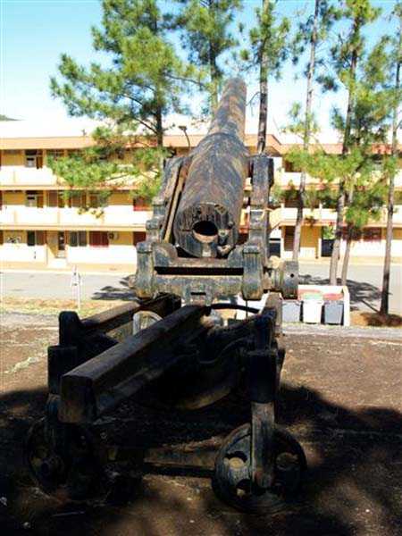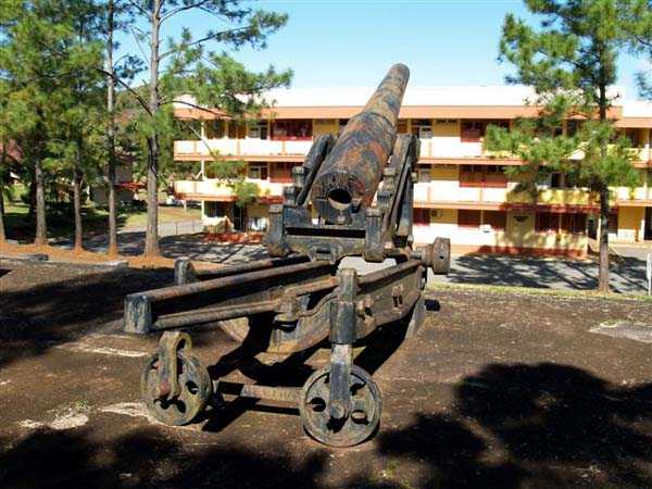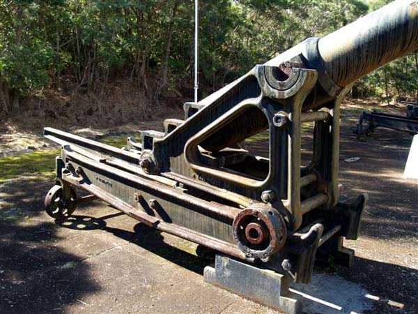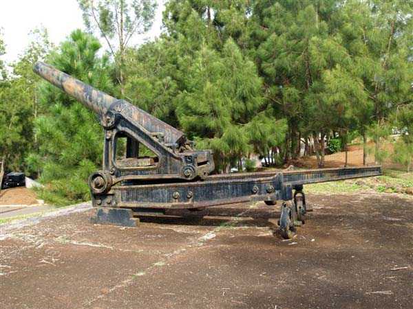 Nouméa. La batterie de Koumourou est située à l’extrémité ouest de la presqu’île Ducos, à la cote 136. Sa mission est l’interdiction de l’entrée de la grande rade, de concert avec la batterie de Téréka, avec laquelle elle croise ses feux. Construite en 1896, c’est une installation très simple, qui regroupe, abrités derrière un simple mur maçonné, 4 canons M de 14 cm Mle 1870 sur affût M Mle 1847 PA. Les pièces sont disposées en arc de cercle, avec un entraxe de 10 mètres. Elles couvrent ainsi un secteur d’environ 120°. Le canon de 14 cm Mle 1870, dont le calibre réel est de 138,6 mm, pèse 2 600 kilos, et l’affût Mle 1847, avec son châssis, 3 815 kg. Le tube peut expédier un obus allongé, pesant 21 kg, à 7 800 mètres à l’angle de 45°, avec une vitesse initiale de 455 m/s procurée par une charge de 4 kg de poudre. Mais la portée pratique ne dépassait pas 5 000 mètres. La batterie n’est véritablement opérationnelle qu’à partir de 1899, après la modification des châssis, que nous avons évoquée dans l’historique sur Nouméa. Elle est déclassée en 1906. Les pièces ont été déposées en décembre 1986, et remontées au camp Broché, à Plum. De nos jours, le site est complètement embroussaillé, y compris la route d’accès. Seuls les pivots de châssis sont restés sur place. Nous n’avons pas trouvé trace de la moindre construction annexe. Une excavation dans le rocher laisse penser que les projectiles et la poudre étaient stockés dans un bâtiment léger, qui les protégeait des intempéries. Il est vrai que l’altitude de la batterie la rendait peu vulnérable aux tirs venant du large, compte tenu des faibles angles de tir des affûts de bord de l’époque. Au départ de la route d’accès, on peut voir les vestiges de la base d’hydravion installée par les Américains, pendant la Seconde Guerre mondiale. Des bâtiments légers et des pyramides de barils de carburant, avec les moyens de pompage, sont présents. Une tenace odeur d’essence flotte encore sur les lieux… JJM 30/06/07