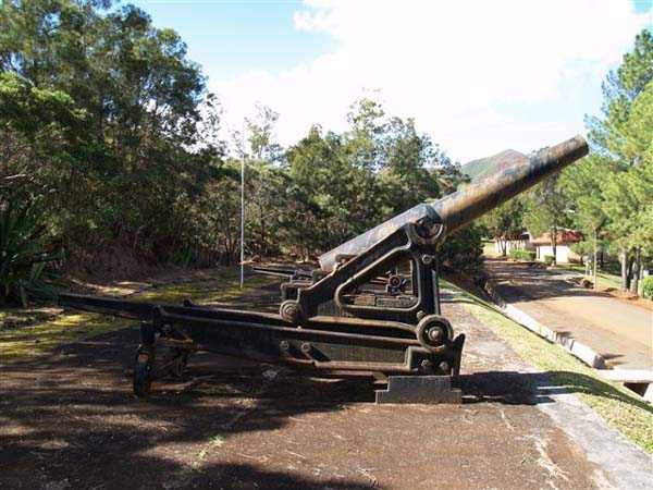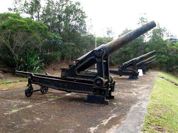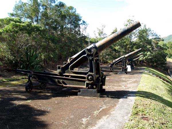 Nouméa. Baterie Koumourou se nachází na západním konci poloostrova Ducos na kótě 136. Jejím úkolem je blokovat vstup do velké rejdy ve spolupráci s baterií Téréka, se kterou kříží palbu. Postavená v roce 1896 je to velmi jednoduchá instalace, která sdružuje čtyři 14cm M děla vz. 1870 na M lafetě vz. 1847 PA, ukrytá za jednoduchou zděnou zdí. Děla jsou uspořádána do kruhového oblouku se středovou vzdáleností 10 metrů. Pokrývají tak sektor asi 120°. 14cm dělo vz. 1870, jehož skutečná ráže je 138,6 mm, váží 2 600 kilogramů a lafeta vz. 1847 i s podvozkem 3 815 kg. Hlaveň může vystřelit protáhlý granát o hmotnosti 21 kg na 7 800 metrů pod úhlem 45°, s počáteční rychlostí 455 m/s zajištěnou náplní 4 kg prachu. Praktický dostřel však nepřekročil 5 000 metrů. Baterie se stala skutečně operační až od roku 1899, po úpravě podvozků, kterou jsme zmínili v historickém přehledu o Nouméi. Byla vyřazena v roce 1906. Děla byla v prosinci 1986 sejmuta a znovu sestavena v táboře Broché v Plum. Dnes je místo zcela zarostlé, včetně přístupové cesty. Na místě zůstaly pouze otočné body podvozků. Nenašli jsme žádné stopy po přístavbě. Výkop ve skále naznačuje, že střely a prach byly skladovány v lehké budově, která je chránila před povětrnostními vlivy. Je pravda, že nadmořská výška baterie ji kvůli malým náměrovým úhlům tehdejších palubních lafet činila málo zranitelnou vůči palbě z moře. Na začátku přístupové cesty lze vidět pozůstatky hydroplánové základny zřízené Američany během druhé světové války. Jsou zde lehké budovy a pyramidy z palivových sudů s čerpací technikou. Na místě stále přetrvává vytrvalý zápach benzínu… JJM 30/06/07