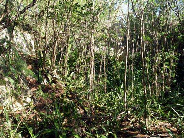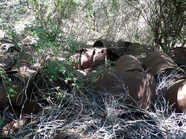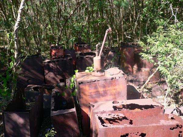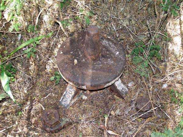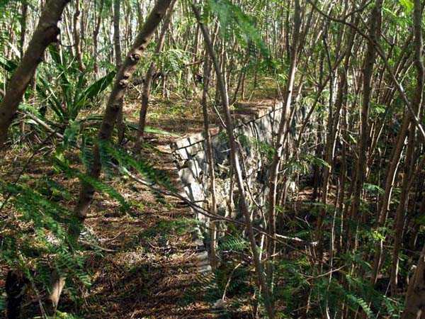 Nouméa. The Koumourou battery is located at the western end of the Ducos peninsula at level 136. Its mission is to block the entrance to the large roadstead, in conjunction with the Téréka battery, with which it crosses its fire. Built in 1896, it is a very simple installation grouping four 14 cm M guns Mle 1870 on M carriage Mle 1847 PA, sheltered behind a simple masonry wall. The pieces are arranged in a circular arc with a centre distance of 10 metres. They thus cover a sector of about 120°. The 14 cm gun Mle 1870, whose actual calibre is 138.6 mm, weighs 2,600 kilograms, and the carriage Mle 1847 with its chassis weighs 3,815 kg. The barrel can fire an elongated shell weighing 21 kg to 7,800 metres at an angle of 45°, with an initial velocity of 455 m/s provided by a charge of 4 kg of powder. But the practical range did not exceed 5,000 metres. The battery only became truly operational from 1899 onwards, after the modification of the chassis, which we mentioned in the historical overview of Nouméa. It was downgraded in 1906. The pieces were removed in December 1986 and reassembled at Camp Broché in Plum. Nowadays, the site is completely overgrown, including the access road. Only the chassis pivot points remain in place. We found no trace of any outbuildings. An excavation in the rock suggests that the projectiles and powder were stored in a light building that protected them from the weather. It is true that the altitude of the battery made it little vulnerable to fire from the sea, given the low elevation angles of the shipboard carriages of the time. At the start of the access road, one can see the remains of the seaplane base installed by the Americans during the Second World War. Light buildings and pyramids of fuel barrels with the pumping equipment are present. A persistent smell of petrol still lingers on the site… JJM 30/06/07