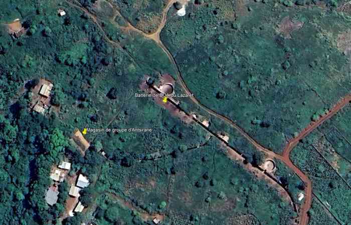Diego-Suarez. Installée au Cap du Lazaret, à l’altitude moyenne de 20 mètres, cette batterie était armée de 4 canons M de 138 Mle 1870 sur affût M Mle 1897 PA, d’une portée de 7500 mètres. Elle comporte 4 alvéoles maçonnées, séparées par des abris traverse et ne possède pas de magasin caverne. Son champ de tir de 120° recoupe celui de la batterie de l’Hôpital, pour couvrir les approches immédiates du port et de l’arsenal. Pendant la Seconde Guerre mondiale, une batterie de 2 pièces de 90 CCA Mle 1939 S est installée dans des cuves, à l’ouest de l’ex-batterie de 138 [-12.275752, 49.305886], à proximité immédiate du magasin de groupe, auquel elle est reliée par une tranchée. Sa mission prioritaire est le tir contre avions, mais elle peut également engager les navires. Un emplacement pour projecteur de poursuite CA est aménagé à cette occasion à l’extrémité gauche de l’ex batterie de 138, et un projecteur pour le tir contre la mer est placé sous abri en avant de celle-ci. Lors de l’opération « Ironclad », cette batterie ouvre le feu et abat plusieurs avions britanniques. Dépourvue de défense rapprochée, elle est neutralisée le 6 mai, à 9 heures 30, après six passes de mitraillage effectuées par 4 Hurricane. Il ne reste aucune trace des matériels, mais les deux batteries sont bien dégagées de la végétation. Am Kap Lazaret, auf einer durchschnittlichen Höhe von 20 Metern gelegen, war diese Batterie mit 4 M-Kanonen 138 mm Mle 1870 auf M-Lafette Mle 1897 PA (Lafette mit vorderem Drehpunkt) bewaffnet, mit einer Reichweite von 7500 Metern. Sie umfasst 4 gemauerte Zellen, getrennt durch Traversenunterstände, und besitzt kein Kavernenmagazin. Ihr Schussfeld von 120° überschneidet sich mit dem der Batterie des Hôpital, um die unmittelbaren Zufahrten zum Hafen und zum Arsenal zu decken. Während des Zweiten Weltkriegs wird eine Batterie mit 2 Geschützen 90 CCA Mle 1939 S in Gruben westlich der ehemaligen 138-mm-Batterie [-12.275752, 49.305886] installiert, in unmittelbarer Nähe des Gruppenmagazins, mit dem sie durch einen Graben verbunden ist. Ihre vorrangige Aufgabe ist das Feuer gegen Flugzeuge, sie kann jedoch auch Schiffe bekämpfen. Bei dieser Gelegenheit wird am linken Ende der ehemaligen 138-mm-Batterie ein Flak-Verfolgungsscheinwerferstand eingerichtet, und ein Scheinwerfer für das Feuer gegen die See wird in einem Unterstand vor dieser aufgestellt. Während der Operation « Ironclad » eröffnet diese Batterie das Feuer und schießt mehrere britische Flugzeuge ab. Ohne Nahverteidigung wird sie am 6. Mai um 9:30 Uhr nach sechs Angriffspässen von 4 Hurricanes ausgeschaltet. Es sind keine Spuren des Materials mehr vorhanden, aber die beiden Batterien sind gut von der Vegetation freigelegt. Geïnstalleerd op Kaap Lazaret, op een gemiddelde hoogte van 20 meter, was deze batterij bewapend met 4 M-kanonnen van 138 mm Mle 1870 op M-affuit Mle 1897 PA (affuit met voorste draaipunt), met een bereik van 7500 meter. Zij omvat 4 gemetselde cellen, gescheiden door traversenonderkomens en bezit geen grotmagazijn. Haar schootsveld van 120° overlapt dat van de batterij van Hôpital, om de onmiddellijke toegangen tot de haven en het arsenaal te bestrijken. Tijdens de Tweede Wereldoorlog wordt een batterij van 2 stukken 90 CCA Mle 1939 S geïnstalleerd in kazematten, ten westen van de voormalige 138 mm-batterij [-12.275752, 49.305886], in de onmiddellijke nabijheid van het groepsmagazijn, waarmee zij verbonden is door een loopgraaf. Haar prioritaire taak is het vuur tegen vliegtuigen, maar zij kan ook schepen bestrijden. Een opstelling voor een luchtafweervolgzoeklicht wordt bij die gelegenheid ingericht aan de linkerzijde van de voormalige 138 mm-batterij, en een zoeklicht voor het vuur tegen de zee wordt in een onderkomen voor deze batterij geplaatst. Tijdens operatie « Ironclad » opent deze batterij het vuur en schiet verschillende Britse vliegtuigen neer. Zonder nabijverdediging wordt zij op 6 mei om 9:30 uur uitgeschakeld, na zes mitrailleuraanvallen door 4 Hurricanes. Er is geen spoor meer van het materieel, maar de twee batterijen zijn goed vrijgemaakt van vegetatie. Located at Cape Lazaret, at an average altitude of 20 metres, this battery was armed with 4 M guns of 138 mm Mle 1870 on M mounting Mle 1897 PA (mounting with anterior pivot point), with a range of 7500 metres. It comprises 4 masonry cells, separated by traverse shelters and has no cavern magazine. Its field of fire of 120° overlaps that of the Hôpital battery, to cover the immediate approaches to the port and the arsenal. During the Second World War, a battery of 2 pieces of 90 CCA Mle 1939 S is installed in pits, west of the former 138 mm battery [-12.275752, 49.305886], in the immediate vicinity of the group magazine, to which it is connected by a trench. Its priority mission is anti-aircraft fire, but it can also engage ships. An anti-aircraft tracking searchlight position is laid out on this occasion at the left end of the former 138 mm battery, and a searchlight for firing against the sea is placed in a shelter in front of it. During Operation « Ironclad », this battery opens fire and shoots down several British aircraft. Lacking close defence, it is neutralised on 6 May at 9:30 am, after six strafing passes by 4 Hurricanes. No trace remains of the equipment, but the two batteries are well cleared of vegetation. Instalována na mysu Lazaret v průměrné nadmořské výšce 20 metrů byla tato baterie vyzbrojena 4 děly M ráže 138 mm vz. 1870 na lafetě M vz. 1897 PA (lafeta s předním bodem otáčení), s dostřelem 7500 metrů. Zahrnuje 4 zděné buňky, oddělené traverzovými kryty a nemá jeskynní skladiště. Její palebné pole 120° se překrývá s polem baterie Hôpital, aby pokrylo bezprostřední přístupy k přístavu a arzenálu. Během druhé světové války je baterie 2 kusů 90 CCA vz. 1939 S instalována v jámách západně od b