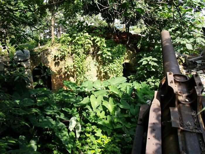 These works, built on heights, on the site of old small forts, are generally constructed on three superimposed levels, of special unreinforced concrete due to the shortage of reinforcing steel. The lower part constitutes the underground infrastructure, comprising power plant, barracks, magazines and command post. This level is connected by shafts to the intermediate level, consisting of a system of galleries and magazines, connected to machine-gun casemates, flanking a wall that surrounds and protects the summit. This wall, masonry or concrete, is 6 metres high and 4 metres thick at the base. The upper part consists of casemates, armed as the case may be with 95 mm guns on carriage Mle 1904, 90, 75 and 47 mm guns on carriage Mle 1916 or 25 and 37 mm anti-tank guns on field carriage. The embrasures are protected by diamond ditches and armoured shutters, and the soffits of the 1.70 metre thick slabs are reinforced with rails. Positions for mortars, and observatories, are also set up on the superstructures. The whole is protected by a barbed wire network, by an anti-tank rail barrier, and by locally manufactured mines. It is, in short, a Maginot work, minus the armoured elements. All these constructions required the excavation of 1,000,000 m³ of earthworks, 50,000 m³ of special concrete, 24,000 m³ of masonry for the galleries, and 80,000 m³ of external masonry. Unfortunately, no plan of these achievements has reached us. Unfinished, insufficiently armed and with too weak a garrison, they bore the full brunt of the Japanese assault on the night of 9-10 March 1945. Occupied by Chinese troops after the Japanese surrender, they were looted and their superstructures destroyed by explosives, before their departure in 1946, or by the Vietminh. The underground facilities of the works at Lang Son were later used by the French army to store equipment and ammunition. These were recovered intact by the Vietminh in October 1950, after the hasty retreat of Colonel Constans' troops following the fighting on RC4. It seems likely that a large proportion of the 105 mm shells fired on Dien Bien Phu four years later came from the stocks at Lang Son… We have only seen the works at Lang Son and Dong Dang, whose superstructures are now nothing but concrete chaos. The underground facilities of Fort Négrier are used by the Vietnamese army.
