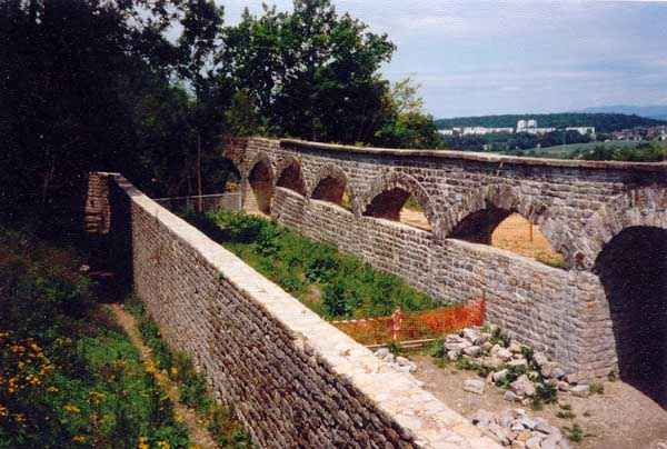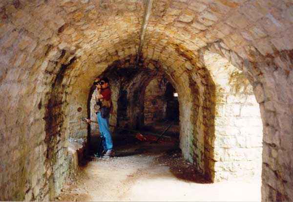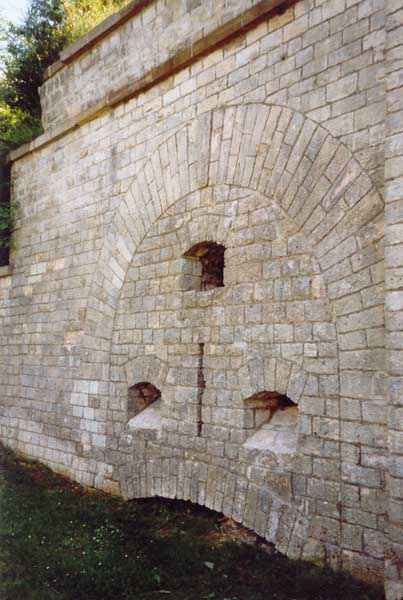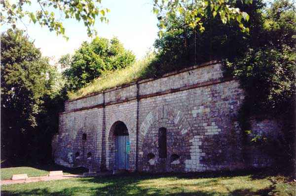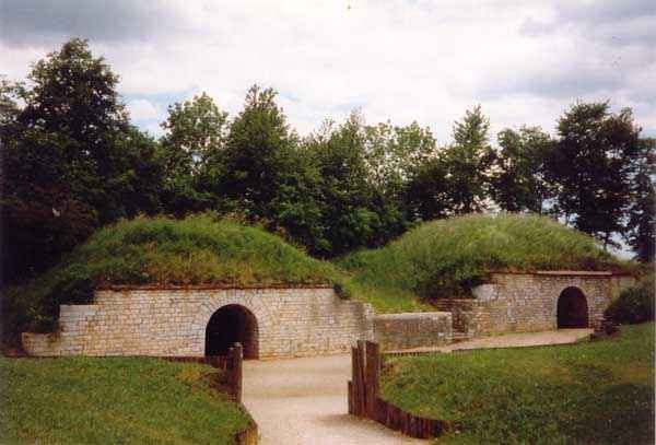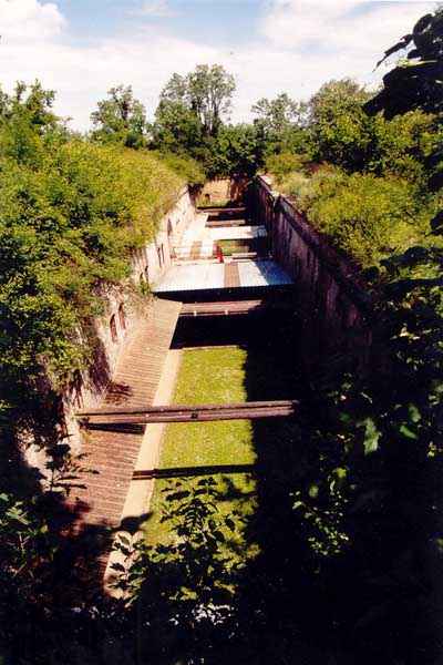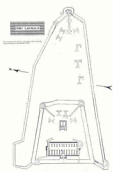 Fortress of Montbéliard, north of the town, 1876-1878. 406 m alt. 708 men (war garrison: 1,016 men) and 59 pieces including 16 for flanking. Named fort Razout. If it were not for a slight break in its head front, this fort would be a perfect trapezoid. This break (forming saliant III) nevertheless required attaching to saillants II and IV a double caponier, while the gorge was enfiladed from an aileron at saillant I. The ditches of the fort were connected, at the level of saillants I and V to the ditch of the envelope. To penetrate the perimeter of the latter, two bridges (drawbridges or demountable) passed over the ditch of the envelope sufficiently close to the axis of the gorge ditch to, if necessary, be taken under the fire of the aileron of saillant I. For this defensive organ, this implies that opposite its gun embrasures, rifle loopholes were made. Indeed, the distance to cover and the orientation taken by the ditch of the envelope would have rendered the presence of guns useless. The rest is a matter of semantics; aileron or double caponier? Let's opt for the second option. An almost identical caponier, with a long flanking escarp gallery, occupied the south-western angle of the ditch of the envelope. But let's return to the fort. We had visited it in June 1998. All the ditches of the reduit were filled, but that does not mean at all that the caponiers were razed. We could not enter, the places being closed and occupied by a shooting range of the police forces. The entrance tunnel, before emerging into the courtyard, passes between two rows of five quarters on two levels. The courtyard is a light well. Facing these ten bays on the ground floor (eleven on the first floor), are ten bays of stores on the ground floor for only nine on the first floor. Let's note this gap which places the quarters here with their back to the gorge, thus facing the head front. Under the right part of the barracks, two cisterns totalling 280 m³ had been dug. Their low capacity was compensated by the presence of two wells. There was also a bread oven for 220 rations. If one follows the main street, passing under the second floor of stores (and non-commissioned officers' and officers' lodgings), one emerged into a second courtyard facing an earth merlon flanked by lateral passages. These gave onto the two powder magazines built side by side without even being separated by a ventilation duct. A document indicates 76 tonnes in these magazines and 70 others in a cavern magazine! Such magazines exist at Mont-Bart, at Lomont and at the battery des Roches, but we must admit not being able to locate that of Lachaux because none of the consulted plans indicates a cavern magazine. The earth protecting these magazines formed a mass acting as a parados of the rampart street. This included hardly four traverse-shelters and the access ducts to the caponiers. These traverse-shelters were all placed very far forward, the rest of the perimeter consisting of an infantry parapet. Its important position, dominating Sochaux, placed it in the front line within the Belfort Gap. It was to prevent the Belfort Gap from being turned from the south and as a particular role prevent the crossing of the Savoureuse south of Belfort and the crossing of the Doubs at Audincourt. It is therefore not surprising that it attracted the attention of military officials. That being, the credits were slow in coming and it was only in 1913 that the modernisation works began. Our information is incomplete but we can put forward that three machine gun turrets were planned, two turrets for 75 Mle 05 and, probably in a battery implanted in the envelope, two turrets for 155 R. All that we can write is that a concreting of the ends of the barracks courtyard was planned. On the right of the courtyard, one of the 75 turrets would have taken place and a machine gun turret would have occupied the left of the courtyard. A second machine gun turret would have surmounted the entrance porch. These works were in progress in August 1914 and no armour will ever be installed. Today, one can only see of the reduit its entrance and its barracks. Everything that was located forward, powder magazines included is either levelled or buried. Nevertheless, the envelope, taking the shape of a very stretched triangle, is freely accessible and arranged as a public park. It would be a pity not to reach its point. Several of the six traverse-shelters near this point survive and have been restored, as well as the double caponier which defends at this place the extreme north-east of the envelope. This caponier possesses, in one of its flanking escarp galleries, a postern which was provided with a tipping door, as evidenced by the lifting pulleys. To the west, it is appropriate to note the presence of relieving arches in the counterscarp. Banal, you will think? Perhaps; but beyond a vertical setback of the ditch, the counterscarp remaining at the same level, two superimposed rows of arches can be seen and that is unique. This setback is occupied by a rare tunnel-caponier. This one no longer has a facade, so it is quite disconcerting at first. An underground duct connects the two caponiers. Sometimes spelled "La Chaux".