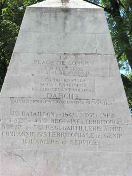 Sever departementu 54 (Meurthe-et-Moselle), pevnost Longwy. Památník obléhání 1914 připomíná události první světové války a hrdinnou obranu pevnosti proti německým jednotkám. Byl postaven na počátku 20. století na jednom z bastionů horního města a tvoří ho kamenný podstavec s deskou, na které jsou vyryta jména padlých důstojníků a vojáků. Umístění v srdci staré bastionové pevnosti zdůrazňuje strategický význam Longwy a jeho roli v systému opevnění děděném ze Séré de Rivières. Památník slouží jako místo paměti, historického vzdělávání a symbolický orientační bod pro posádku i místní obyvatelstvo.