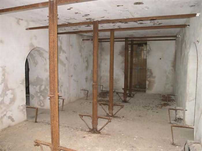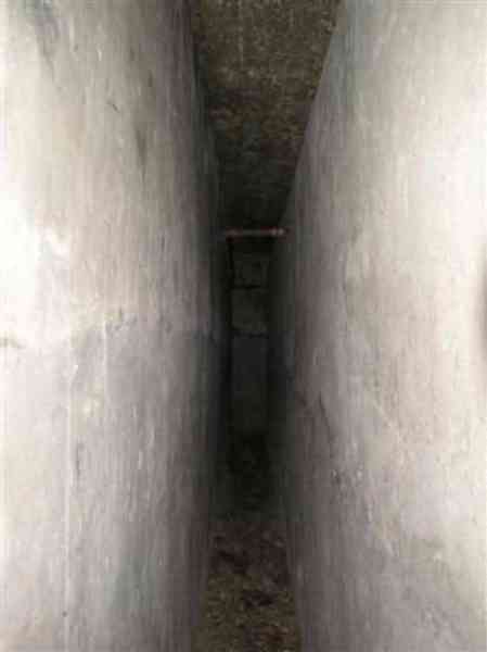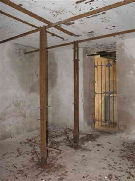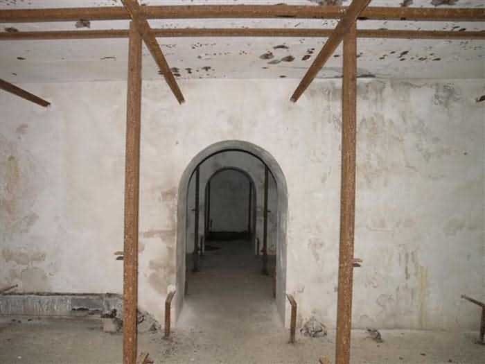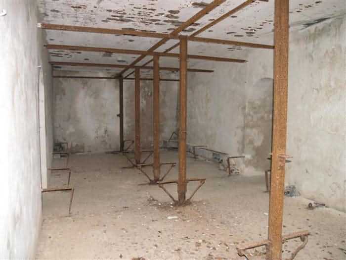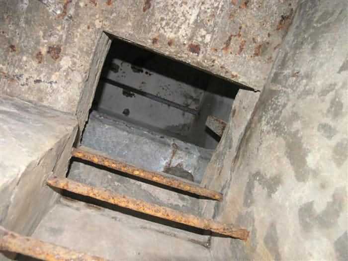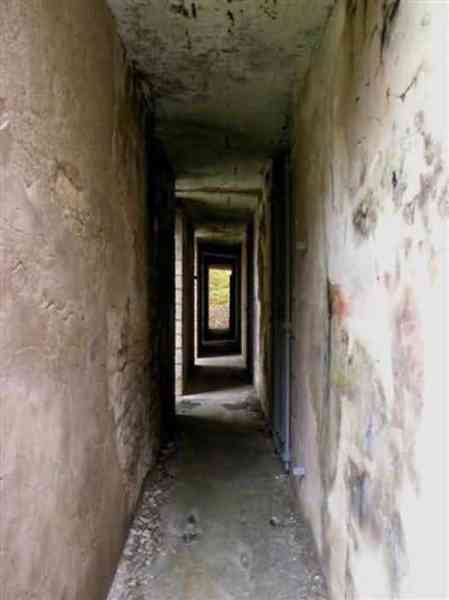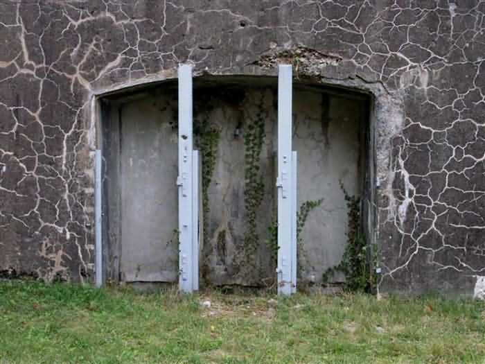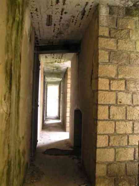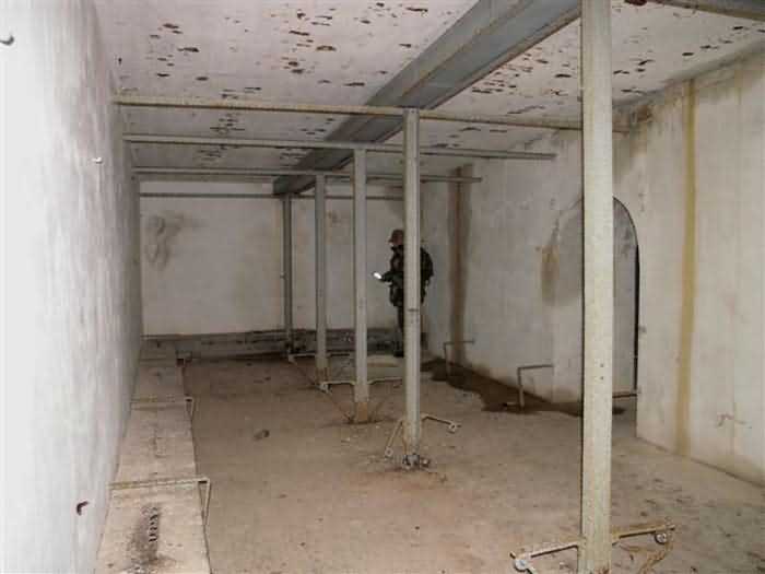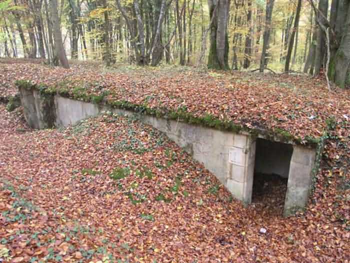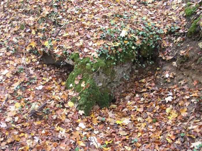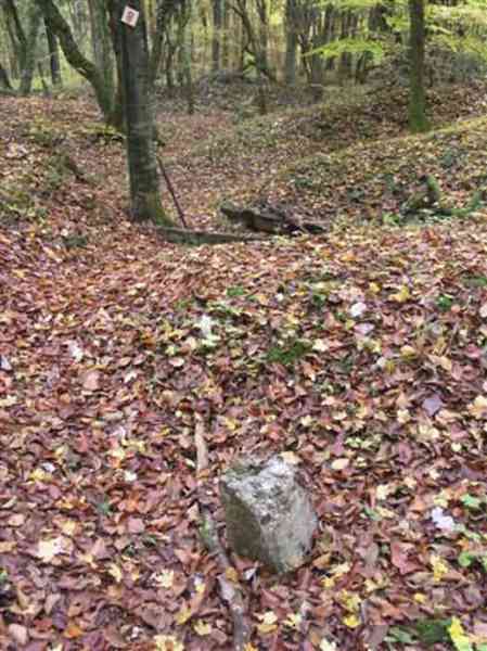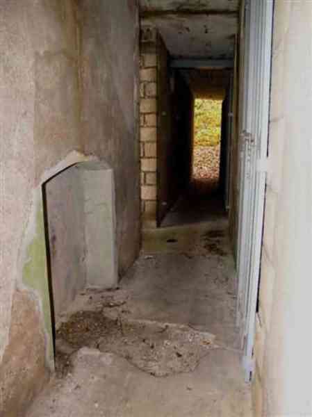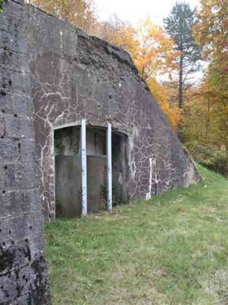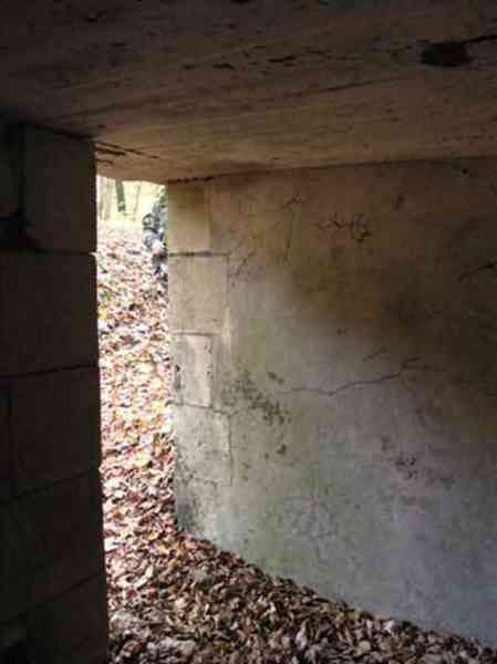 Verdun fortified camp, east-northeast of the city (range La Laufée - Moulainville - 1), 1905-1907, for a company. This range includes two combat shelters. This one is located a short distance to the left of the Mardi Gras battery. It suffered virtually no damage during the Battle of Verdun. Most of the metal pillars supporting the consoles of the men's benches are still there. Taking advantage of the fact that it is located on one of the walking paths that make up the battlefield, some of its metal parts have even been treated with anti-rust paint. In one of its four main rooms, one can access part of the underground cisterns via a trapdoor in the floor. These cisterns include two concrete sarcophagi (3.5 X 2 X 2 m - in accordance with the note of November 5, 1905) connected to each other and isolated from the surrounding walls by a passage about fifty centimeters wide, which, in the event of bombardment, would have isolated these containers from the vibrations of the neighboring walls. Part of the ventilation ducts is still in place. This shelter has its latrines in the right wing wall. A recent sign (10/2009) draws the visitor's attention to the danger of entering it. Provided basic rules of caution are observed, such as, for example, watching where one puts one's feet, it is open to all winds and, above all, free - or almost - of graffiti. For how much longer…? We should note the presence, between this shelter and the Mardi Gras battery, of an infantry entrenchment. This unusual one consists of a straight trench, neither masonry nor concreted, comprising in its center a small concrete shelter with two entrances, about ten meters long and with folding benches. At the left end of the trench, there is a small shelter, also concreted, for infantry ammunition. A remnant of a wooden door lies on the ground at the top of the small ramp which gave access to the right of the trench.