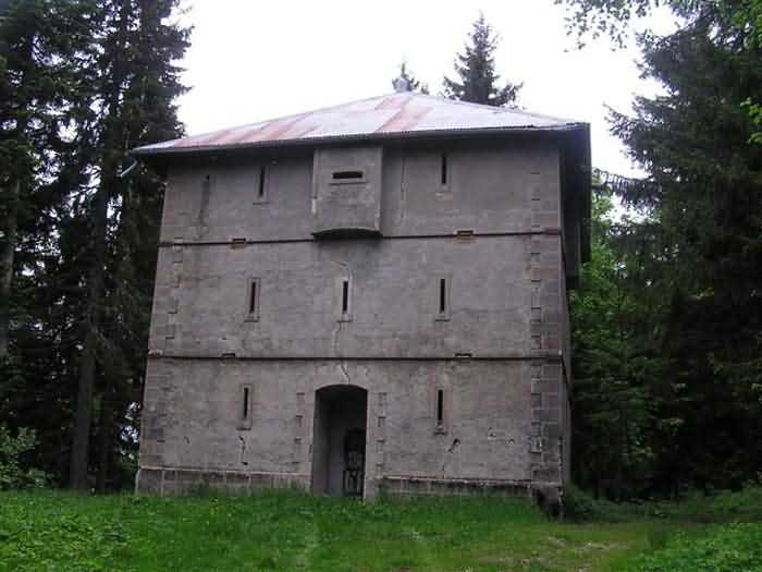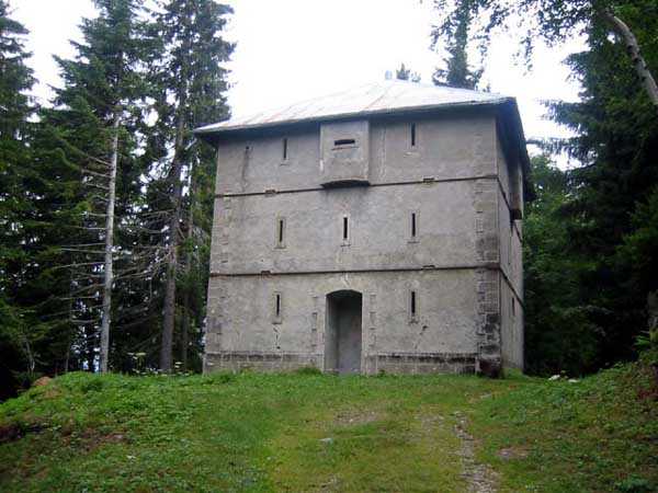 Fortress of Albertville, 4,000 m east of the city, 1883. 1361 m above sea level. Called blockhouse or Fort Perregaux. 1 officer, 33 men. Established 800 m east-north-east of Fort Mont, it prevented infiltrations via the heights on the left bank of the Beaufort valley, infiltrations that would attempt to reach Fort Mont from above (note in passing that the gun casemates of this fort are oriented in this direction). Located on a spur, at the foot of the Roche Pourrie (2,037 m), it enjoys plunging views over the exits of the Beaufortin which it dominates by 1000 m. The work is a blockhouse of 10 x 9 m with a wall thickness of 50 cm, comprising three floors. Entry is through a door opening in the south facade and protected by a haha. The ground floor, crenellated on all sides, is occupied in its centre by a troop quarter flanked on either side by two rooms forming abutments. It is in the basement of one of them, in the south-east corner, that the cistern (estimated capacity 5 m³) is installed, fed by rainwater recovery. A turning staircase gives access to the floor, a staircase beneath which are two toilets from which a baffled ventilation duct departs for odour evacuation. The first floor is identical; with the difference that there is no haha here, no cistern, and no toilets. The second floor, accessible by a trapdoor, constitutes the former open terrace. In addition to the vertical rifle embrasures are four machicolations placed in the centre of each facade, thus sweeping the foot of the work. The floor is waterproofed by a layer of tar, it slopes to lead the water towards the two collectors feeding the cistern. The work is now sheltered from the weather by a light roof. Preserved and maintained until 1940, the work will never see combat. Abandoned after the war, it was restored in the 1970s to serve as a refuge for hikers, similar to the blockhouse of the Têtes. Like the latter, the Laitelet blockhouse presents numerous cracks in its facades, cracks fitted with witness marks. Unfortunately, the cracks tend to enlarge year by year, to such an extent that one may fear the blockhouse will open like an oyster, despite the reinforcement of metal tie rods. Today (06/2008), its door is walled up and only the exteriors are freely accessible. Sometimes spelled "l'Aitelet".