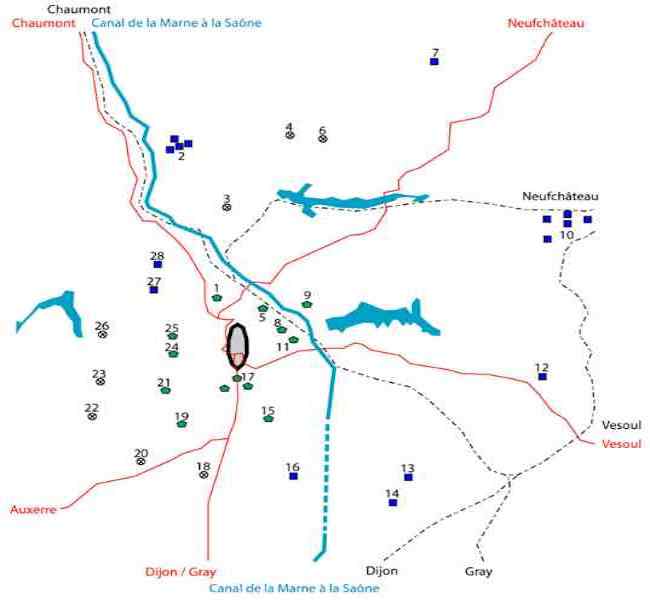 Dept 52 (Haute-Marne). Met een reduit gevormd door een citadel gebouwd tussen 1842 en 1850, trok de vestingplaats Langres bijzonder de aandacht, en dit reeds vanaf 1874. Zijn positie aan het einde van de engte van de bres van Charmes maakte er de stootblok van dat vijandige legers verplicht zouden zijn geweest te komen stoten. Vandaar, in tegenstelling tot andere plaatsen van de tweede lijn zoals Reims, Dijon of Grenoble, zijn de forten, behalve Montlandon later gebouwd, er ietwat buiten norm. Deze die de betrokken stootblok vormen, Dampierre en Plesnoy, behoren tot de meest spectaculaire van het land, wijzend op zich alleen bijna tweehonderd kanonnen. Zeer zeldzaam elders, zelfs in Parijs, worden 100-ton kruidmagazijnen teruggevonden in de helft van de acht forten van de plaats. De forten van La Bonnelle en Peigney, begonnen voor 1870 en hervormd zo goed als kwaad volgens de polygone tracé vormen authentieke curiositeiten biedend, vooral La Bonnelle met zijn bedekte courtines, spectaculaire perspectieven. Na de crisis van de granaattorpedo richtte men nog slechts enkele kleine infanteriewerken in evenals negen magazijnen uitgegraven onder de rots. Het geheel van het verschanste kamp telt acht forten, zeven batterijen (waarvan vier annexen van het fort Plesnoy), acht werken, drie tijdens de Frans-Duitse Oorlog 1870-1871 aangelegde en nauwelijks heraangelegde emplacementen evenals vijf andere kruidmagazijnen binnen de omsluiting van de citadel. De infanteriewerken zijn heel specifiek van het lokale chefschap. Van ovale vorm, omvatten ze een ondergrondse kazernering toegankelijk door gebetonde zij-ingangen. Deze ingangen vertonen naast de trap een vlak oppervlak dat geschikt zou kunnen zijn om een licht artilleriestuk te herbergen. De aanwezigheid van hellingen tegenover deze ingangen schijnt deze hypothese te bevestigen. Inderdaad, als het slechts om infanterie ging, zou het heel interessant zijn ze te laten circuleren in smalle loopgraven voorzien van trappen voor toegang tot de parapetten en niet binnen een wijs manoeuvreergebied zoals het geval is. De parapetten, niet bekleed, zijn opmerkelijk ver van de toegangsloopgraaf (dus van het parados) en bereikbaar via sterk hellende vlakken wat de mogelijke aanwezigheid van een of twee lichte stukken om de aanvalsfront te weerstaan schijnt te bevestigen. Het moet echter erkend worden dat geen lokaal specifiek als artilleriemagazijn ingericht werd. Andere bijzonderheid van de plaats, de flankeringsgalerijen van de facen van de caponnières in de forten werden gebetonneerd en voorzien van goulottes voor granaten (diameter 15 cm). Plaats voor manoeuvre volgens de plannen van het veldleger, werden wijde ruimten voorzien voor het kamperen van talrijke troepen en, unieke zaak, vier zogenaamde "strategische" putten werden geslagen om in de waterbehoeften van deze troepen te voorzien. Langres biedt vele andere interesses in het domein van de militaire architectuur: zijn wallen, de Porte des Moulins, de torens Navarre, Orval, Piquante, Petit-Sault of ook Saint-Jean, omgevormd tot militaire duiventil na 1870, zijn zonder twijfel de omweg waard. Het is toe te voegen de superb lunet 10 momenteel (10/2007) in restauratie. Langres is dus een plaats van eerste belang; voor zover de lezer ons een oordeel toestaat –noodzakelijkerwijs subjectief–, onafhankelijk van minder spectaculaire landschappen dan in gebergte of in kustzone, aarzelen we niet te bevestigen dat de forten van Langres behoren tot de mooiste en interessantste van het land. Enkel de forten van het gordijn van de Maas zijn hun superieur inzake kwaliteit van metselwerk. Tenslotte, element niet te verwaarlozen, het is de enige stad van Frankrijk waar het toerismebureau u doeltreffend kan gidsen en adviseren over deze afzonderlijke forten die elders superb genegeerd worden (behalve de grote toeristische brokken zoals Douaumont, Vaux en La Pompelle).