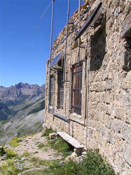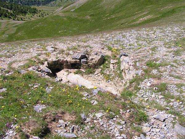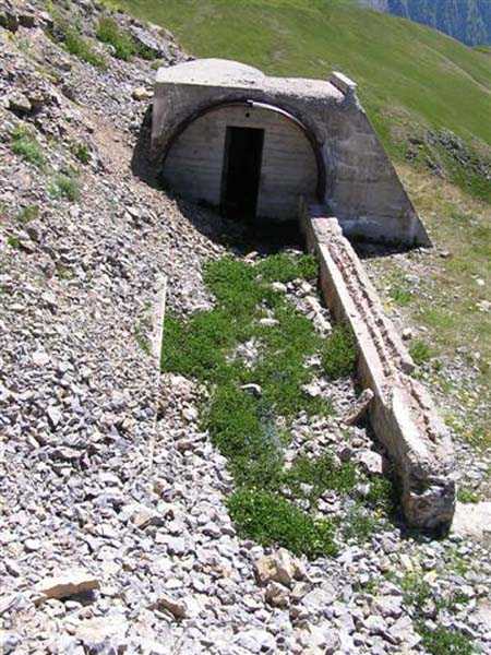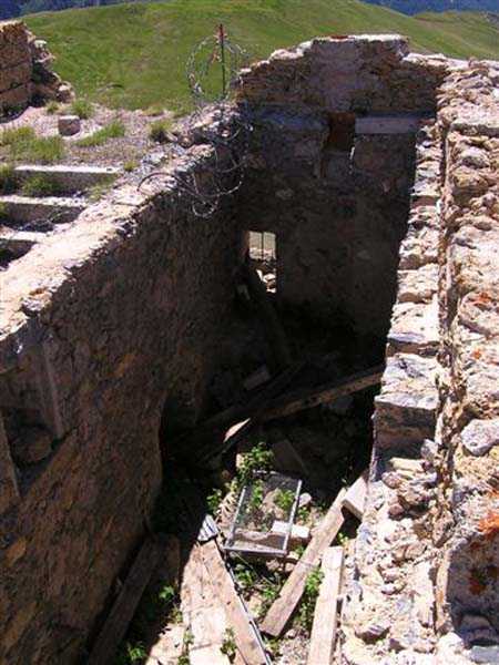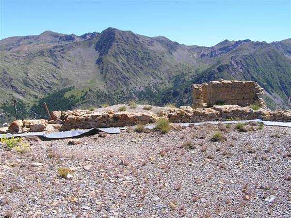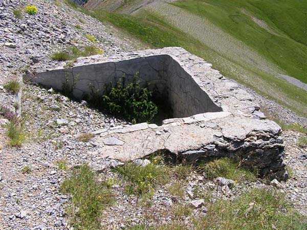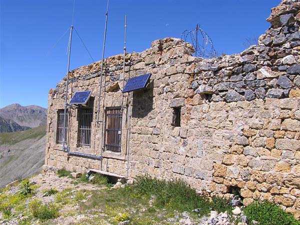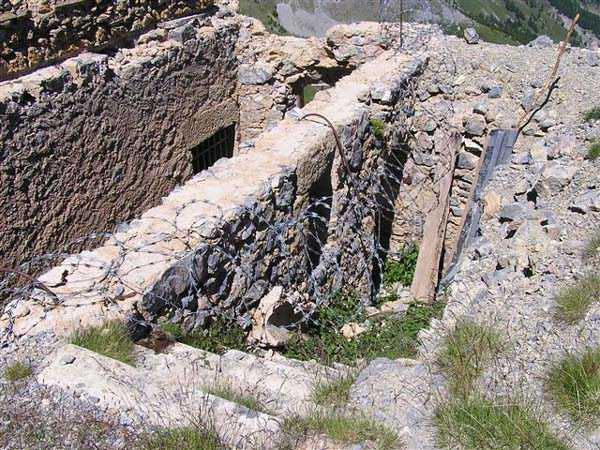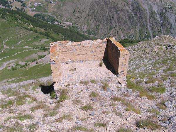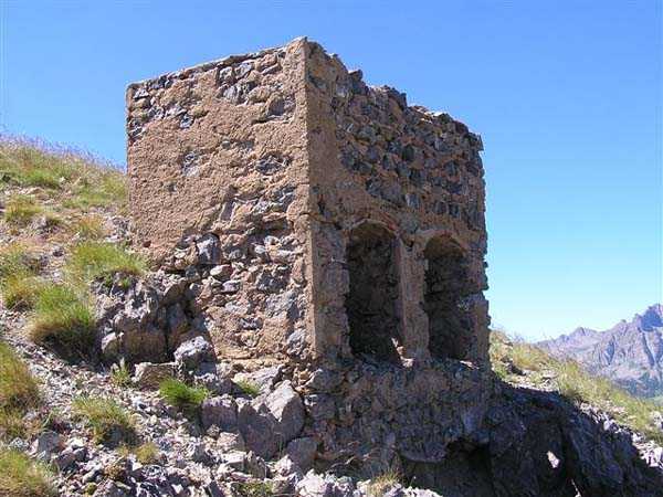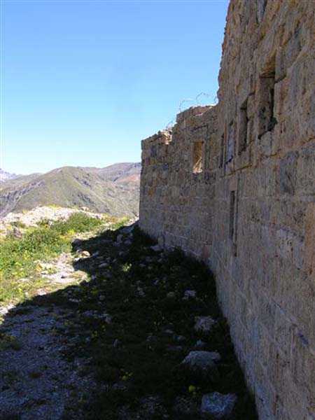 South-east of the fortress of Tournoux, 1902-1903. 2384 m/alt. Established at the summit of Mont Vinaigre, hence its other name "battery of Tête de Vinaigre" –although no gun emplacement is detectable in situ, nor moreover does the building seem to include an artillery magazine - it monitored the sources of the Tinée. It is a monoblock structure, with approximate dimensions of 12 x 8 m, comprising two chambers, a kitchen and a magazine, all for 25 men. The north wall is crenellated. It occupies such a position that optical communications were possible towards the neighboring works which are the blockhouse of Mont des Fourches and the small fort of Pelousette. The side exposed to north-east is protected by a massif of rocky debris. The roof was an arranged terrace from where the views were remarkable. In his monumental work "La barrière de fer" (see bibliography), Lieutenant-Colonel Truttmann mentions there the presence of a remnant of a Choumara stove. Today (07/2007), nothing more is visible of it therefore, either it was destroyed during the recent establishment of a radio relay, or, more probably, it lies under a heap of rubble in the rear corridor. We will note the presence, aside, of latrines having the particularity of being placed on the expected side of attack…; as well as the outline of an alpine shelter called "abri Adrian" dating from 1939 and located on the reverse slope 100 m below the blockhouse on the south slope. The windows and doors of the blockhouse are now provided with bars. It deteriorates little by little through the winters.