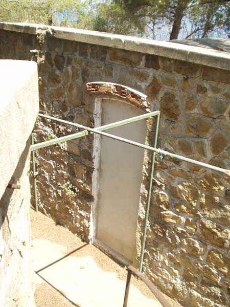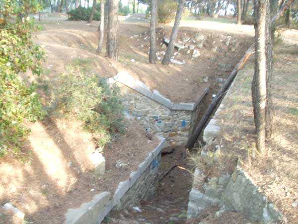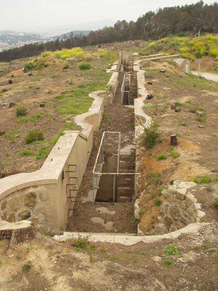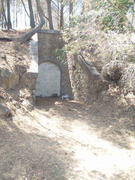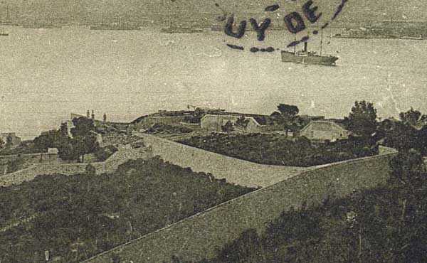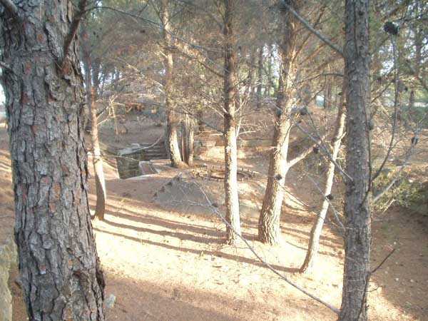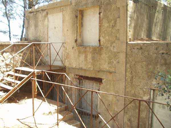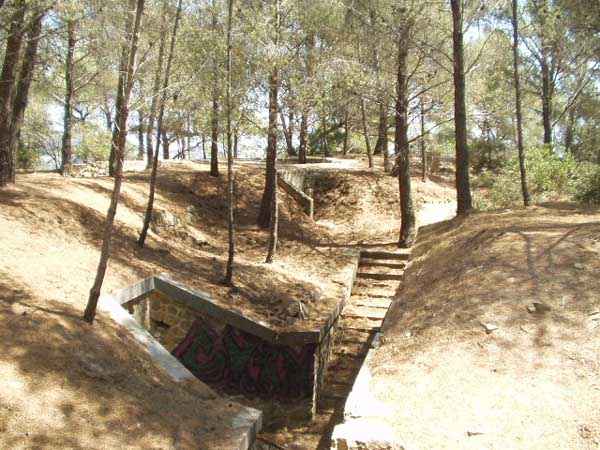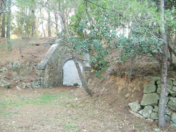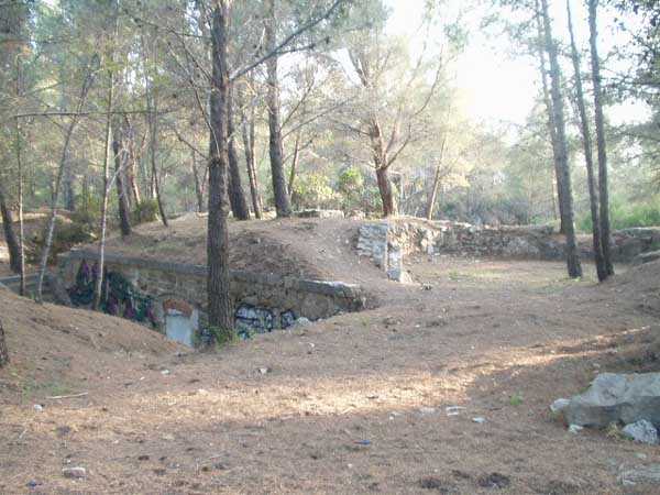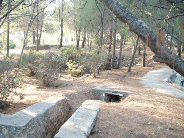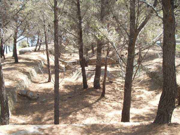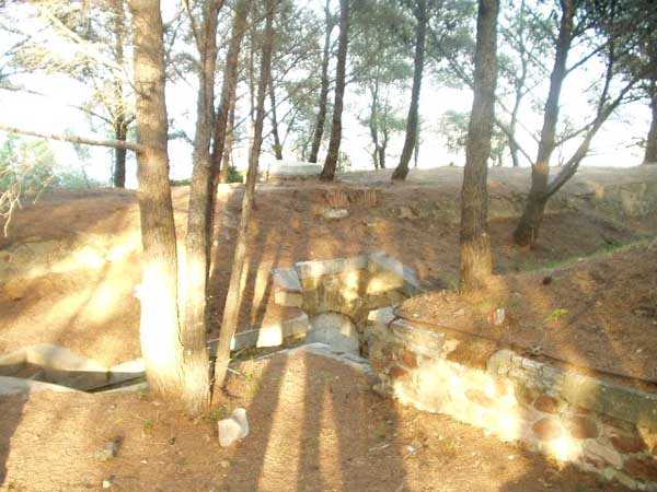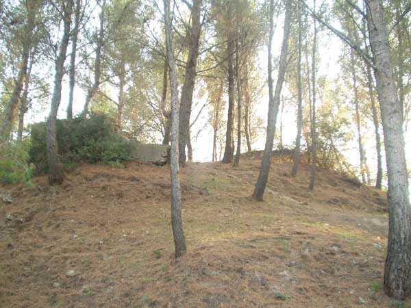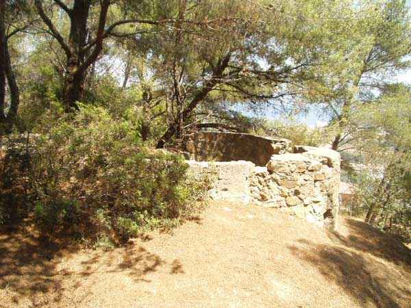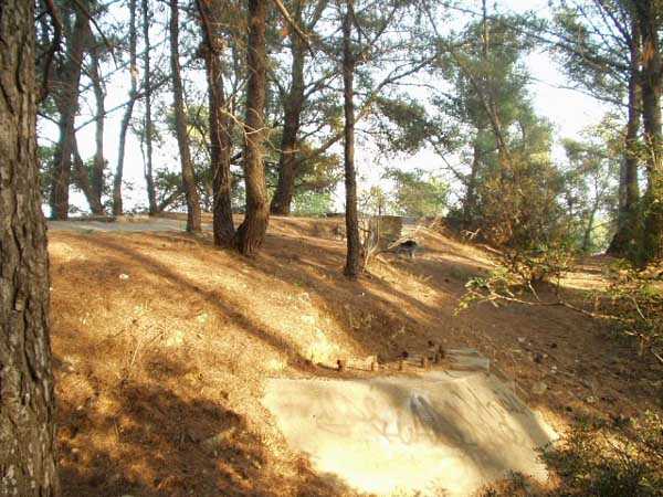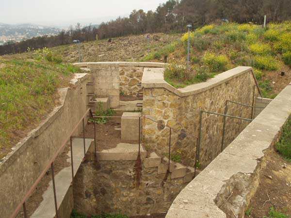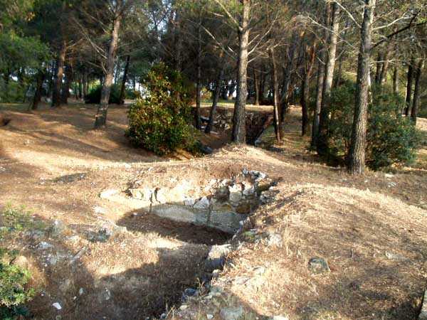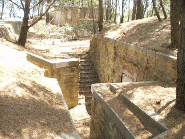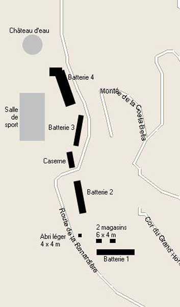 Fortress of Toulon, south of the city. 106 m/alt. Peninsula of Saint-Mandrier, west of the Creux Saint-Georges. The position was occupied from 1861 and armed in 1869. Reorganized in 1880-1882, it then appeared as two batteries with dual capability, firing at will either to the open sea or to the roadstead. A source mentions there 4 guns 24 c and 4 others 19 c. The guns, on P.C. carriage, are separated by hollow traverses connected to the north by a long concreted and buried magazine. The two batteries, seen from the sky, are arranged along a northwest-southeast axis and are slightly offset. Between the two batteries, a small barracks with three bays was built, opening onto a courtyard which has access to each of the batteries. Opposite the barracks is a powder magazine, probably of the Mle 1879. In 1901-1902, between the barracks and the southeast battery, a battery for 4 guns of 95 mm was set up, also with dual capability. Let us note that there is no defensive perimeter here. The two outer batteries will receive in the Interwar period guns of 164.7 mm. The northwest battery would suffer from the bombardments of 1944. In August 2005, a fire came to lick the roof of the (inhabited) barracks, which miraculously escaped the worst. This fire spared the pine forests of the two outer batteries, but completely cleared the vegetation from the 95 mm battery. The whole is sometimes cited under the generic term "batteries of the Lazaret". Very interesting ensemble and, except for the barracks and the powder magazine, freely accessible (04/2006). The geographical coordinates above indicate the location of the northwest battery.