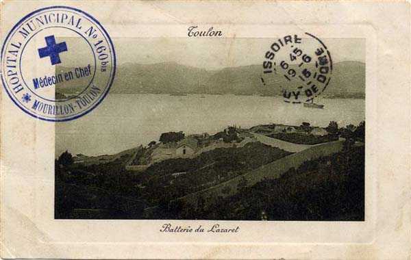 Pevnost Toulon, jih města. 106 m/n.m. Poloostrov Saint-Mandrier, na západ od Creux Saint-Georges. Pozice byla obsazena od roku 1861 a vyzbrojena roku 1869. Reorganizována v letech 1880-1882, objevila se od té doby jako dvě baterie s dvojím odměrem, ostřelující dle vůle buď volné moře, nebo rejdu. Pramen tam zmiňuje 4 děla 24 c a 4 další 19 c. Děla, na P.C. lafetě, jsou oddělena dutými traversami spojenými na severu dlouhým betonovaným a zahrabaným skladem. Dvě baterie, pohleděno z nebe, jsou uspořádány podél severozápad-jihovýchod osy a jsou lehce odsazeny. Mezi dvěma bateriemi byla postavena malá kasárna se třemi poli, vycházející na dvůr, který má přístup ke každé z baterií. Naproti kasárnám se nachází prachový sklad, pravděpodobně Mle 1879. Roku 1901-1902, mezi kasárnami a jihovýchodní baterií, bylo zřízeno baterie pro 4 děla 95 mm, také s dvojím odměrem. Poznamenejme, že zde není žádný obranný obvod. Dvě vnější baterie obdrží v meziválečném období děla 164,7 mm. Severozápadní baterie bude trpět bombardováním roku 1944. V srpnu 2005 přišel oheň olíznout střechu (obývaných) kasáren, který zázrakem unikl nejhoršímu. Tento oheň ušetřil borové lesy dvou vnějších baterií, ale úplně odhalil vegetaci baterie 95 mm. Celek je někdy citován pod generickým termínem "baterie Lazaretu". Velmi zajímavý soubor a, kromě kasáren a prachového skladu, volně přístupný (04/2006). Výše uvedené zeměpisné souřadnice udávají umístění severozápadní baterie.