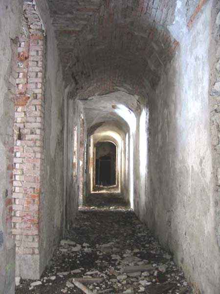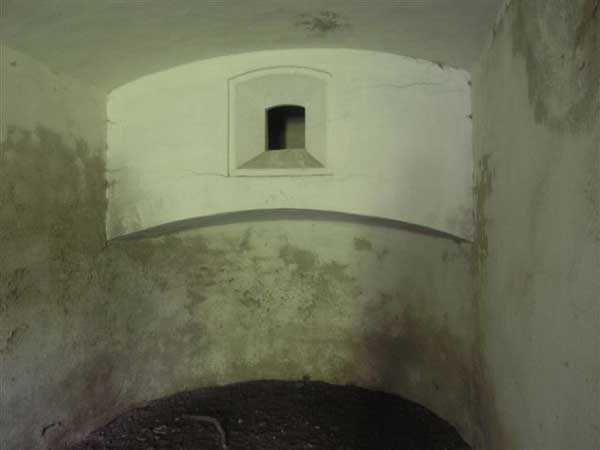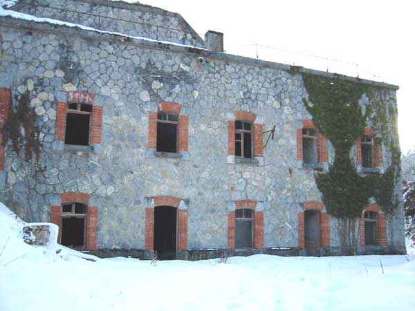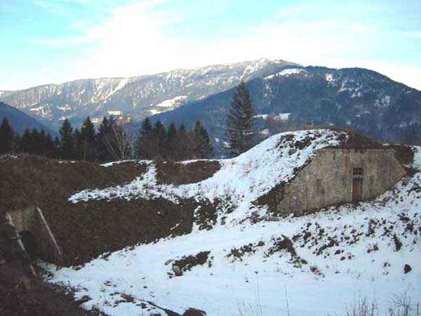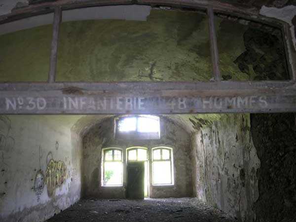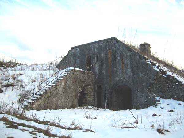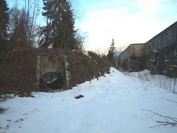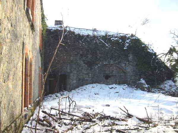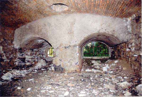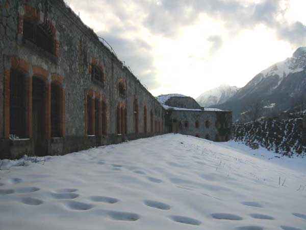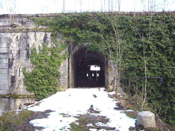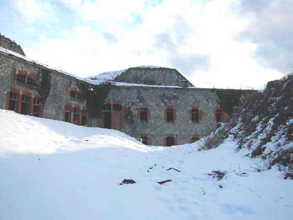 Fortress of Albertville, north of the city, 1875-1881. 790 m/alt. 603 men, 40 guns including 6 mortars and 8 flanking guns. Named Fort Épernon. Barrier fort, with cavalier, dominating the town of Ugine, itself located at the confluence of the Arly and the Chaise. Two of the five fronts possess a curtain wall, including the head front defended by two small coffers whose access shaft opens into the circulation corridor behind the quarters. The counterscarp of this sole head front is in relieving arches, arches whose hollows are more pronounced at the level of the curtain wall. The perimeter is defended by a double caponier, two flanking walls and two scarp galleries. All these defensive organs have two storeys of fire except for the coffers of the curtain wall of front III-IV. The entrance possessed a drawbridge with bascule underneath and assisted movement. A first barracks is located in the hollow of the gorge curtain wall, but slightly set back so as to leave two small courtyards on its fronts. Once past the entrance porch, on the left is a room, a powder magazine or rather a loading workshop whose vault is situated very high and fitted with two shutters which must have been quite complicated to operate given their high position. A traverse shelter surmounts this room and a lamp embrasure was fitted in the flank of this traverse to illuminate, very weakly, the immense room. The large central courtyard has a steep slope and it must not have been convenient to hold exercises or even simple gatherings there. As in the other forts of the place, the walls are built in rubble masonry, but the outlines of the doors and windows are in baked clay bricks. This association makes this fort quite pretty and the numerous remains of fittings with markings are an additional attraction. Two powder magazines are joined along their length, but the one on the right, although in every way identical to its neighbor, was annotated: magazine for fabricated ammunition. They both possess three lamp embrasures, the central one being situated higher than its neighbors. A capacity of 70 tons of powder was required for this fort. Very curiously, a room (± 8 x 3 m) whose function escapes us is accessible only through the lamp room, which room has retained its wooden floor. Three of the traverse shelters of the artillery cavalier were connected to the rear of the barracks and the artillery magazines by stairs and, for the central traverse, by a hoist stripped to the last bolt. Another peculiarity, the traverse shelter of the south front has a trapdoor in the floor of its abutment. This trapdoor gives access to a lamp embrasure which illuminates a small magazine located under the said traverse. Finally, the officers' latrines should delight enthusiasts of the genre with their seats, but especially with their singular pump flush system of which interesting vestiges remain. For the photographer, this fort offers beautiful possibilities for shots with very interesting light effects (to visit in fine weather in the afternoon). Sometimes spelled "l'Estal" and even "Lestale". General good condition. Private property, but abandoned (06/2006).