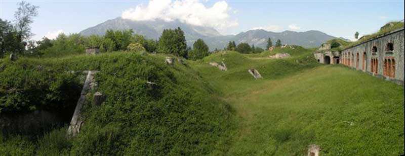 Festung von Albertville, nördlich der Stadt, 1875-1881. 790 M/ü M. 603 Mann, 40 Geschütze, darunter 6 Mörser und 8 Flankierungsgeschütze. Bezeichnet als Fort Épernon. Sperrfort mit Kavalier, das die Stadt Ugine beherrscht, die selbst am Zusammenfluss von Arly und Chaise liegt. Zwei der fünf Fronten besitzen eine Kurtine, darunter die Stirnfront, die durch zwei kleine Grabenwehren verteidigt wird, deren Zugangsschacht sich im Umlaufkorridor hinter den Stuben öffnet. Die Kontereskarpe dieser einzigen Stirnfront besteht aus Entlastungsbögen, Bögen, deren Mulden auf Höhe der Kurtine ausgeprägter sind. Der Umfang wird durch eine Doppelkaponniere, zwei Flügelmauern und zwei Eskarpengalerien verteidigt. Alle diese Verteidigungsorgane besitzen zwei Feueretagen mit Ausnahme der Grabenwehren der Kurtine der Front III-IV. Der Eingang besaß eine Zugbrücke mit unterer Kippe und unterstützter Bewegung. Eine erste Unterkunft befindet sich in der Mulde der Kehlkurtine, aber leicht zurückgesetzt, um auf ihrer Vorderseite zwei kleine Höfe zu belassen. Einmal durch das Eingangsportal gegangen, befindet sich links ein Raum, ein Pulvermagazin oder eher ein Ladeatelier, dessen Gewölbe sehr hoch liegt und mit zwei Luken versehen ist, die aufgrund ihrer hohen Lage schwer zu bedienen gewesen sein dürften. Ein Traversenunterstand überragt diesen Raum und eine Lampenscharte war in der Flanke dieser Traverse angebracht, um den riesigen Raum sehr schwach zu beleuchten. Der große zentrale Hof weist eine starke Neigung auf und es dürfte nicht bequem gewesen sein, dort Übungen oder sogar einfache Versammlungen abzuhalten. Wie in den anderen Forts der Festung sind die Wände in Bruchsteinmauerwerk errichtet, aber die Umrisse der Türen und Fenster sind aus gebrannten Ziegeln. Diese Kombination macht das Fort recht hübsch und die zahlreichen Überreste von Beschlägen mit Markierungen sind ein zusätzlicher Reiz. Zwei Pulvermagazine sind an ihrer Länge aneinandergereiht, aber das rechte, obwohl in jeder Hinsicht identisch mit seinem Nachbarn, war mit der Anmerkung versehen: Magazin für gefertigte Munition. Beide besitzen drei Lampenscharten, wobei die mittlere höher liegt als ihre Nachbarn. Eine Kapazität von 70 Tonnen Pulver war für dieses Fort erforderlich. Sehr seltsamerweise ist ein Raum (± 8 x 3 m), dessen Funktion uns entgeht, nur über die Lampenkammer zugänglich, welche Kammer ihren Holzboden bewahrt hat. Drei der Traversenunterstände des Artillerie-Kavaliers waren mit der Rückseite der Unterkunft und der Artilleriemagazine durch Treppen verbunden und, für die zentrale Traverse, durch einen Aufzug, der bis zur letzten Schraube ausgeschlachtet war. Eine weitere Besonderheit: Der Traversenunterstand der Südfront hat eine Falltür im Boden ihres Widerlagers. Diese Falltür gibt Zugang zu einer Lampenscharte, die ein kleines Magazin unter besagter Traverse beleuchtet. Schließlich sollten die Latrinen der Offiziere Liebhaber der Art mit ihren Sitzen erfreuen, aber vor allem mit ihrem eigenartigen Pumpenspülsystem, von dem interessante Überreste bestehen. Für den Fotografen bietet dieses Fort schöne Möglichkeiten für Aufnahmen mit sehr interessanten Lichteffekten (bei schönem Wetter nachmittags zu besuchen). Manchmal "l'Estal" und sogar "Lestale" geschrieben. Allgemein guter Zustand. Privatbesitz, aber verlassen (06/2006).