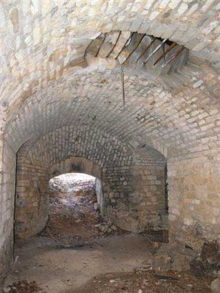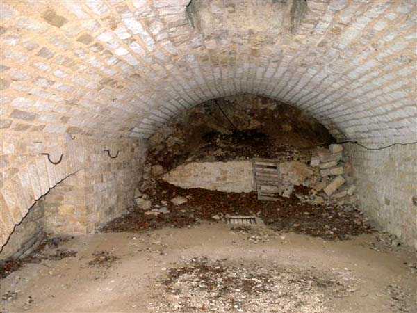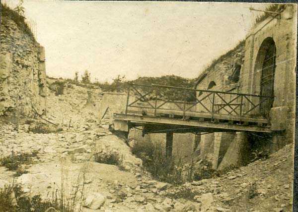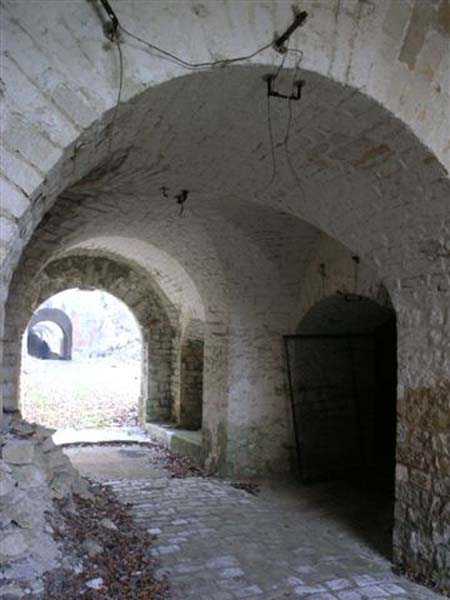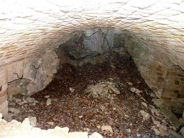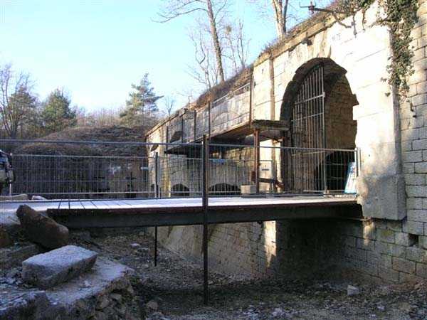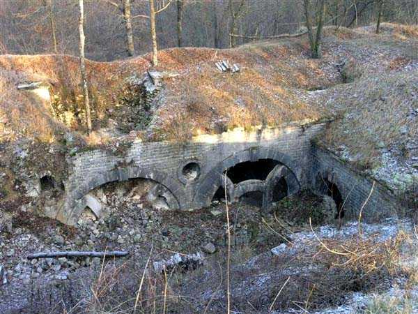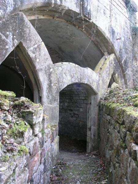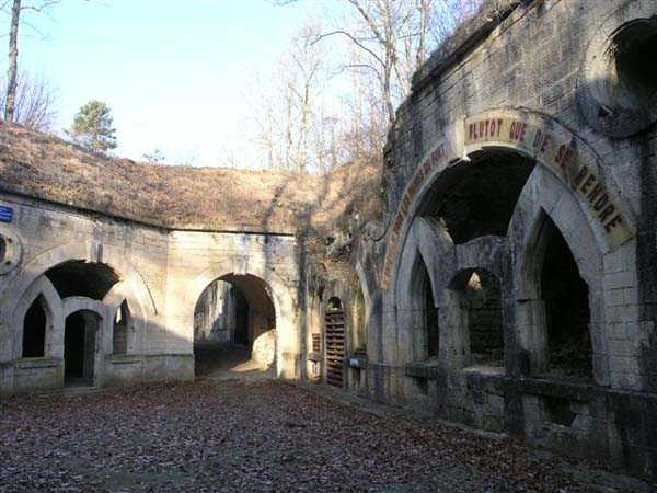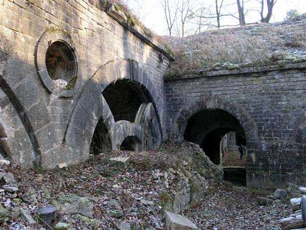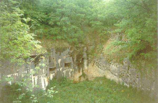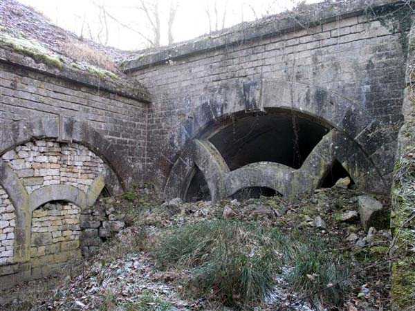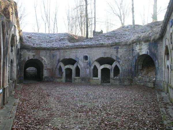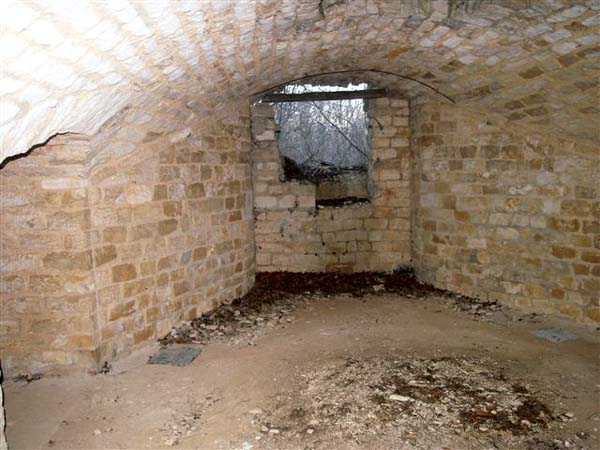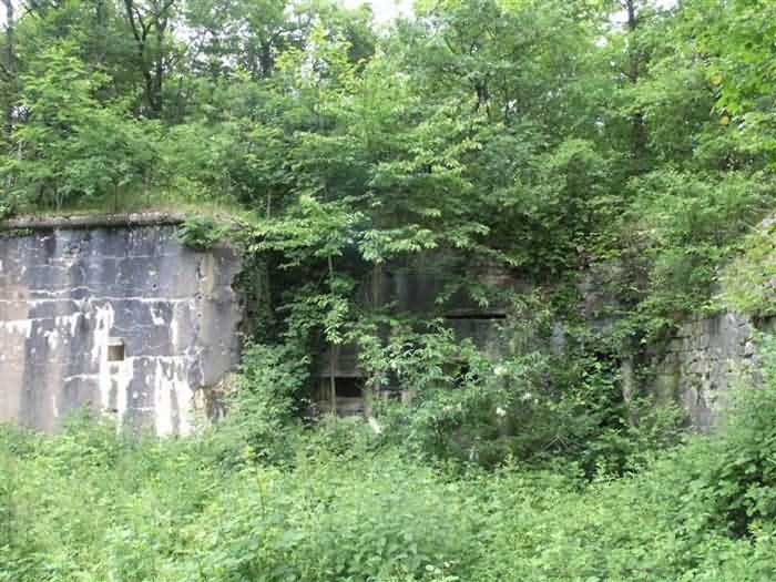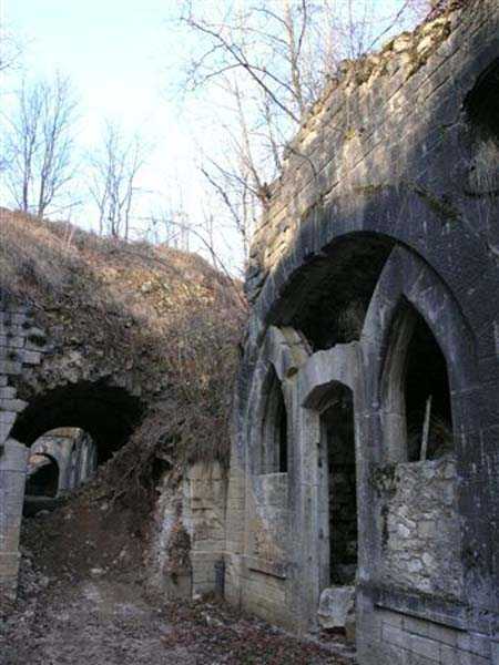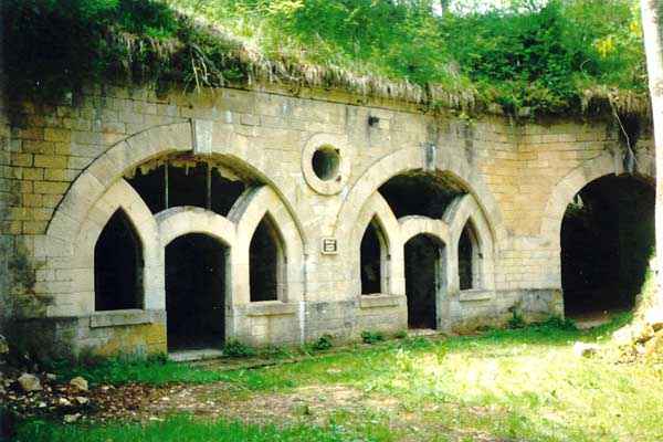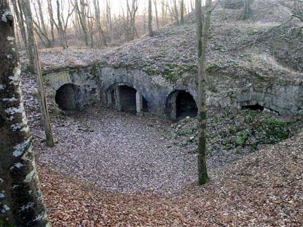 Defensive curtain of the Hauts de Meuse, 1876-1878. 380 m/alt. Called fort Stengel. 719 men and 45 guns including two under Mougin Mle 1876 turret. With its all-round missions, one would rather expect to find here a typical stopping fort, square in shape. Indeed, it dominates the Woëvre plain beyond which the enemy was sharpening its weapons. A hundred meters below, to the north, the Marbotte pass constituted a dangerous gap in the natural barrier of the Hauts de Meuse. To the south and 130 m below, another gap, that of Lérouville, where economic pressures finally overcame the categorical refusal of the military to run a railway line, had to be defended. Finally, to the west, the railway junction of Lérouville (a little over 7000 m away) and several bridges over the Meuse required surveillance and protection. Thus, against all expectations, a trapezoidal fort was to be built on this important height; a trapezoid with a curtain wall on its largest front. Usually, this largest front constitutes the gorge; here, it faces Germany. The gorge, determined by the presence of the entrance to the fort, will be the small southern flank of the structure, while the head of the trapezoid faces the Meuse. This singularity will condition the development of the fort and make it one of the most atypical of the entire Séré de Rivières system. Let's start with the perimeter defense. The flanking organs of the ditch, a wing at salient I and a double caponier at salient II face the Woëvre, and are therefore likely to be hit even by guns whose direct fire would take advantage of the length of the ditches to strike their embrasures. These organs are arranged as if the main attack were expected from the rear, that is, from the Meuse side. The base of the trapezoid, for its part, seems devoid of any defense, especially since the escarpment appears attached. It seems absurd, if not impossible, to leave this ditch unflanked. The flanks of the curtain wall of this front III-IV are also dominated by what one of the plans consulted determines to be indirect fire casemates, namely one close to salient III directed towards the Lérouville gap and two on the side of salient IV on the village of Saint-Agnant-sous-les-Côtes. In our opinion, this plan is erroneous and is nothing other than a crossfire defense identical to the initial one at the neighboring fort, Gironville, a defense carried out from the front of casemates serving as gun shelters. Unfortunately, the fighting of 1914 practically destroyed these three casemates, of which only the vaults of two are still visible. This being the case, their use as indirect fire casemates would probably have been possible. Despite everything, this profusion of such casemates seems to us all the more incongruous since the technical sheet of the Engineers, established on October 13, 1880, only lists two guns to arm them. An armament proposal for 1909 nevertheless recommends four 22 c smoothbore mortars and four others of 15 c smoothbore (or even, instead, six 15 c) but there is no indication that they were used from these casemates. Since we are discussing the perimeter, it should be noted that all the plans that have come down to us determine the southeast corner of the fort as salient I. For our part, we remain faithful to the principle of numbering in a clockwise direction from the salient closest to the left of the fort entrance. Thus, "our" salient I corresponds to salient II on the plans. The guns are arranged along the different fronts, but only front I-II has a real rampart street. The latter served nine sheltered traverses, four of which were entrenched. These are on two levels. Such a proportion of entrenched traverses clearly demonstrates that people expected to receive shots from all sides. Facing the Woëvre, three sheltered traverses framed four firing platforms at salient IV and, above the curtain wall, we find two pairs of direct-fire casemates. The short sides, responsible for defending the gaps, are each equipped with an indirect fire casemate (always according to the same plan) and two shelter traverses facing south and three facing north. Almost in the extension of the entrance tunnel, two indirect fire casemates (real ones!), aimed at the hamlet of Marbotte are attached. The center of the fort, along its length, comprises four parallel axes. From left to right when facing the entrance, we have the rampart street of front I-II, bordered on its right by the extension of the entrance tunnel, an extension materialized by four long rooted passages, the last of which opens near the descent shaft to the double caponier. Then, practically along the large median of the fort, a completely covered gallery connects the two indirect fire casemates (?) on the small flanks alongside two powder magazines (for a total capacity of 143,000 kg), the barracks, the bakery, the kitchens and access to the optical communications post. Finally, a last axis runs through the four courtyards of the barracks, ending up abutting a shelter traverse of font III-IV. Three of these courtyards are triangular. These are numbers 1, 3 and 4 or, according to plans, 1, 3 and 5. Indeed, a series of barracks planned between the two northern triangular courtyards seems never to have been realized and the courtyard to precede it, being only embryonic, is counted or not. In fact, at the 1914 mobilization, the housing capacity, deficit, will force to send part of the garrison to go to the neighboring forts. These courtyards were thought to be light wells with a blackout device, but this is not the case. The barrel vaults of the barracks are highlighted on the facade by an arch of cut stone. The builders had the good taste to adorn these facades with pointed arch windows, giving the place a Gothic cloister atmosphere. By chance, on Sundays in August and September 1914, masses were celebrated there. In addition to the eminently aesthetic aspect of the thing, it should be noted that this option is uni