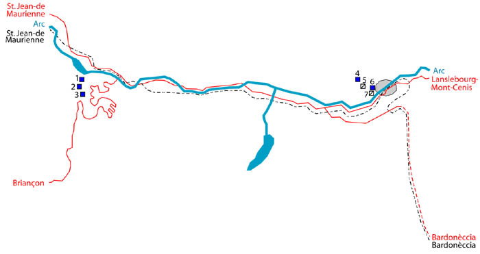 Dept 73 (Savoie). De grotere plaats Modane ligt verscholen in de bocht van de vallei van de Arc, een verplichte doorgang voor wie van de Col du Mont-Cenis komt. Direct stroomafwaarts bevinden zich de forten Sapey (+ zijn redoute) en Replaton, en stroomopwaarts verrijst de barrière van Esseillon met haar 5 oude Italiaanse forten, alle gebouwd tussen 1817 en 1830 (forten Marie-Thérèse op ± 1260 m/hoogte, Marie-Christine op 1494 m/hoogte, Charles-Félix op 1363 m/hoogte, Charles-Albert op 1508 m/hoogte en Victor Emmanuel, torenend op 1354 m/hoogte). Deze oude forten kwamen in 1860 met Savoye bij Frankrijk en we weten niet of ze later zijn bewapend. Een nota van de generale staf van 3 december 1888 schrijft echter voor ze in de bestaande staat te houden. Ter herinnering beperken we ons hier tot het noemen van de postbarak van de Col de Fréjus, die van de Col de la Roue en die van de Col de la Vallée Étroite, alle drie gebouwd in 1895. Tot slot melden we dat in 1908 een kabelbaan werd gebouwd die Modane verbond met het fort Replaton en vandaar met dat van Sapey.