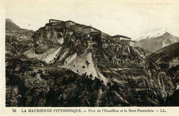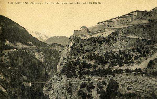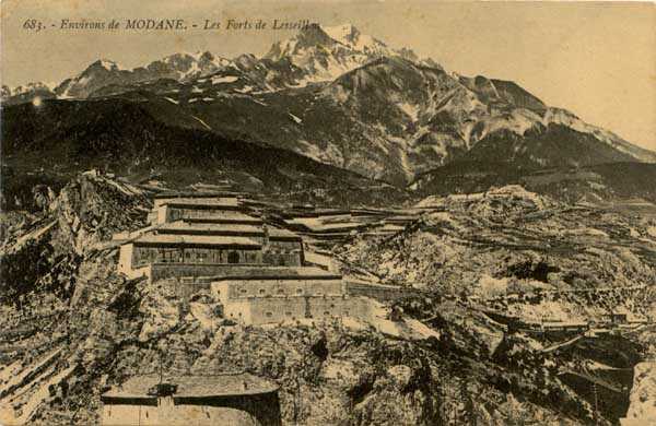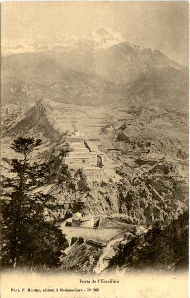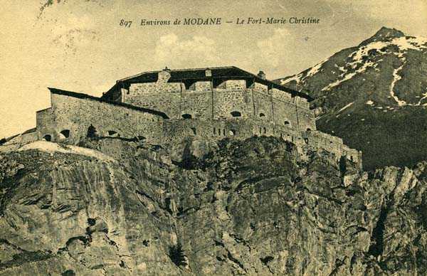 Dept 73 (Savoie). The larger village of Modane is nestled in the hollow of the Arc valley, an obligatory passage for anyone coming from the Col du Mont-Cenis. Directly downstream are the forts of Sapey (+ its redoubt) and Replaton, and upstream rises the Esseillon barrier with its 5 old Italian forts, all built between 1817 and 1830 (forts Marie-Thérèse at ± 1260 m/alt, Marie-Christine at 1494 m/alt, Charles-Félix at 1363 m/alt, Charles-Albert at 1508 m/alt and Victor Emmanuel, culminating at 1354 m/alt). These old forts passed to France with Savoy in 1860 and we do not know if they were armed subsequently. A note from the General Staff of 3 December 1888, however, prescribes to maintain them as they are. For the record, we will limit ourselves here to citing the guardhouse barracks of the Col de Fréjus, that of the Col de la Roue and that of the Col de la Vallée Étroite, all three built in 1895. Finally, let us mention that in 1908, a cable car was built linking Modane to the fort of Replaton and from there to that of Sapey.