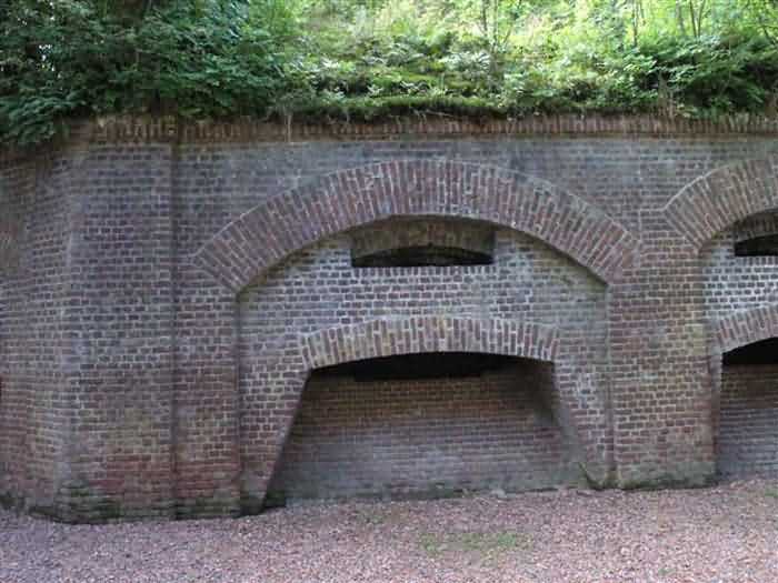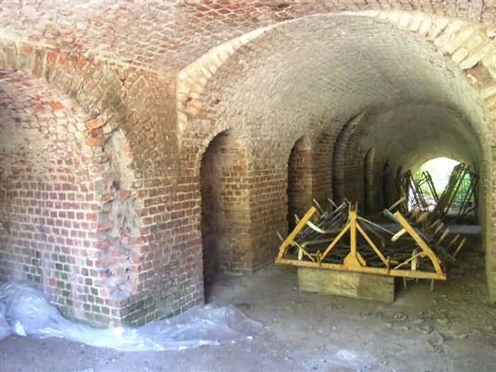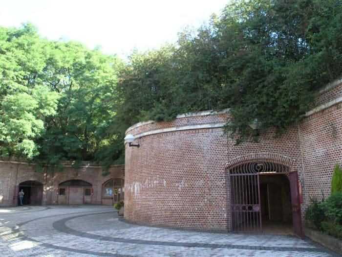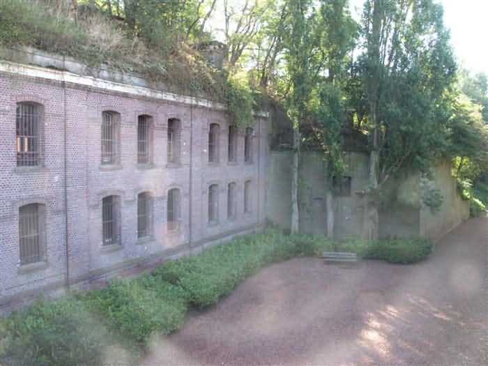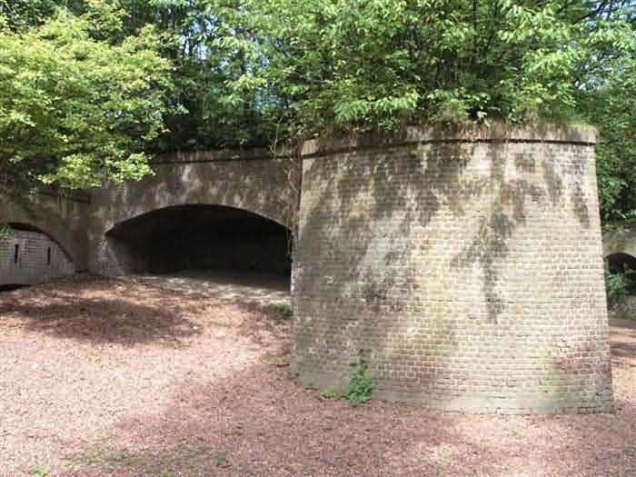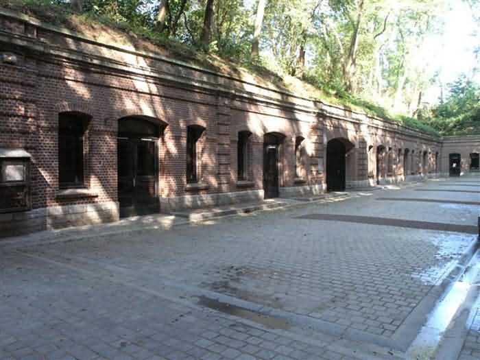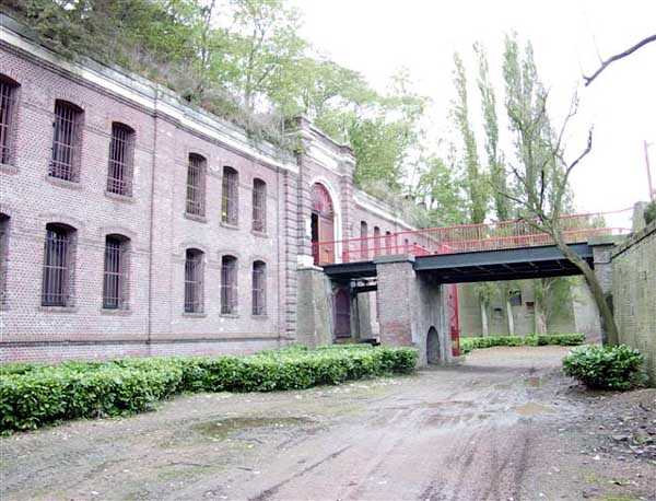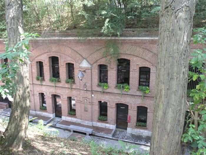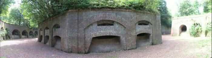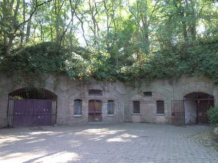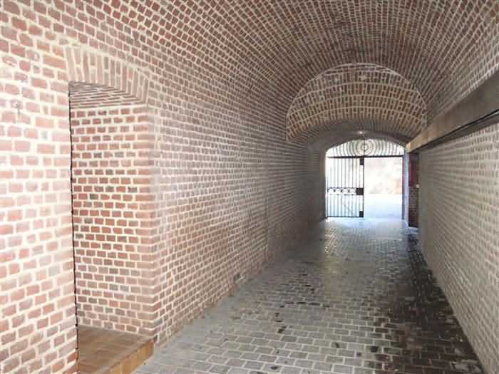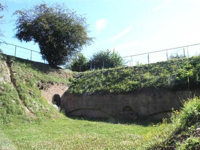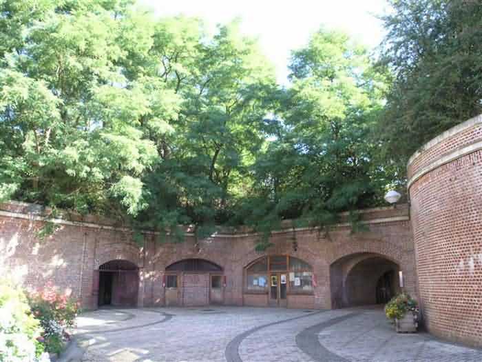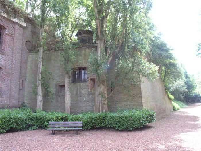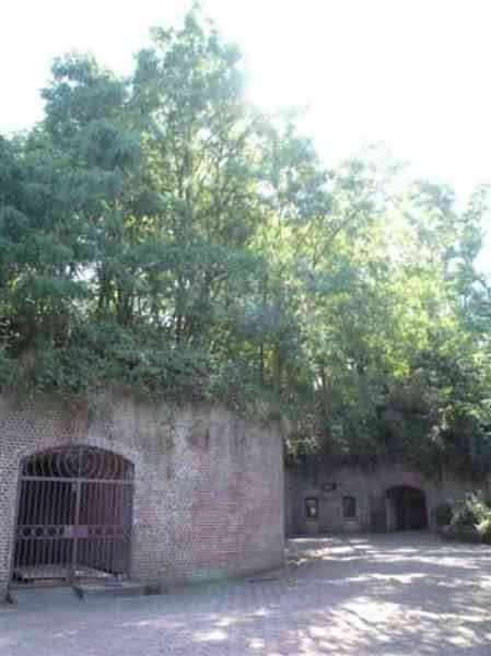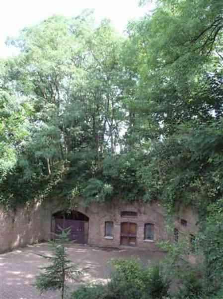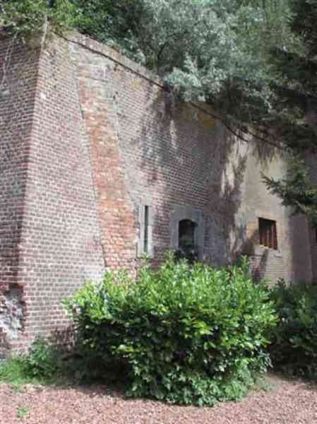 Fortress of Lille, east of the town, 1879-1883. ± 50 m above sea level. Named fort Mac Donald. Regular trapezoid with a re-entering gorge, its dry ditches were defended by a double caponier at salient II and an aileron at salient III. The counterscarp is in relieving arches and the escarp, the essential facing of which has disappeared, must have been detached. The caponiers, however, were not connected to any covered way. A wide curtain wall at the gorge shows, at its center, the entrance porch, which has, on either side, a line of three casemates on two levels (0 and -1) constituting the gorge barracks. The returns of this curtain wall house the coffers which, by their crossfire, ensure the defence of the gorge ditch. According to the panel displayed at the entrance, it was equipped with a bascule bridge underneath. First singular feature, the entrance tunnel is quite wide and, on either side of the defunct gate, a brick wall pierced with a loophole defended the axis of this entrance. The space between this gate and the raised deck of the bridge was furthermore taken on the flank by the loopholes of the contiguous casemates. The tunnel opens into a large transverse courtyard where, with its back to the head front, is the troop barracks composed of six bays on two levels (0 and +1), the whole framed by two narrower bays. Facing these dormitories, is the rear of level 0 of the casemates of the gorge barracks. Each of the flanks of this courtyard gives onto a tunnel passage allowing access to the north and south courtyards. These are identical and one sees there an imposing curved wall ensuring the protection of the entrance airlock of the powder magazines. These are arranged perpendicularly to the lateral fronts of the fort. Each of these courtyards allows access to the single traverse-shelter that each flank of the fort possesses. Still in these courtyards, on this side of the aforementioned curved wall, opens via a tunnel passage the rampart street. This serves nine traverse-shelters, including two rooted ones. The latter frame three traverse-shelters Mle 1879, the line of which constitutes the center of the head front. Behind each salient of this head front, one finds two other traverse-shelters, two of which have their back wall pierced to allow the passage for a corridor debouching first into the open air in an infantry bonnet, before reaching, via another tunnel, the caponiers. The majority of the fort's artillery pieces were directed towards Roubaix. The tops of the barracks, organized as infantry crests, include at least two sally ports and an impressive quantity of chimneys and other light well heads. Regarding particularities, we note that the abutments at the front of the traverse-shelters Mle 1879 are provided with a small ventilation shaft. Still concerning these traverses, their shelter body includes several lateral niches in which brick ledges allowed the installation of two rows of planks. The passages of the rampart street under the rooting of the traverses also include lateral niches, niches the floor of which is curved downwards. The projectile magazines of the double caponier have one of their right angles broken by the passage of the escarp flanking gallery. They also have, each, a light well. Only the flank enfilading the head front is provided with a large visor. Vertically to the wall of the embrasures, an oval shaft about two meters long by one wide, must have ensured, come what may, the evacuation of firing fumes. In the escarp galleries at the level of the caponiers, the rifle loopholes of the two rooms closest to the access corridor are flared inwards by vertical setbacks, only on the caponier side. The parapets of the firing platforms show two pretty masonry arches separated by a niche in which a strong metal ring has been sealed. Each of the firing platforms was reached by a double staircase attached perpendicularly to its root. Finally, each curtain coffer has one of its two embrasures modified. We visited the fort of Mons-en-Barœul in August 2008, during our final trip before the closing of the texts for this index. We therefore had a good idea of what had been done elsewhere regarding the restoration and repurposing of forts. The municipality has made it its cultural centre and it is undoubtedly here that the restoration for cultural (but not necessarily historical) purposes will have impressed us the most. A plaque in the entrance tunnel indicates that the restoration is due to an architect named Gérard DAVID, and dates back to June 1984. We do not know what, in detail, is to be attributed to him, but no matter, we take our hats off to him. The fort is entirely built of baked clay bricks. The structure of the buildings has been respected, while being lightened by varied and colourful plantings. The visitor evolves in a crescendo of wonder. The gorge and then the entrance exhibit careful masonry, harmoniously combining straight lines and curves. The central courtyard, in grey cobblestones, shows lines of reddish cobblestones as if the brick façades were reflecting on a watery element. The south courtyard has received, on the gorge side, a modern building whose ground floor, set back, is surmounted by rooms whose windows, dominated by segmental arches, recall the bays of the large barracks, an element accentuated by the parallel curves of the ground floor gallery. The paving in two shades of grey of this courtyard follows the shape of the protective wall of the powder magazine airlock (transformed into a projection room). Other curves come to meet them; as if pebbles had been thrown into the water, the concentric circles opposing each other confer a certain dynamism to the architectural ensemble. Finally, one reaches the small courtyard behind salient III and finds oneself in an amphitheatre where the parados of the artillery crest – perfectly restored – is only a succession of stepped pathways within a gigantic multicoloured flower bed; moving thro