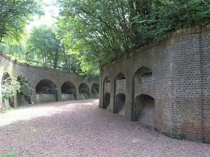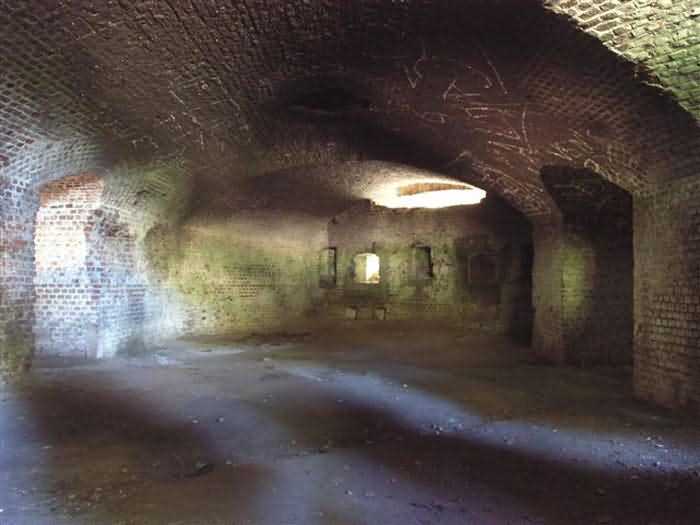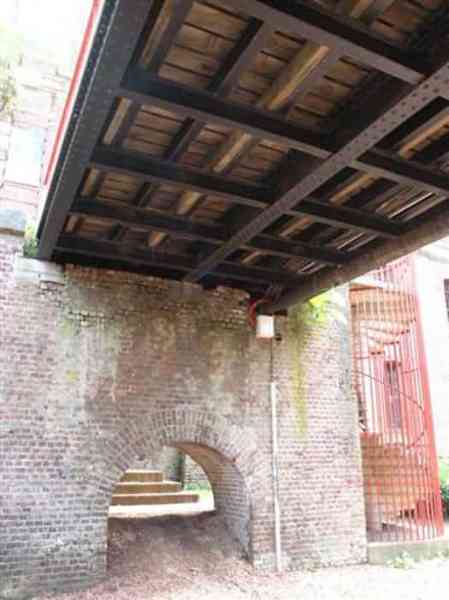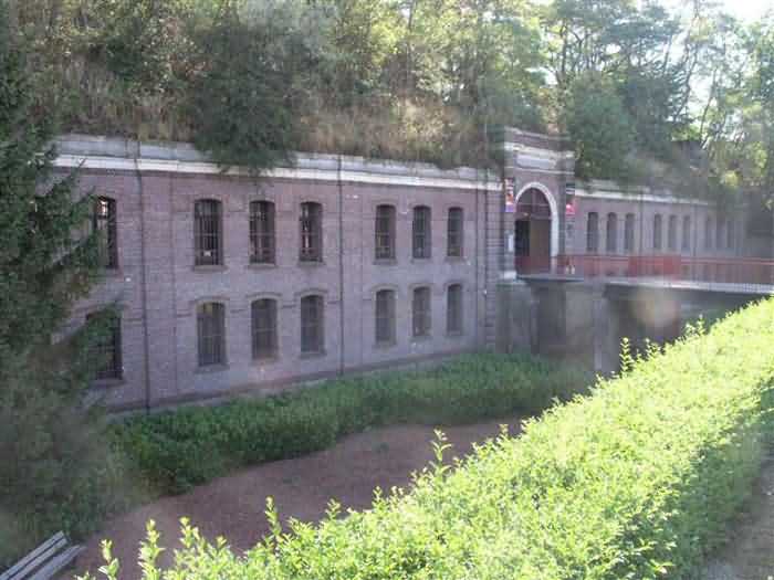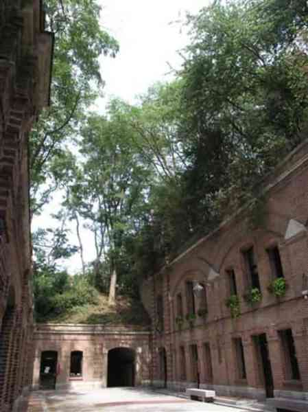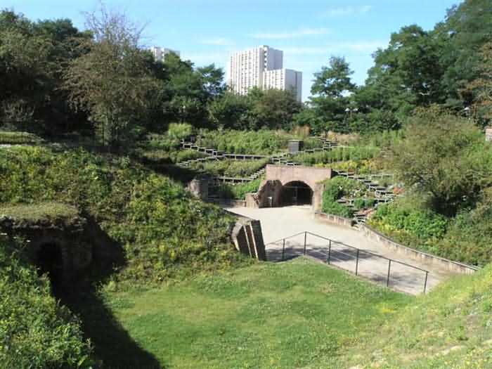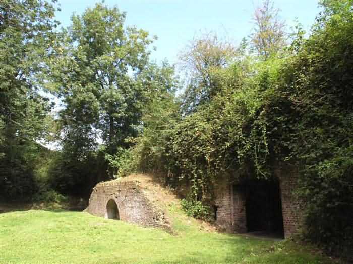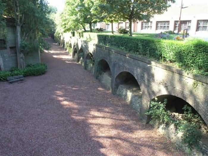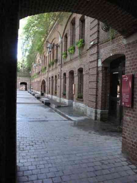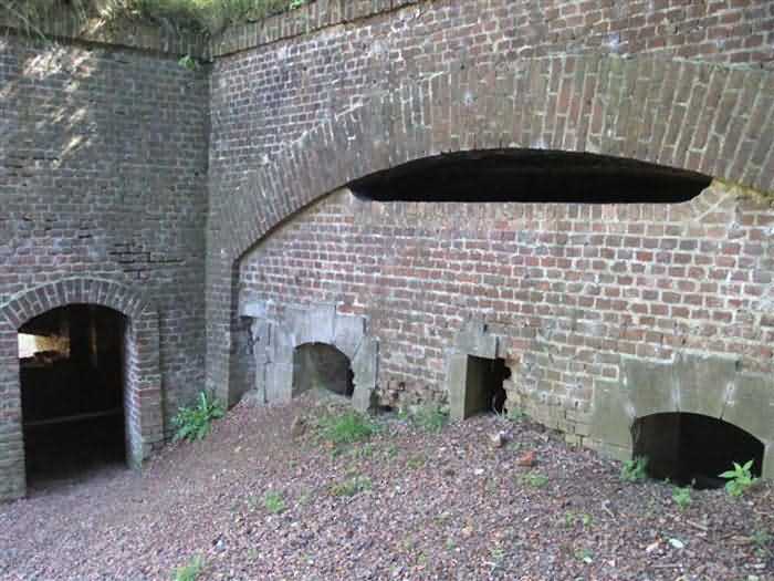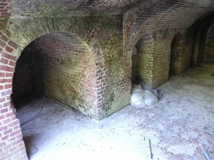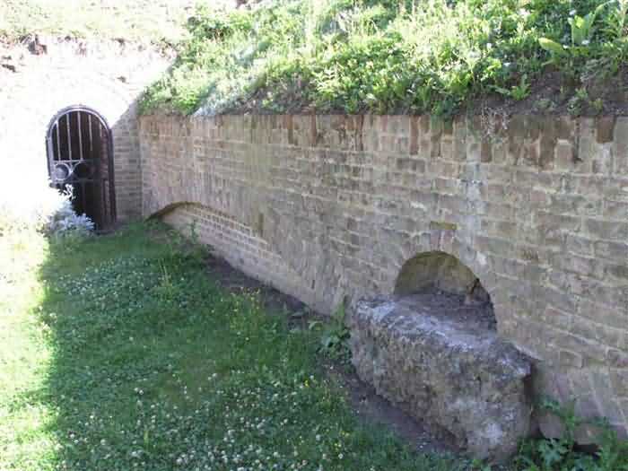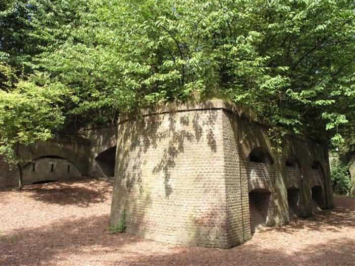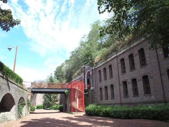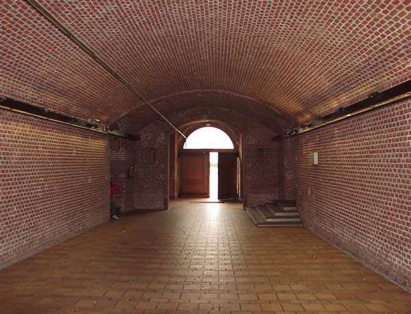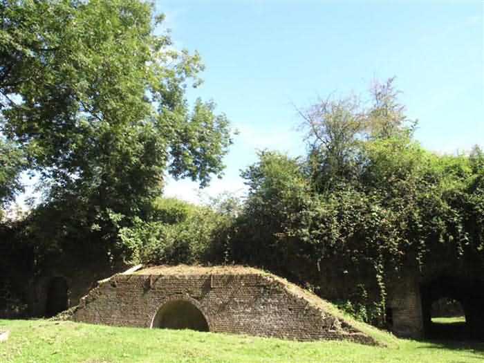 Fortress of Lille, east of the town, 1879-1883. ± 50 m above sea level. Named fort Mac Donald. Regular trapezoid with a re-entering gorge, its dry ditches were defended by a double caponier at salient II and an aileron at salient III. The counterscarp is in relieving arches and the escarp, the essential facing of which has disappeared, must have been detached. The caponiers, however, were not connected to any covered way. A wide curtain wall at the gorge shows, at its center, the entrance porch, which has, on either side, a line of three casemates on two levels (0 and -1) constituting the gorge barracks. The returns of this curtain wall house the coffers which, by their crossfire, ensure the defence of the gorge ditch. According to the panel displayed at the entrance, it was equipped with a bascule bridge underneath. First singular feature, the entrance tunnel is quite wide and, on either side of the defunct gate, a brick wall pierced with a loophole defended the axis of this entrance. The space between this gate and the raised deck of the bridge was furthermore taken on the flank by the loopholes of the contiguous casemates. The tunnel opens into a large transverse courtyard where, with its back to the head front, is the troop barracks composed of six bays on two levels (0 and +1), the whole framed by two narrower bays. Facing these dormitories, is the rear of level 0 of the casemates of the gorge barracks. Each of the flanks of this courtyard gives onto a tunnel passage allowing access to the north and south courtyards. These are identical and one sees there an imposing curved wall ensuring the protection of the entrance airlock of the powder magazines. These are arranged perpendicularly to the lateral fronts of the fort. Each of these courtyards allows access to the single traverse-shelter that each flank of the fort possesses. Still in these courtyards, on this side of the aforementioned curved wall, opens via a tunnel passage the rampart street. This serves nine traverse-shelters, including two rooted ones. The latter frame three traverse-shelters Mle 1879, the line of which constitutes the center of the head front. Behind each salient of this head front, one finds two other traverse-shelters, two of which have their back wall pierced to allow the passage for a corridor debouching first into the open air in an infantry bonnet, before reaching, via another tunnel, the caponiers. The majority of the fort's artillery pieces were directed towards Roubaix. The tops of the barracks, organized as infantry crests, include at least two sally ports and an impressive quantity of chimneys and other light well heads. Regarding particularities, we note that the abutments at the front of the traverse-shelters Mle 1879 are provided with a small ventilation shaft. Still concerning these traverses, their shelter body includes several lateral niches in which brick ledges allowed the installation of two rows of planks. The passages of the rampart street under the rooting of the traverses also include lateral niches, niches the floor of which is curved downwards. The projectile magazines of the double caponier have one of their right angles broken by the passage of the escarp flanking gallery. They also have, each, a light well. Only the flank enfilading the head front is provided with a large visor. Vertically to the wall of the embrasures, an oval shaft about two meters long by one wide, must have ensured, come what may, the evacuation of firing fumes. In the escarp galleries at the level of the caponiers, the rifle loopholes of the two rooms closest to the access corridor are flared inwards by vertical setbacks, only on the caponier side. The parapets of the firing platforms show two pretty masonry arches separated by a niche in which a strong metal ring has been sealed. Each of the firing platforms was reached by a double staircase attached perpendicularly to its root. Finally, each curtain coffer has one of its two embrasures modified. We visited the fort of Mons-en-Barœul in August 2008, during our final trip before the closing of the texts for this index. We therefore had a good idea of what had been done elsewhere regarding the restoration and repurposing of forts. The municipality has made it its cultural centre and it is undoubtedly here that the restoration for cultural (but not necessarily historical) purposes will have impressed us the most. A plaque in the entrance tunnel indicates that the restoration is due to an architect named Gérard DAVID, and dates back to June 1984. We do not know what, in detail, is to be attributed to him, but no matter, we take our hats off to him. The fort is entirely built of baked clay bricks. The structure of the buildings has been respected, while being lightened by varied and colourful plantings. The visitor evolves in a crescendo of wonder. The gorge and then the entrance exhibit careful masonry, harmoniously combining straight lines and curves. The central courtyard, in grey cobblestones, shows lines of reddish cobblestones as if the brick façades were reflecting on a watery element. The south courtyard has received, on the gorge side, a modern building whose ground floor, set back, is surmounted by rooms whose windows, dominated by segmental arches, recall the bays of the large barracks, an element accentuated by the parallel curves of the ground floor gallery. The paving in two shades of grey of this courtyard follows the shape of the protective wall of the powder magazine airlock (transformed into a projection room). Other curves come to meet them; as if pebbles had been thrown into the water, the concentric circles opposing each other confer a certain dynamism to the architectural ensemble. Finally, one reaches the small courtyard behind salient III and finds oneself in an amphitheatre where the parados of the artillery crest – perfectly restored – is only a succession of stepped pathways within a gigantic multicoloured flower bed; moving thro