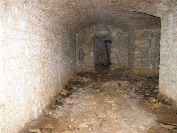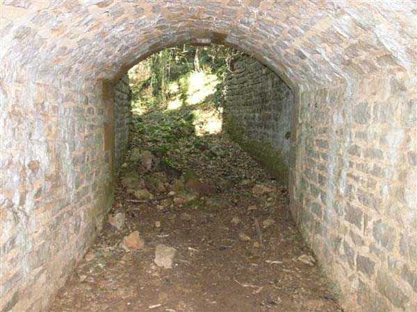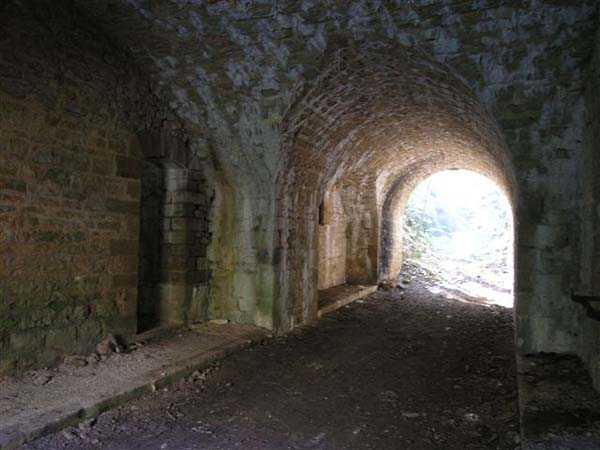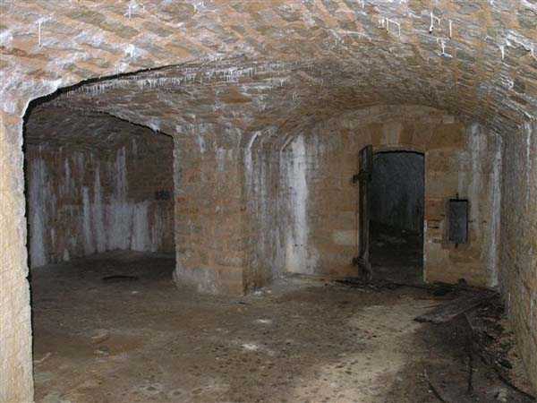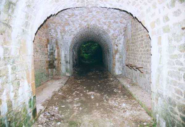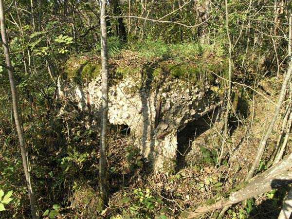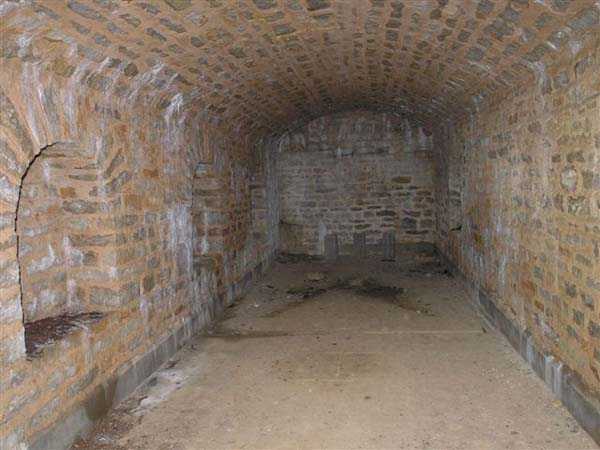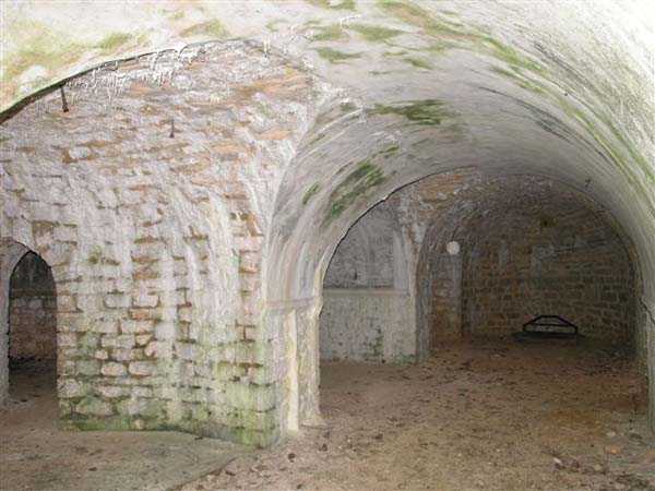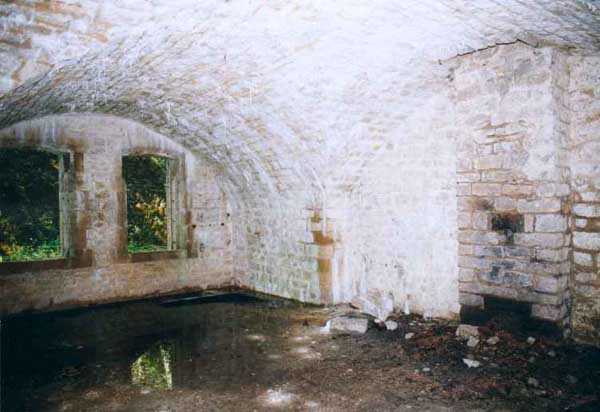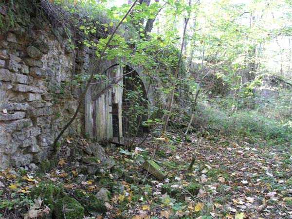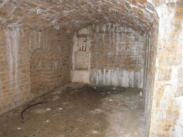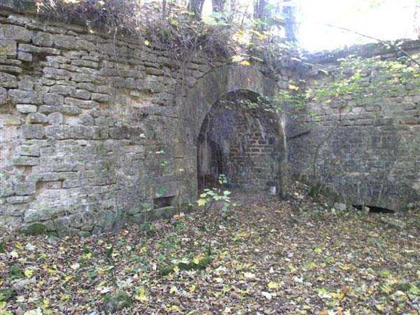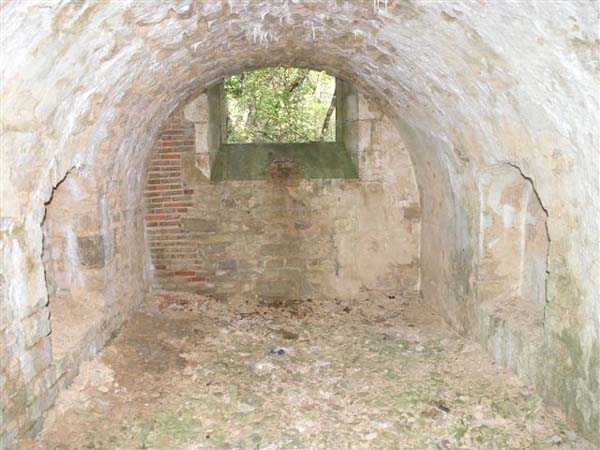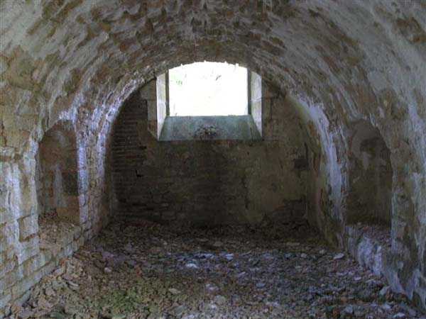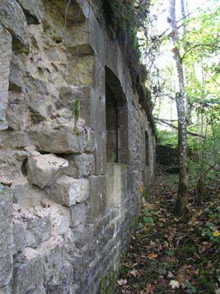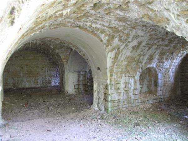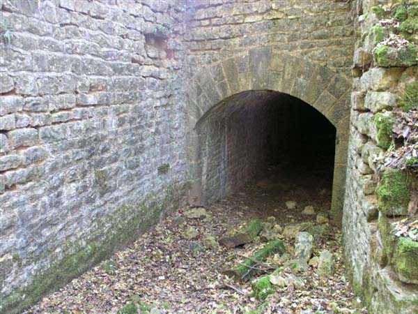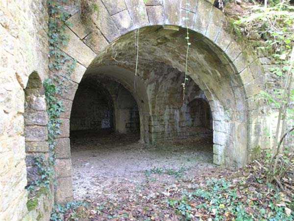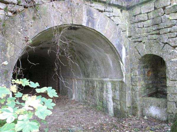Fortress of Langres, south-south-east of the city, 1876-1878. 470 m/alt. Beautiful triangular work established 3700 m west of the fort of Cognelot. 107 men and 9 rampart pieces + 2 mortars and 4 flanking pieces. The entrance opens at the bottom of the gorge ditch and the counterscarp is notched by a gently sloping descent; there is therefore no drawbridge system. The defense of the curtain at the entrance is carried out only from the parapet dominating the semi-detached escarp. That of the two lateral fronts is for its part taken care of from a double caponier at salient II, caponier dominated by a small concreted observatory. The flanking galleries of this caponier, whether escarp or faces, have been concreted and provided with grenade chutes. The opening ensuring ventilation during firing, opening located against the top of the vault between the two embrasures, takes on an unusual and rather pretty shape. The barracks comprise five bays of which the three central ones are united into one large dormitory of 24 × 10 m. All are aligned to the left of the entrance. The artillery of the battery is arranged along an arc of a circle whose ends fold back perpendicularly to the gorge. Singularity of this battery, this arc consists of an enveloping gallery onto which the magazines of each traverse open. Projectile magazines, of course, but also and therein lies the originality, powder magazines. Light wells opening at the exit of the traverse arms provide this gallery with rather meager lighting. The external traverse-shelters are large (11 × 7 m) and partitioned. Their external flank has windows while their entrance has access to a cistern. The traverses communicate with the basement either by shaft or by staircase. The two parts of the enveloping gallery giving onto the capital are closed for the benefit of the Chiroptera by the Conservatoire du Patrimoine Naturel de Champagne-Ardenne (C.P.N.C.A.), the rest is open to all winds. The battery shows some blowholes, but on the whole, it is still in relatively good state of preservation (10/2007).