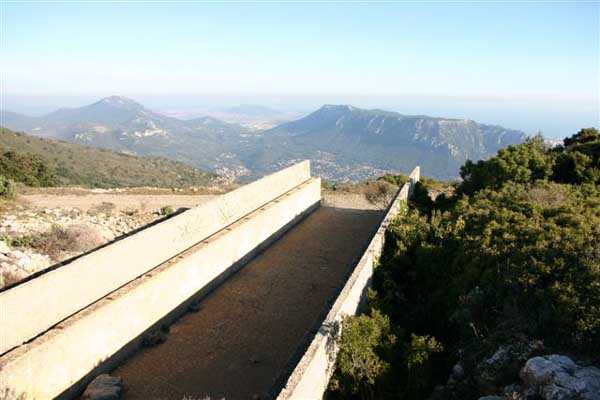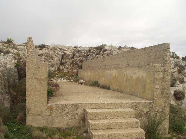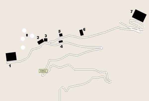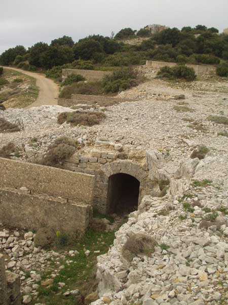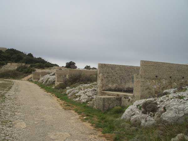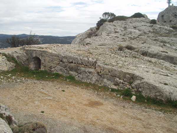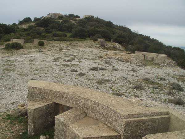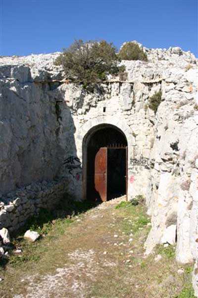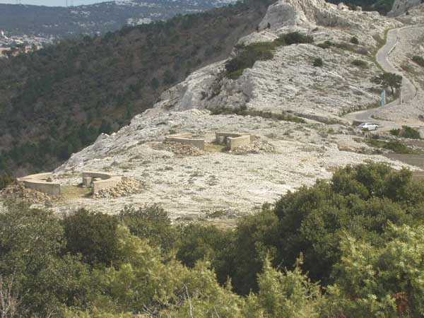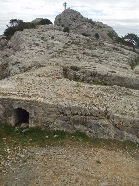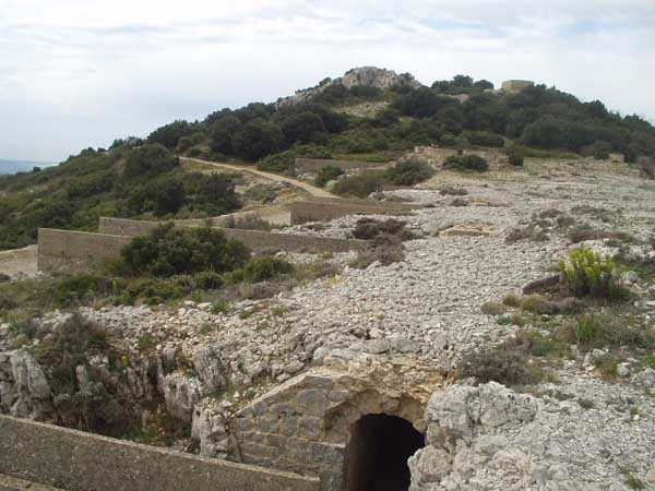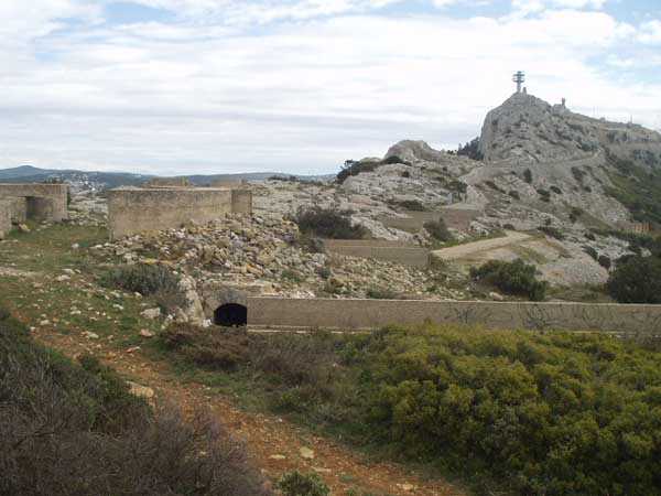 Fortress of Toulon, north-north-west of the city, 1887-1890. Set of 2 small works 1,100 m apart, one designated "west work" and the other "east work" in the interval of which 3 batteries are installed totaling 10 firing platforms (6 - 2 - 2) some of which were concreted later as well as 4 emplacements will be arranged, but these works must date from the interwar period. The 3 intermediate batteries housed in total 8 guns 95 mm and 2 mortars. The ridge joining the two works is pierced with numerous tunnels serving as shelter for artillerymen and infantrymen; one also finds a guardhouse and a cistern, as well as several small magazines dug into the rock and remnants of peacetime barracks. The whole is freely accessible (04/2006).