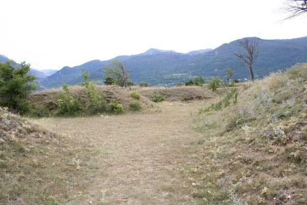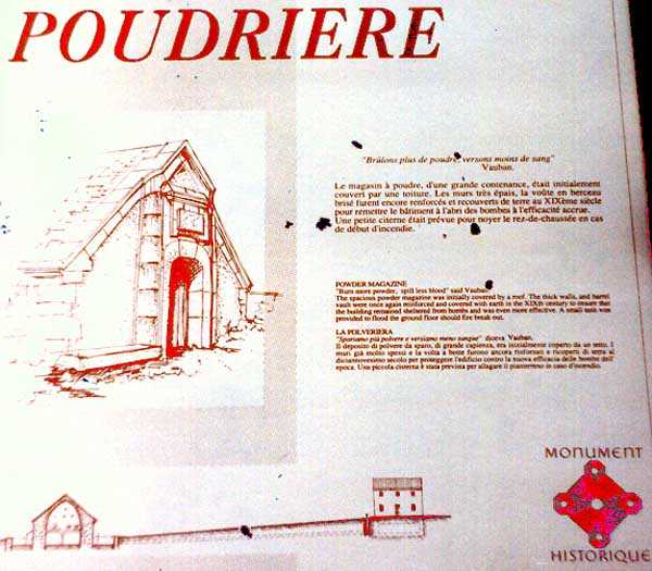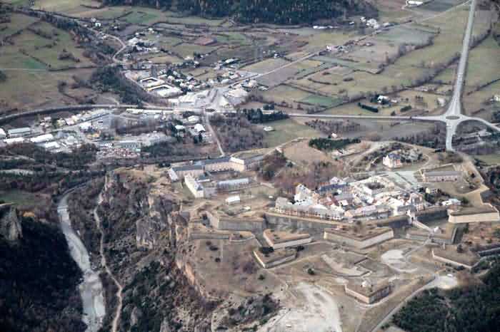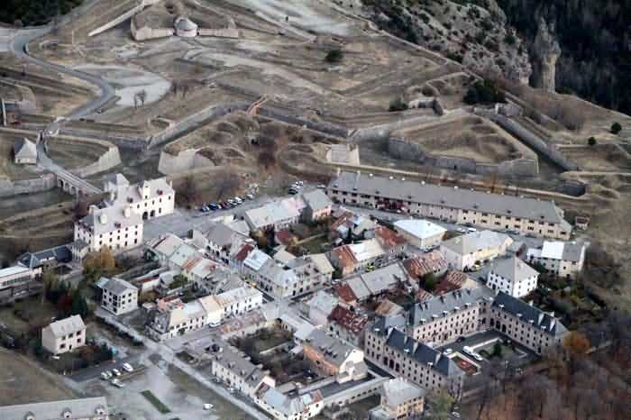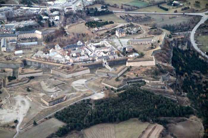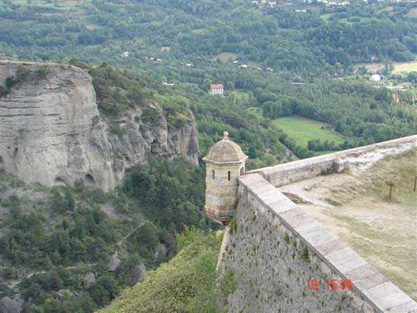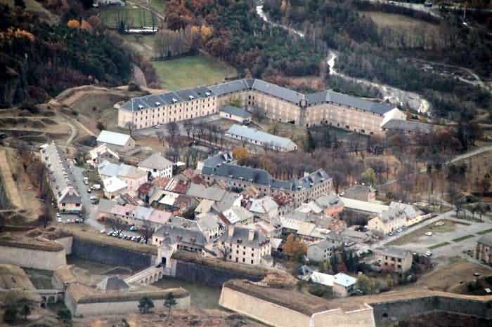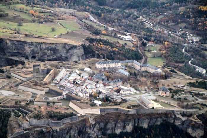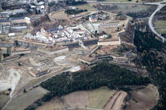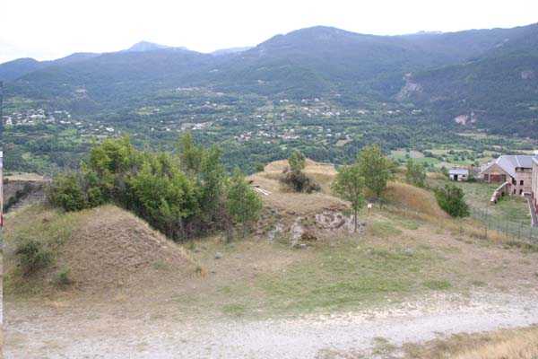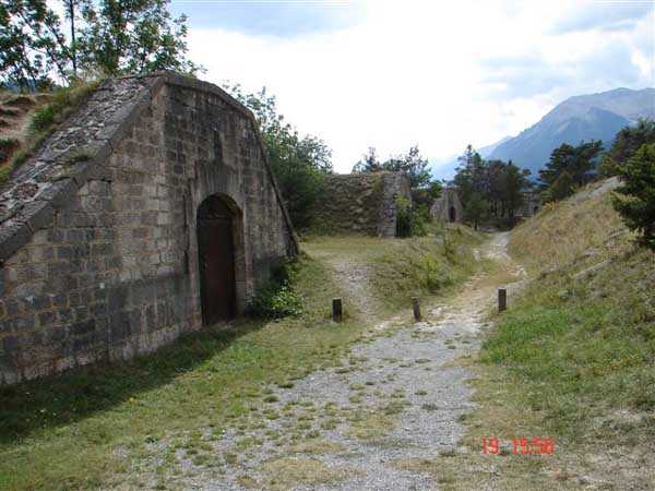 Dept 05 (Hautes-Alpes) 1055 m/alt This citadel, whose origin dates back to 1693 (in fact one of the seven new towns due to Vauban), on the Durance at the outlet of Queyras, covers an impressive rocky plateau. Enthusiasts visit it for its Lunette d'Arçon and its Rochambeau barracks whose ingenious framework includes no woodwork of more than 120 cm in length. The rest of the buildings as well as the gorge and Guil fronts are certainly not to be disdained, no more than the hospital, the Saint-Louis church or the arsenal. The citadel comprises two entrances, the Briançon gate is the main one, the Embrun gate (with Poncelet drawbridge) the secondary one. For the period covered by this index, we must note several modifications carried out between 1879 and 1882. The powder magazine behind the arsenal, built according to Vauban standards, with buttresses and enclosing wall, was to be preserved as is. Along each large flank, a circulation gallery was to be provided. At the rear of the storage room (23 x 8 x 11 m), ogival, a lamp room with two rows of three lamp embrasures and three ventilation shafts were fitted out and the front preceded by an airlock, the whole covered with a thick layer of earth (1882). This magazine, a real marvel, has in a quite unusual way; its entrance at the level of the first floor of the storage room. Such a case existed in bastion II of the arsenal of Cherbourg, a bastion now destroyed. The airlock comprises a double staircase allowing to pass from one level to the other. All woodwork, floors, beams, pillars, are present, alas, during our visit (05/2008), this magazine was closed to the public. At most we were able to note the presence of the entrance coating, the two lightning conductors and the lanterns on the shafts. Behind the church, of which only the choir remains, a parados made of imported earth was raised in front of which was established on a curve, a line of four traverse-shelters followed by two full ones. This battery (1879) will be designated "battery 84" and equipped with eight artillery pieces. The second battery (1880), called "battery 85" will be installed behind the Guil front. It comprises two casemates separated by a tunnel passage allowing to reach horizontally the front of the battery, bordered by the scarp of the citadel and from where one has a surprising view of the Guil gorges. Above the casemates, an artillery cavalier was provided, but, singularly, the maneuvering of the pieces must have been somewhat hindered by the chimneys of these casemates. Apart from the development of the Gros battery, the improvements of the place stopped there. A note from the General Staff of December 3, 1888 then prescribed to maintain it as is. Mont-Dauphin is an inhabited and freely accessible citadel. We will note there, for once, an excellent shop offering a wide sample of quality publications. Sometimes spelled "Montdauphin".