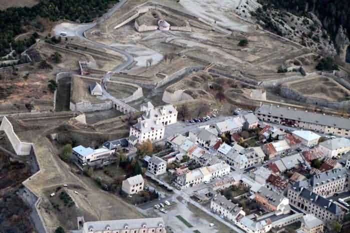 Dept 05 (Hautes-Alpes) 1055 m/hoogte Deze citadel, waarvan de oorsprong teruggaat tot 1693 (eigenlijk een van de zeven nieuwe steden te danken aan Vauban), op de Durance aan de uitgang van de Queyras, bedekt een indrukwekkend rotsplateau. Liefhebbers bezoeken het voor zijn lunette d'Arçon en zijn Rochambeau-kazerne waarvan het ingenieuze dakwerk geen houtwerk van meer dan 120 cm lengte bevat. De rest van de gebouwen evenals de keel- en Guil-fronten zijn zeker niet te versmaden, evenmin als het ziekenhuis, de kerk Saint-Louis of het arsenaal. De citadel omvat twee ingangen, de poort van Briançon is de belangrijkste, de poort van Embrun (met Poncelet-ophaalbrug) de secundaire. Voor de periode gedekt door deze index, moeten we verschillende wijzigingen uitgevoerd tussen 1879 en 1882 onthouden. Het kruitmagazijn achter het arsenaal, gebouwd volgens de standaarden van Vauban, met steunberen en ommuring, zou ongewijzigd bewaard blijven. Langs elke grote flank, zou een circulatiegalerij worden voorzien. Aan het einde van de opslagruimte (23 x 8 x 11 m), ogivaal, werden een lampenkamer met twee rijen van drie lampsonepen en drie ventilatieschachten aangelegd en de voorgevel voorafgegaan door een sas, het geheel bedekt met een dikke laag aarde (1882). Dit magazijn, een waar wonder, heeft op heel ongebruikelijke wijze; zijn ingang op het niveau van de eerste verdieping van de opslagruimte. Een dergelijk geval bestond in het bastion II van het arsenaal van Cherbourg, bastion vandaag vernietigd. De sas omvat een dubbele trap waardoor men van het ene niveau naar het andere kan gaan. Alle houtwerk, vloeren, balken, pijlers, zijn aanwezig, helaas, tijdens ons bezoek (05/2008), was dit magazijn gesloten voor het publiek. Hoogstens hebben we de aanwezigheid kunnen vaststellen van de omhulling van de ingang, van de twee bliksemafleiders en van de lantaarns op de schachten. Achter de kerk, waarvan alleen het koor overblijft, verhief men een parados in aangevoerde aarde waarvoor men op een boog, een lijn van vier traverseschuilplaatsen gevolgd door twee volle establish. Deze batterij (1879) zal "batterij 84" worden genoemd en uitgerust met acht artilleriestukken. De tweede batterij (1880), genaamd "batterij 85" zal worden geïnstalleerd achter het Guil-front. Zij omvat twee kazematten gescheiden door een doorgang in tunnel waardoor men horizontaal de voorkant van de batterij kan bereiken, begrensd door de escarpe van de citadel en vanwaar men een verrassend uitzicht heeft op de kloven van de Guil. Boven de kazematten, is een artillerie-cavalier voorzien, maar, eigenaardig, de manoeuvre van de stukken moest er enigszins gehinderd worden door de schoorstenen van deze kazematten. Behalve de inrichting van de Gros-batterij, stopten de verbeteringen van de plaats hier. Een nota van de Algemene Staf van 3 december 1888 schrijft dan voor hem te handhaven in de staat. Mont-Dauphin is een bewoonde en vrij toegankelijke citadel. Wij zullen er, eens is geen gebruik, een uitstekende winkel opmerken die een brede steekproef van kwaliteitsvolle publicaties voorstelt. Soms gespeld als "Montdauphin".