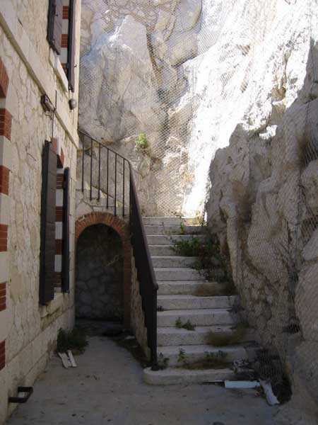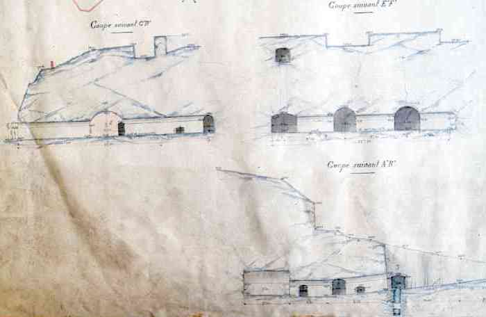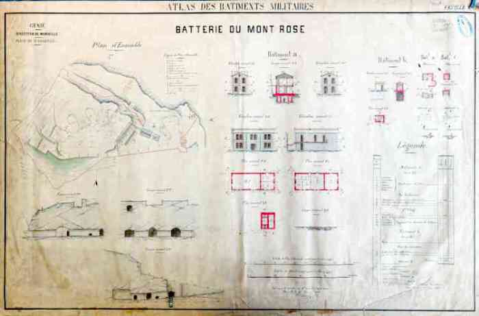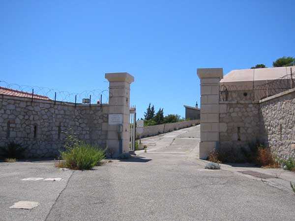 Fortress of Marseille, south-south-west of the city. 82 m/asl. Coastal battery reported in a report of the Coast Defence Commission, dated 19 February 1886, as to be built as a first priority. It contained 5 - 24 cm Mle 1876 guns on PC carriage and its auxiliary battery of 4 - 95 Mle 1888 guns on carriage Mle 1904. Its occupation until recently has modified it but also protected it. What must be remembered above all is its rock magazine which still retains its grilles, door frames, sheet metal umbrella shields and original monorail. Now (07/2005) open to the four winds, will these remains resist vandalism for long?