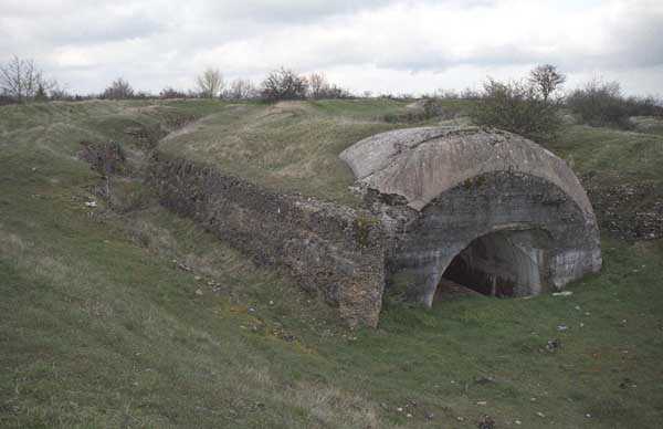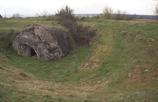 Fortress of Langres, north-north-east of the city, 1888. 467 m/alt. Small infantry work established on the north-western heights of the village of Changey, to the right of the work of Movange. Reniform like the other similar works of the fortress, it is however more crushed upon itself, the angles formed by the junction of the gorge and the parapet of the head front being more acute. As usual in Langres, two concreted entrances (about 2 m concrete thickness) each give onto a staircase leading seven metres underground (38 steps of 18 cm) debouching at each of the ends of a circulation corridor onto which six dormitories of 12 × 4 m open. The one located the most to the right includes partitions dividing its surface, partitioning probably indicating the lodging of the work's commander. The circulation corridor also runs alongside a drinking water well dug in the same manner as that described in the little article concerning the work of Movange. The lateral walls at the foot of the access staircases have suffered from blowholes, otherwise the work is in rather good state of preservation. Its tops are from time to time cleared of brushwood by the town hall. The work is closed by the Conservatoire du Patrimoine Naturel de Champagne-Ardenne (C.P.N.C.A.) for the benefit of the Chiroptera (10/2017). Also known under the name work of Changey or yet work of the mountain of Changey.