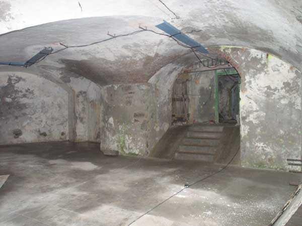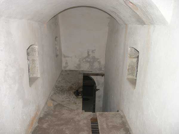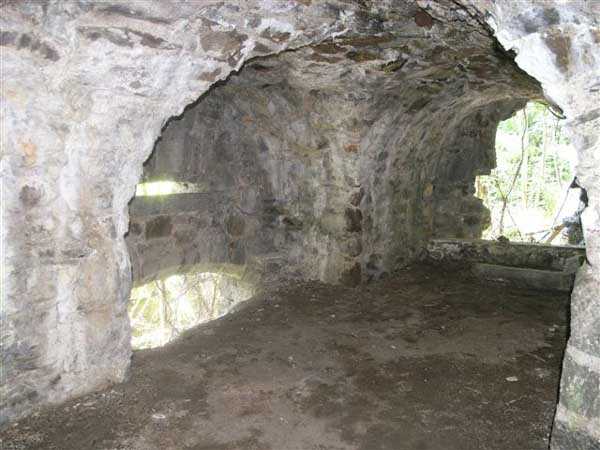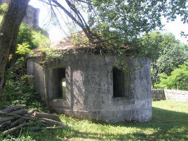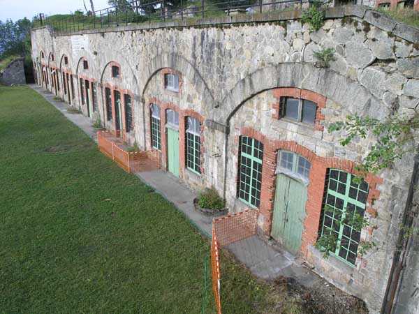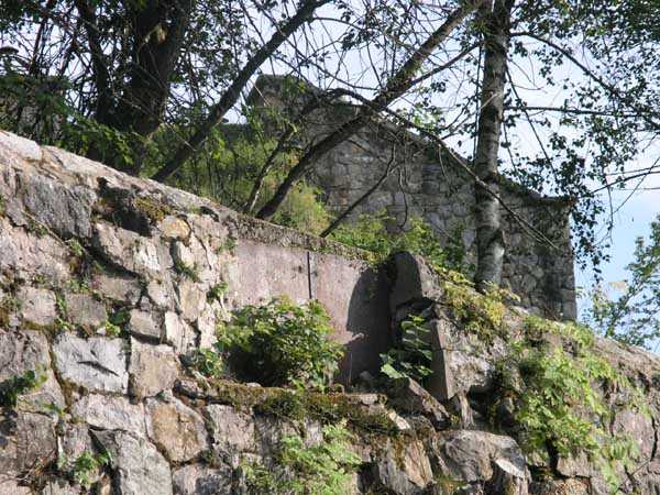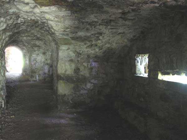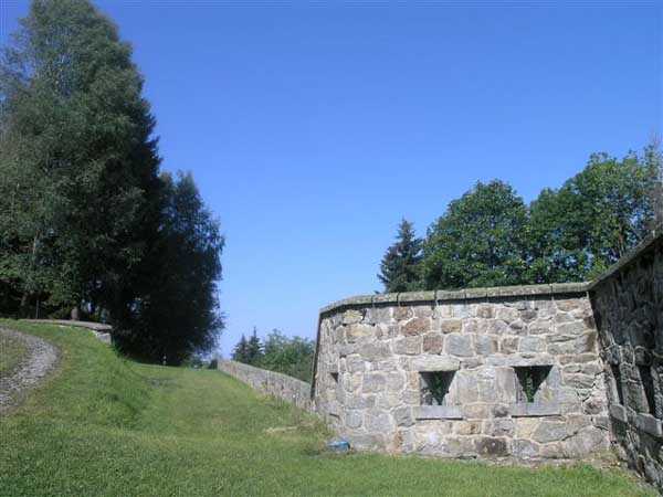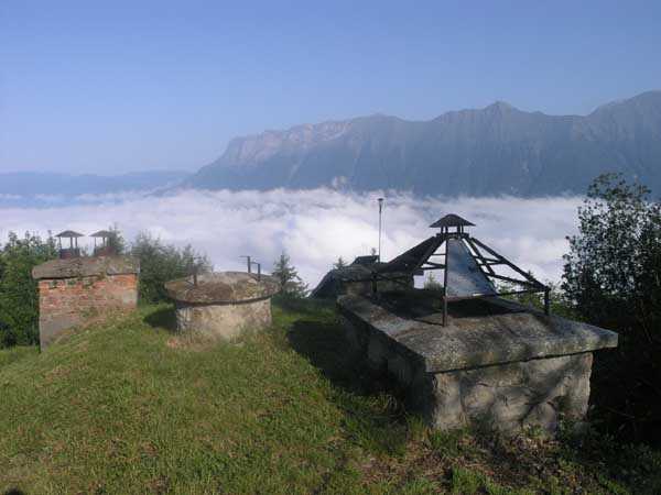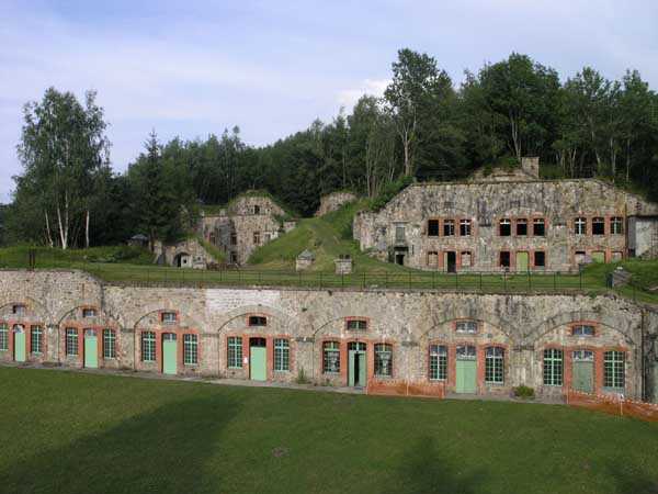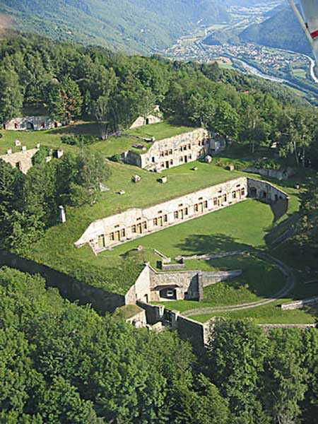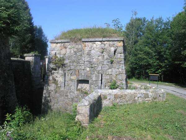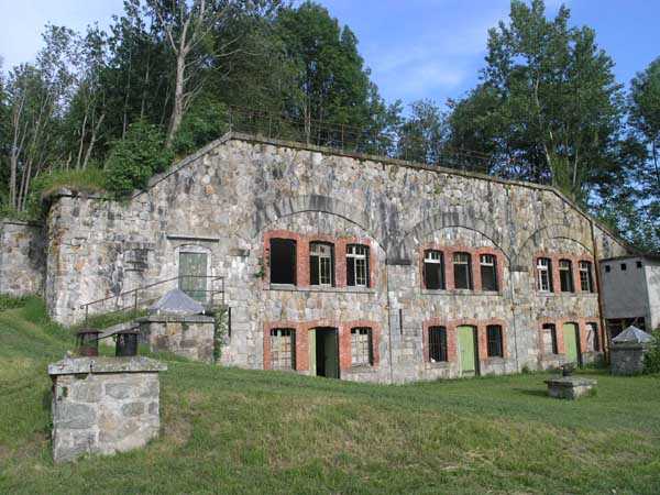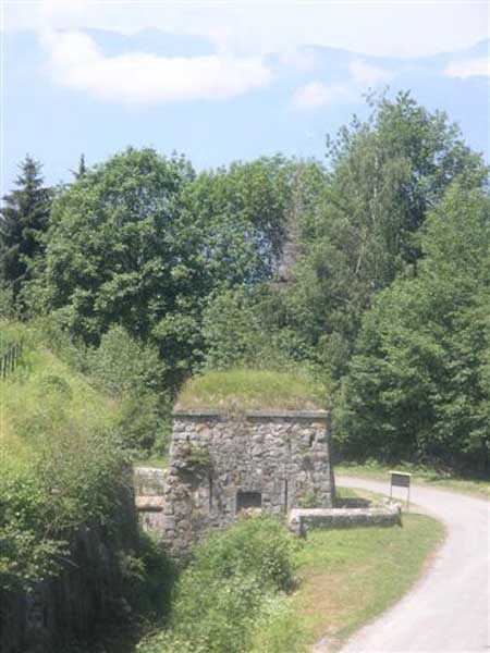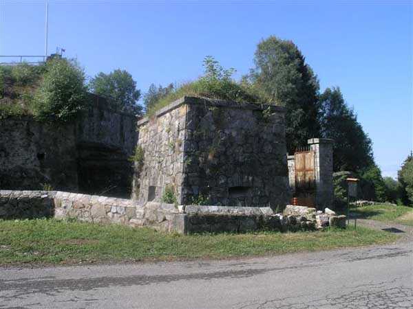 Fortress of Chamousset, east-northeast of the town, 1875-1876. 965 to 1,012 m above sea level. 609 men and 28 guns. Fine fort, practically rectangular, established on five successive terraces, with the troops' barracks cutting it in two along its minor median. It is designed as a blocking fort with platforms oriented in all directions. The entrance is preceded by a detached half-caponier. This case, extremely rare not to say unique, implies, unlike fort Hauteville, having as its mission only the defense of a single ditch segment, namely the eastern half-gorge. The defense of the western half-gorge is shared between perpendicular loopholes located to the right immediately after the escarp entrance and is dominated along its entire length by a parapet wall. Note that this detached half-caponier is also responsible for the close defense of the entrance passage and is in no way connected by a gallery to the fort. Upon entering the fort, one finds oneself almost facing the stables, which have ten mangers, which is well above average. It must be said that the slightest gun movement in this terraced fort could not do without horse power. To the right, a succession of seven defense casemates was to prevent an enemy from approaching the detached half-caponier by taking advantage of its blind spots. Also found at this level are the food stores and a staircase allows access to the main barracks comprising seven large rooms, with very high ceilings. We are then approximately at the center of the fort, this barracks, on a single level, being oriented overall north-south. In front of it, slightly to its left and at the same level, a covered passage leads into a small courtyard bordered by rooms devoted to armament. As these sensitive rooms, being susceptible to being hit, they were placed set back from a corridor open onto three large bays that were planned to be blocked in case of conflict. Facing them, a traverse shelter most certainly housed an optical communications post. The abutment of this traverse shows four bricked-up loopholes and next to the chimney of the heliostat, the passage of the linkage. From this same traverse, one accesses a first basement and then the first floor of the west barracks. This staircase extends down to the ground floor, making it a passage protected on four levels. The circulation corridor at the rear of this barracks is curved over the width of each bay, to better resist earth pressure. Here, the destroyed bread oven could bake 250 rations per day. At the northern end of this barracks, a small simple concrete optical post was set up. It comprises three loopholes but no table for equipment and no heliostat shaft. As the loophole towards fort du Mont runs straight into the parapet wall of the gorge escarp, a passage with metal doors was provided in the latter. Going back up into the main barracks, one will note there, in the rear circulation corridor, masonry buttresses that are so many small supporting arches. To its right, this barracks includes extensive engineer rooms as well as a small caponier occupying the center of the long straight front formed by the south escarp. This caponier is accessible by a small ramp staircase and its roof is made of a terrace with a parapet wall and projections at the angles in order to be able to sweep the blind spots, projections apt to provoke a semantic quarrel. The very important infirmary building is located one terrace higher, thus further east. There one spots rare remains of stoves. Higher still, another courtyard with the officers' barracks behind which we find the main powder magazine. In the storage room of the latter, one will note a recess in the ceiling for the passage of the doors of the light shaft, which undoubtedly constitutes an originality. The lamp room has preserved all its wooden parts, stairs and floor. This lamp room serves, in addition to the three lamp niches of the powder magazine, that of the cartridge magazine, contiguous and impressive in height. A half level higher, one finds a group of three rooms of which the two outer ones have a lamp niche occupying the place of a half-window and which must have been served from the outside… a bizarre and probably unique device having the air of a makeshift solution. Finally, finishing our sweep to the east, one arrives at the last level of traverse-shelters from which one can access the two small double caponiers occupying the angles of the chevron of the two fronts oriented to the east, caponiers connected by a covered way very pleasant to walk. The cumulative lengths of the escarps total 700 m. Montperché could sweep both the upstream part of the Isère valley and that of the Arc. Since 2005, it is inhabited private property. A project to set up guest rooms is underway (10/2007). This fort, original in more than one respect, certainly deserves a visit. An annex battery downhill, without the slightest masonry. (www.fort-de-montperche.com).