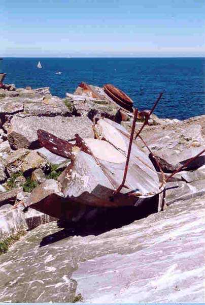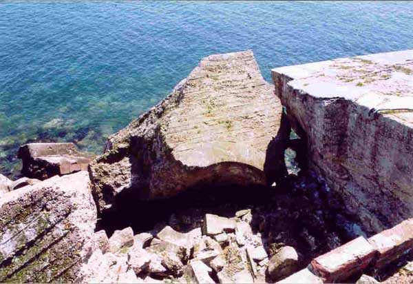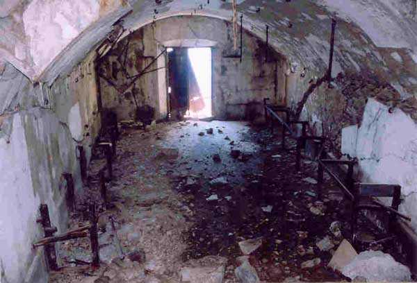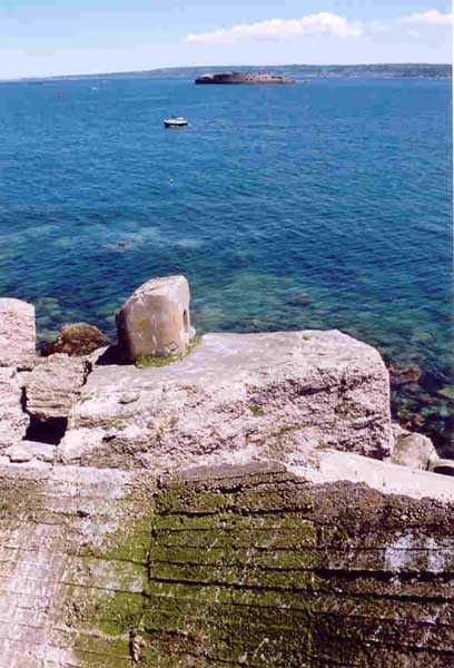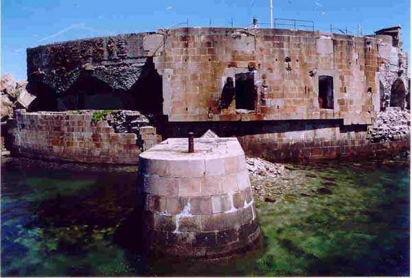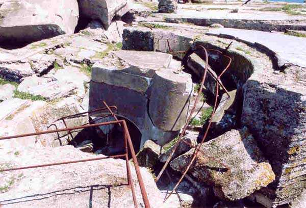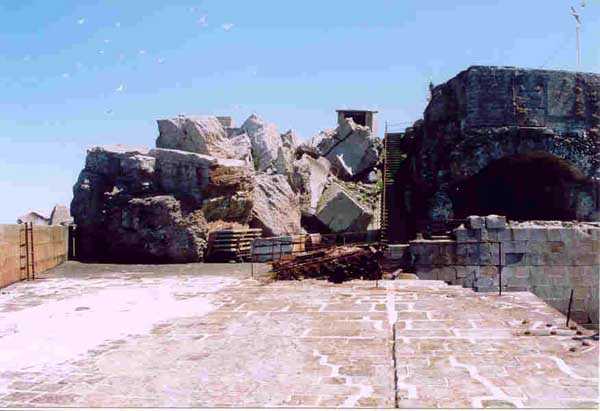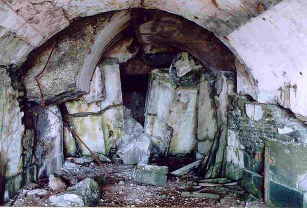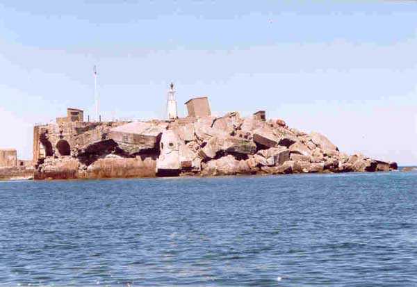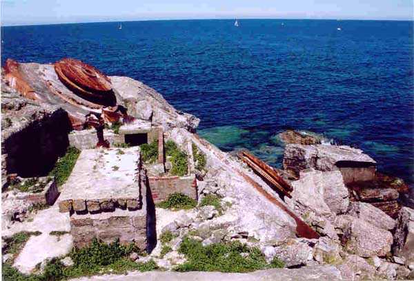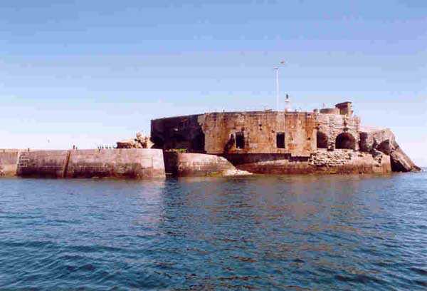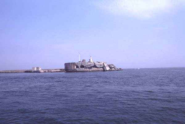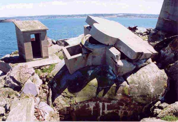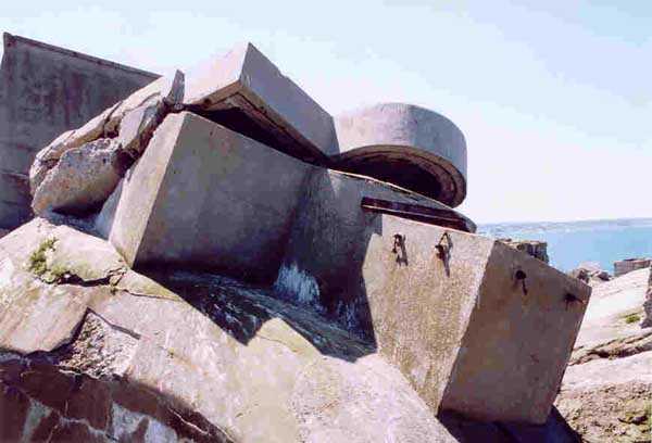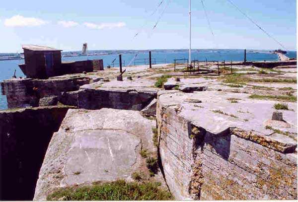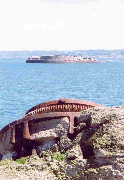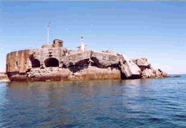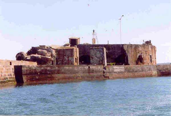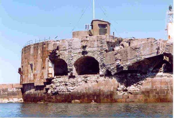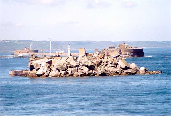 Place de Cherbourg, NE de la ville. Situé à l'extrémité est de la grande digue du large, ce fort a été construit de 1851 à 1860. C'est un fort circulaire de 70 m de diamètre qui comprend deux niveaux de casemates encerclant une cour intérieure. Un petit port sur ses arrières permet l'accostage. En 1898, on ne conserve qu'un seul étage et on remplace le niveau supérieur par une dalle de béton de 3 m d'épaisseur qui couvrira aussi l'intégralité de la cour intérieure, laquelle sera divisée en locaux (entreposage des gargousses des 32 c, magasin aux culasses, munitions des canons de 47 mm et celles des batteries n° 1 à 3 de la digue). Son armement sera alors de 2 canons de 32 c modèle 1870-81 sur affûts P.A. mle 1882, sous casemates, pour défendre la passe jusqu'à l'île Pelée ; 4 canons de 32 c modèle 1870-84 sur affûts P.A. modèle 1888 sur la toiture, groupés par deux derrière des barbettes ; la toiture supporte aussi à gauche et droite des emplacements des canons de 32 c, 2 x 2 canons de 100 mm modèle 1881 TR sur affûts Vavasseur ainsi qu'au dessus des deux casemates des canons de 32 c, 4 x 47 mm modèle 1885 TR sur affûts à crinoline. Le 18 juin 1940, l'officier commandant le fort ne voulut pas le rendre intact aux Allemands et il le fit sauter. Les charges furent concentrées dans la moitié nord du fort, tant et si bien que la moitié sud s'affranchit de l'ancrage de ses piédroits et se mit en porte-à-faux d'une quarantaine de cm par rapport aux fondations. Un bon tiers de ses locaux sont encore accessibles moyennant quelque gymnastique. Le plus intéressant au cœur de ces vestiges est l'usine électrique, un véritable joyaux complet qui fait le bonheur des rares privilégiés obtenant l'autorisation de parcourir les lieux. Entre les blocs cyclopéens, au niveau de l'eau, on peut encore repérer 4 canons de 100 mm et leurs affûts. D'autres vestiges attirent l'attention telles des plaques tournantes de voie de 60 et même un wagonnet. Ce fort est un des rares exemples français de fortification en béton non armé implosée. Cela permet de nombreuses constatations quant à la résistance du nouveau matériau découlant de la manière de sa mise en œuvre, sa composition, ses coffrages, etc. Extrêmement intéressant. Aujourd'hui, seuls les cormorans et les goélands s'y complaisent. Propriété de la Marine, interdit d'accès.