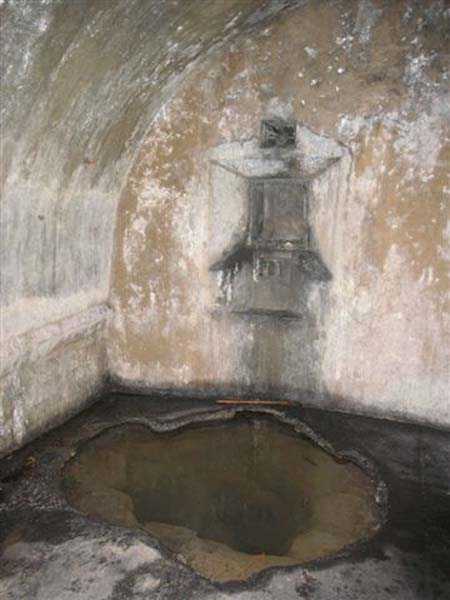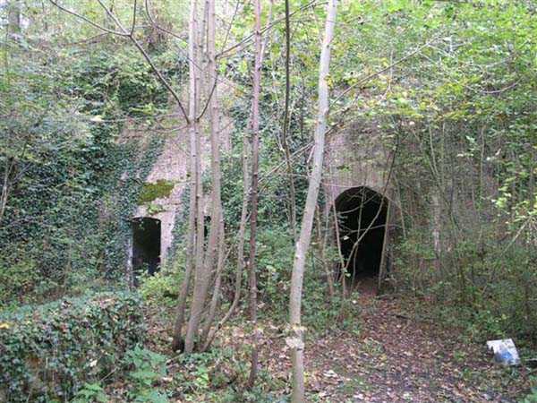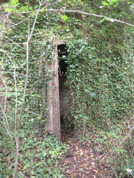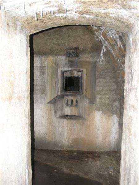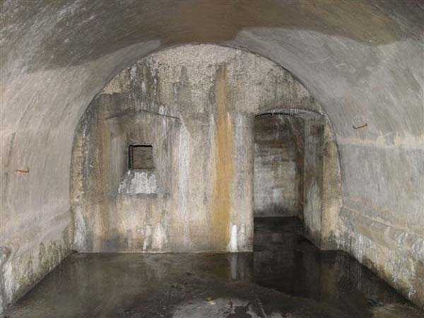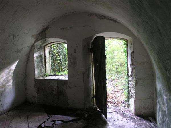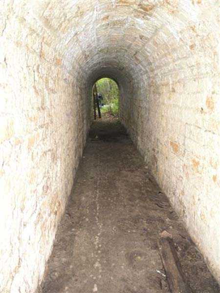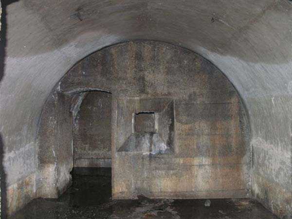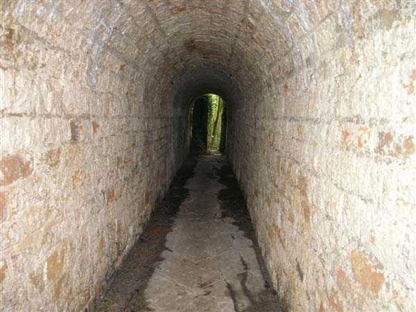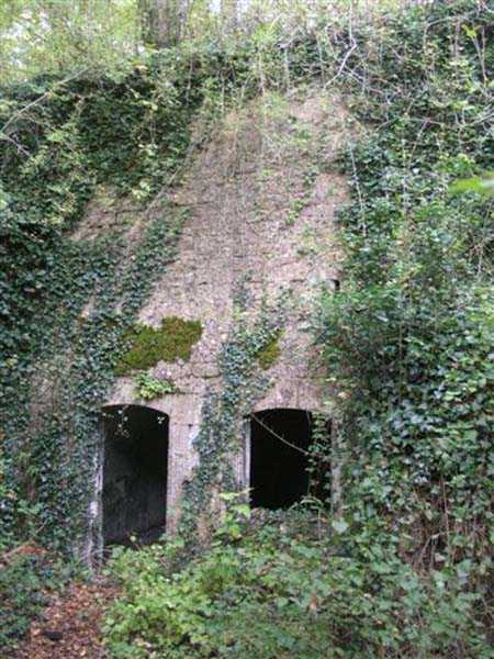 Fortress of Langres, north-north-east of the city, ± 1890. ± 360 m/alt. Rock-cut powder magazine, established on the southern slope of the Charmes reservoir. Rather curiously, no work or battery is located nearby. The magazine comprises two parallel entrances 14 m apart and leading to galleries 20 m in length by 2 m wide. A transverse gallery then connects them, a transverse gallery onto which two storage rooms are grafted, preceded by an airlock. The one on the left, 13 × 5.5 m, is 26 m from the one on the right which has smaller dimensions (9 × 4.5 m). This last room shows what must be a geological incident. Indeed, just in front of the lamp loophole, the ground has collapsed forming a shaft whose bottom cannot be distinguished. This shaft is filled with water whose level is flush with the floor level of the room. No development or protection having been carried out, it is to be assumed that this incident occurred after the decommissioning of the magazine. The remains of the outer enclosure tend to demonstrate that the guardhouse, dug into the rock to the left of the first entrance, was separated from it by a wall. This wall, partially collapsed, probably had to include at least a gate but we did not detect any trace of it. This magazine is open to all winds (10/2007).