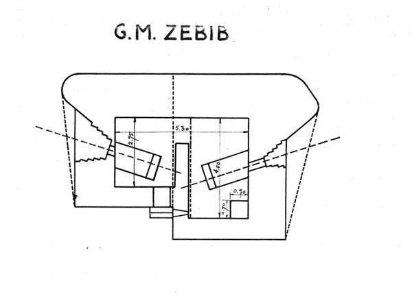 Bizerte. The mission of the Metline Zébib defensive strongpoint is the defense of the Metline plateau, or Djebel Bou-Choucha, and the main artillery battery stationed there, as well as the secondary artillery battery at Cape Zébib. For this purpose, it has a command post, an observation post O, established at elevation 236, 5 double casemates, GM 1 to 5, and a single casemate, GM 1 bis. All these elements are arranged on the plateau, around the 340 battery. An anti-tank ditch, to be flanked by 75 Mle 1897 guns on carriage Mle 1916 and protected by a barbed wire network, was to cover the position. It was under construction in November 1942, and it seems only one 75 mm gun was in place by that date. Another double casemate defends the pass between the Metline and Cape Zébib batteries, near the 2 searchlight emplacements of the REP system. Three 47 Mle 1885 guns on platforms block the access roads to the plateau, and a double casemate with a machine gun cupola blocks Beni-Ata beach. Almost all the casemates are on military land. The very interesting three-part observation post was visible during our visit in 1998, near the water tower of Metline. We did not find the Beni-Ata casemate at the time. It is, however, clearly identifiable on satellite imagery. We found no trace of the platforms for the 47 mm guns, likely due to road widening. JJM 14/10/07