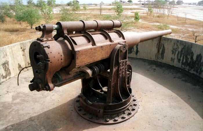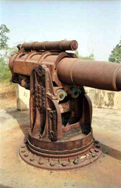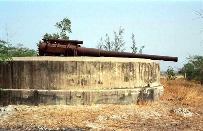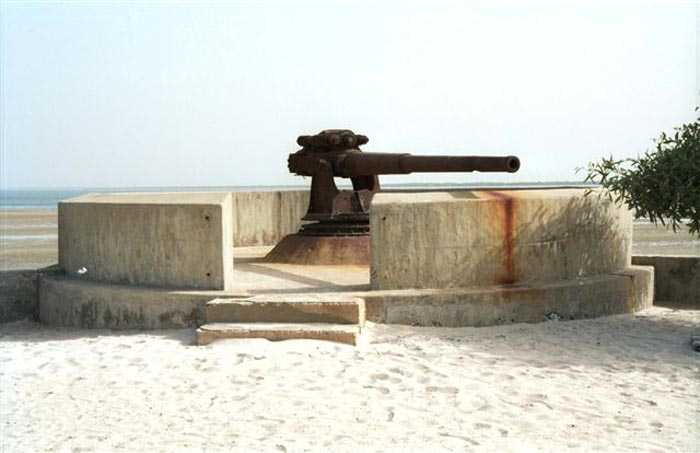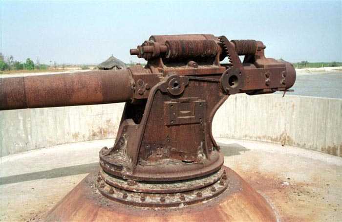 Battery installed in 1942 on the right bank of the Saloum, 15 kilometers from its mouth, for the advanced defense of the port of Kaolack. It is armed with a 100 mm gun of undetermined model on ship mounting, and a gun 138 mm Mle 1893 on ship mounting with cradle. These two pieces, coming from ships disarmed at Dakar, are installed in concrete pits. The 100 mm piece is placed right on the river bank, and the 138 mm piece, 50 meters behind. They are in fairly good condition, especially the 138 mm one. JJM 23/04/2008