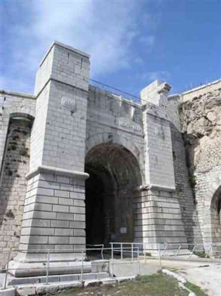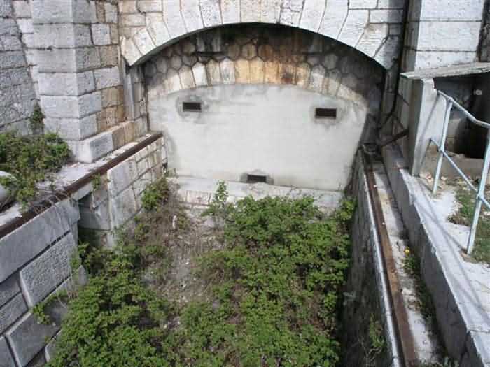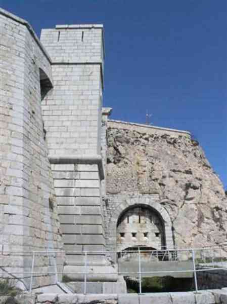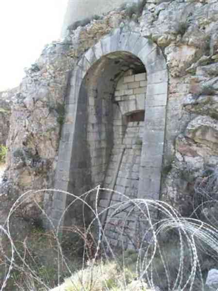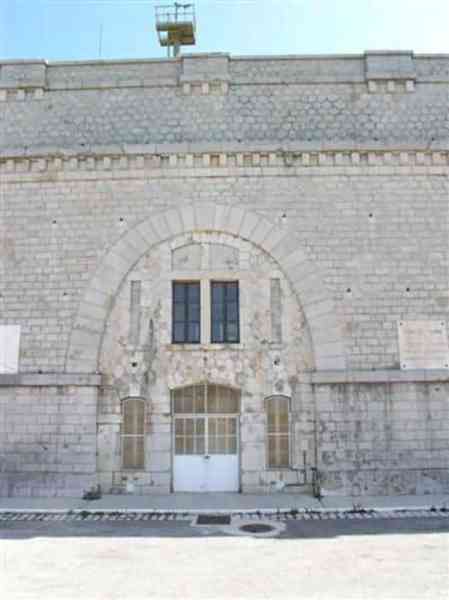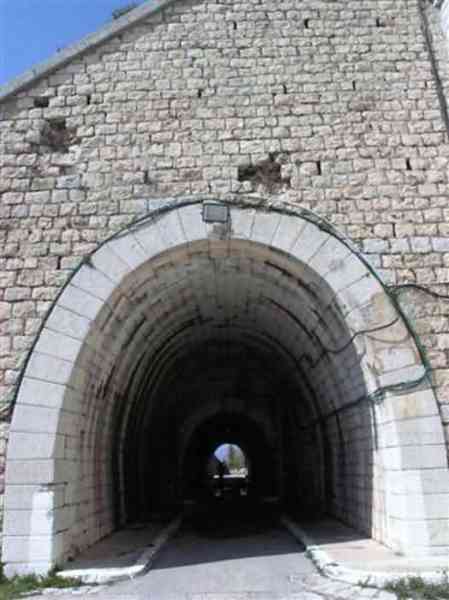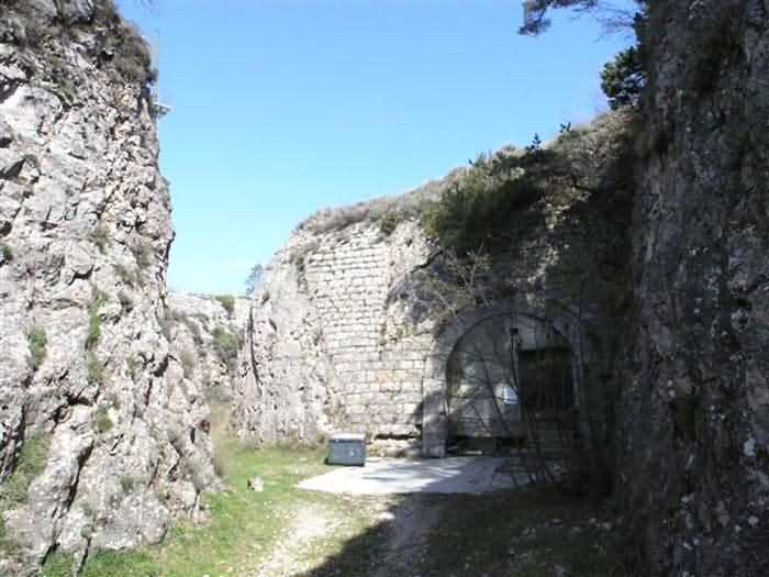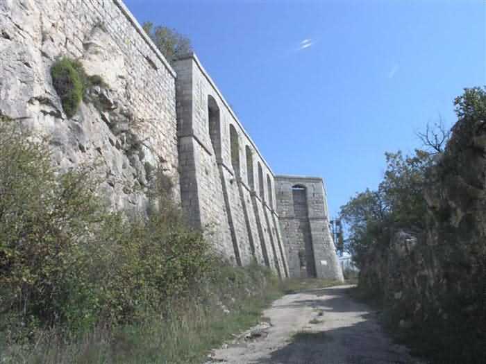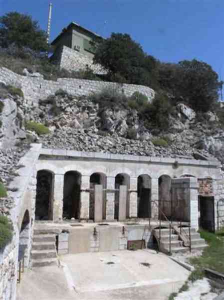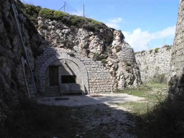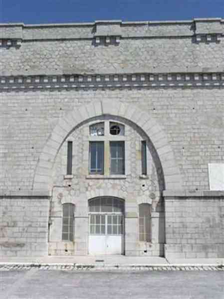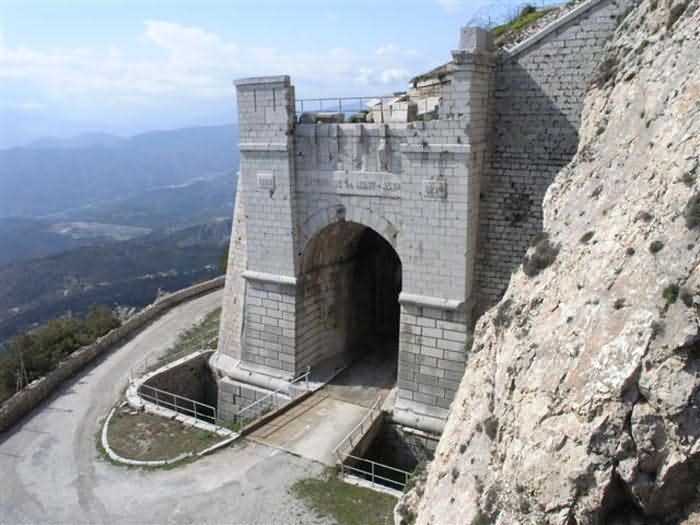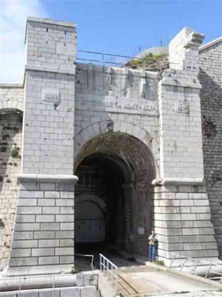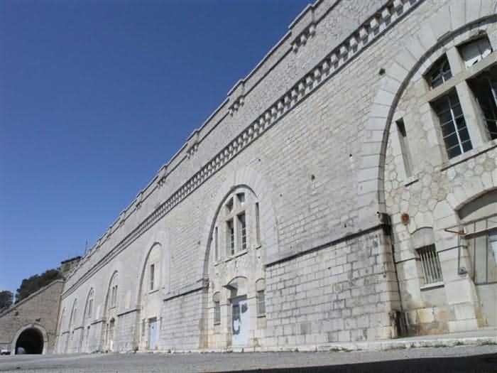 Fortress of Nice, east-north-east of the city, 1889-1892. 1148 m/alt. Named fort Catinat. Of the shape of an irregular parallelogram, the redoubt occupies the extreme west of the eponymous plateau. The visitor can only remain speechless upon arriving at the foot of the scarp, certainly one of the highest of all contemporary forts. In fact, only that of the fort of Six Fours in Toulon can rival it. Of a dazzling whiteness, the limestone plays better than any other with the cast shadows by the numerous embrasures for plunging fire, embrasures which are as many machicolations on arches. The road, in trench in the rock, runs along this scarp and joins the small south side of the parallelogram. Whereas at the fort of Six Fours one emerges facing an entrance of modest size, without common measure with the scarp, the entrance of the redoubt of Mont Agel, with a porch whose interior height is close to seven metres, certainly holds the record of France, always for the period 1874-1914 understand. Two enormous pilasters frame a porch with a barrel vault culminating at the start at about eight metres before initiating a rear splayed vault in quarter circle of the finest effect. Set back a few metres in this porch, the entrance properly speaking opens, in a second porch four metres high, slightly ogival this time, and surmounted by four embrasures. In the first porch, two cartouches recall that "on the surrender of an advanced place or delayed by a single day may depend the salvation of the country" and that the construction works of the redoubt took place under the direction of Captain of Engineers Chavardès. The facade extends in height over more than three metres, displaying in passing the cartouche of the name of the place, in full: FORTRESS of MONT-AGEL. Stone consoles leaning on this cartouche supported a balcony with murder holes which enhanced the whole by a good metre fifty additional, bringing the total height to about 12.5 m. Alas, shots from the naval artillery during the fights for the liberation of the city in 1944 brought down the central part of the top of the entrance, thus giving even more relief to the lateral pilasters. Like an English court, a pit was dug in front of the entrance. It was provided with a lateral sliding drawbridge folding back under a room dug into the rock to the right of the entrance, but set back several metres. Thus, and it is a unique case, we have a bridge of the aforementioned type in the open air, which is exceptional, but in addition, before being put to safety, it had to cross on its rails several metres, always in the open air. The withdrawal room is surmounted by a defensive cofferdam with two levels of embrasures. The entrance is protected by a mass of rock in place acting as counterscarp. A staircase allows to gain its tops arranged as a covered way. It is from here that one realizes that the entirety of the redoubt has been rock-cut and that, all in all, the masonries only cover the rock. Except along the west front (I-II), which front does not include a counterscarp, on the rest of the perimeter, the ditches were dug with explosives. The rock was, everywhere, left bare, except in places where the hazards of the limestone formation had provided hollows which could have been used by a possible assailant. Two double caponiers defend these ditches. The first, at salient III, takes in enfilade fronts II-III and III-IV. The second, at salient IV, takes charge of front IV-V (the entrance of the redoubt, slightly set back provides a fifth salient), but also a ditch attached to salient IV and running straight towards the east-north-east where it debouches on a precipice. This ditch had the mission to isolate the plateau, to bar any approach. These are rare cavern caponiers, whose faces are absolutely not defended, thus constituting dangerous dead angles. That of salient IV includes only rifle embrasures, as for that of salient II, its flanks have been transformed and we could not pronounce on this subject. The tunnel of the entrance is extremely long, about 30 metres. At the risk of repeating ourselves, the masonries only cover the rock; everything, including the court of the redoubt, has been dug into the mountain. When one emerges in this court, ideally on a sunny afternoon, the facade of the barracks surprises by its amplitude. Composed of seven bays aligned on two levels, its look is unique. Its bays are separated from one another by piers of nearly six metres width. Each bay is surmounted by a masonry arch, but, unique case, not round arch, but well slightly ogival. Captain Chavardès wanted to imprint his mark, and he fully succeeded. This barracks is a splendour. The quarters are surmounted by a wall four metres high nicely decorated with two setbacks and thirteen false brattices. The masons have moreover harmoniously alternated zones in headers and opus incertum. This barracks, were it not for its two levels, with its bays thus equidistant, has an air of cavern shelter… which it is besides! Conceded that for a cavern shelter, it nevertheless has some additional options, in fact all the attributes of a fort: various magazines, cisterns, subsistence, and…a rock powder magazine. Rare are the examples of forts combining a cavern shelter and a rock magazine, at most one can cite the Pipaudon in Toulon or still the work of the Côte d'Essert in Belfort (and still the barracks of the Côte d'Essert has no opening in the facade). Others, with variants, such as the fort Mont Chauve de Tourrette, respond more or less to this configuration but less clearly than at Mont Agel which is really a unique case. All the bays giving onto the court are connected on their rear by a circulation corridor. Whether on the ground floor or on the first floor, in the extension of the magazines and quarters (the ground floor had only one casemate devoted to lodging, namely the second counting from the left), beyond the circulation corridor, the piercing was extended over v