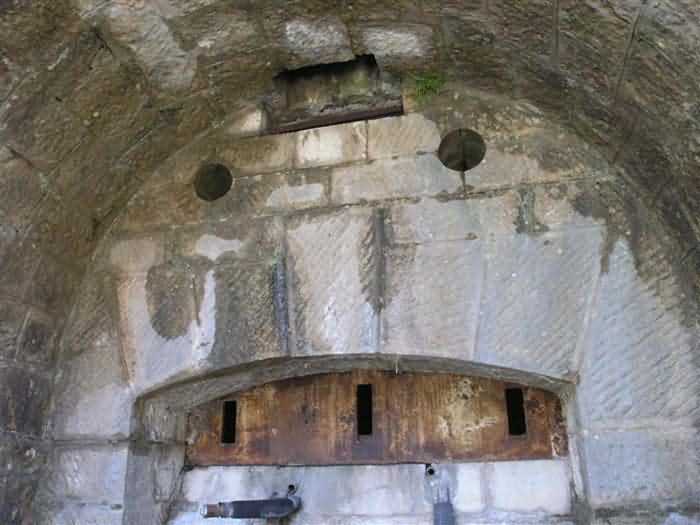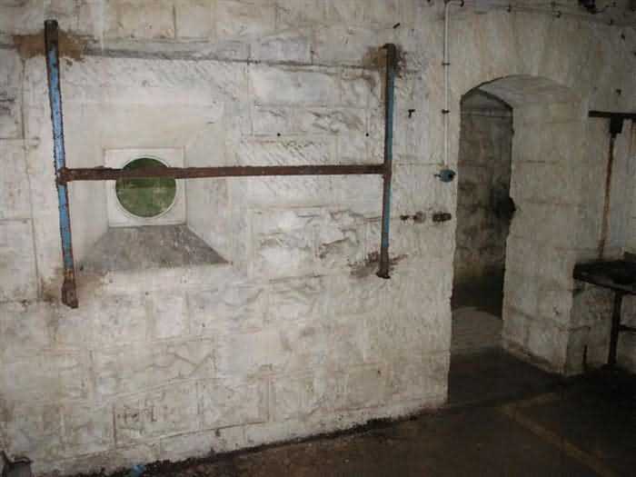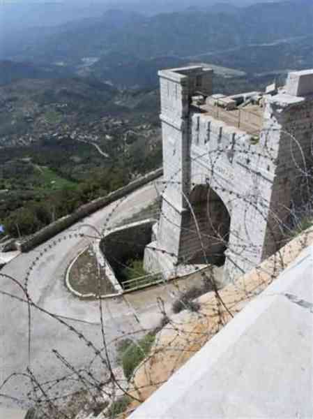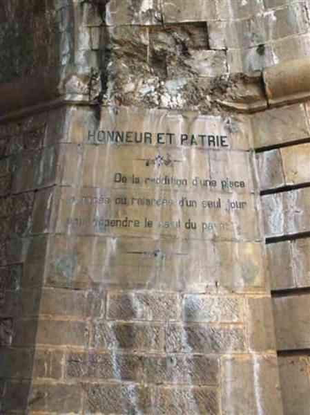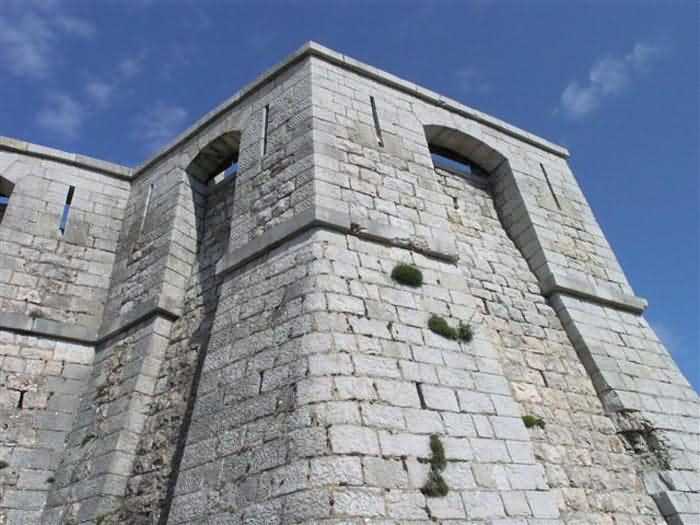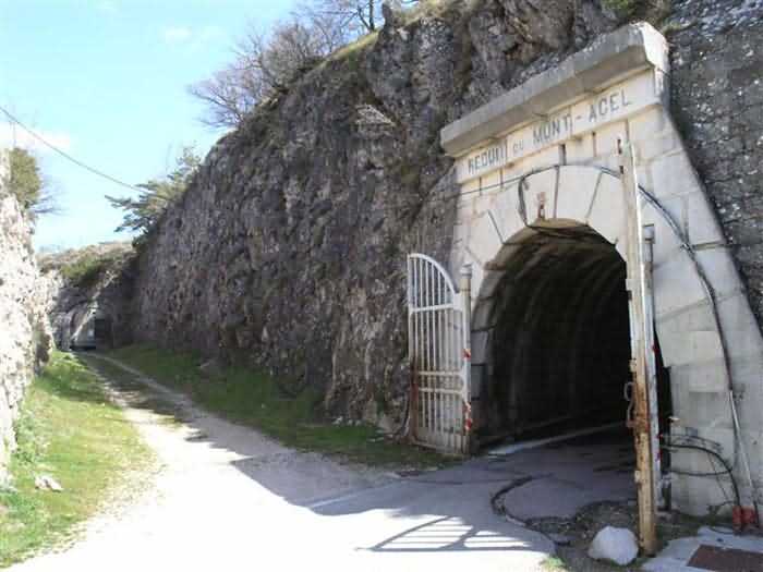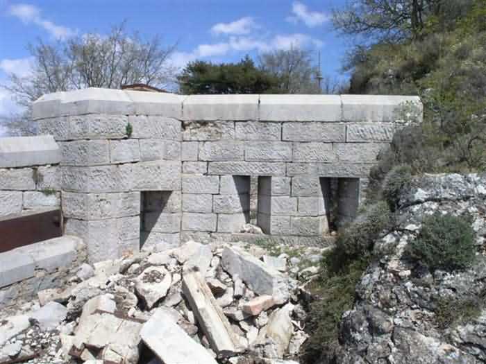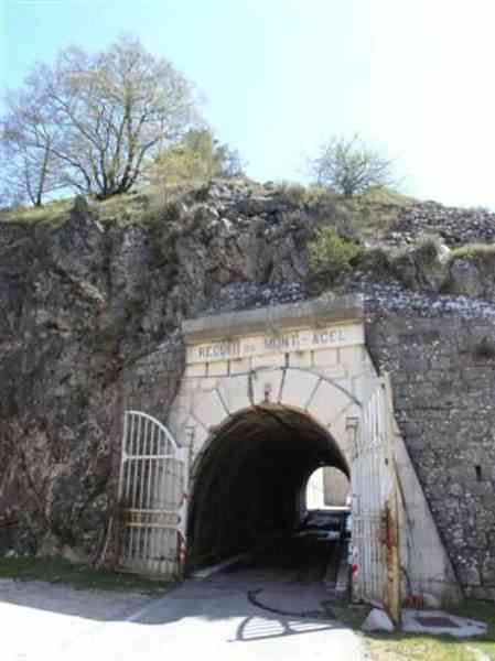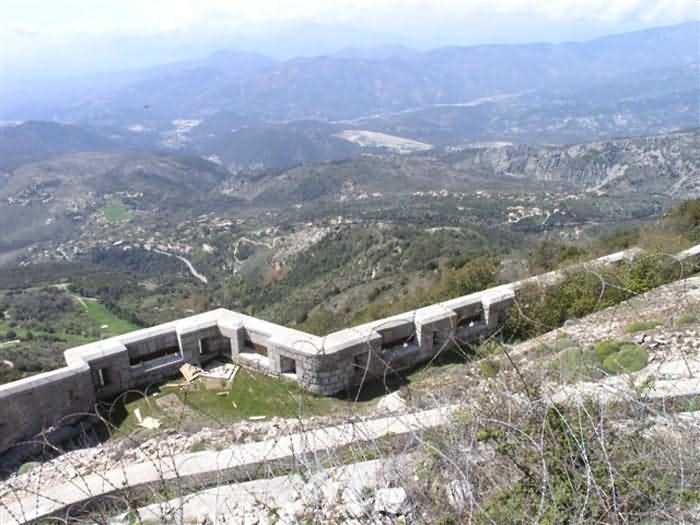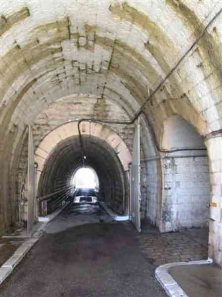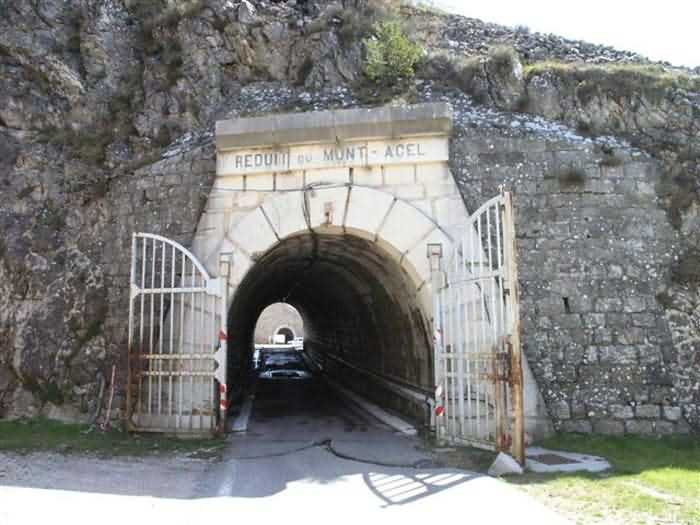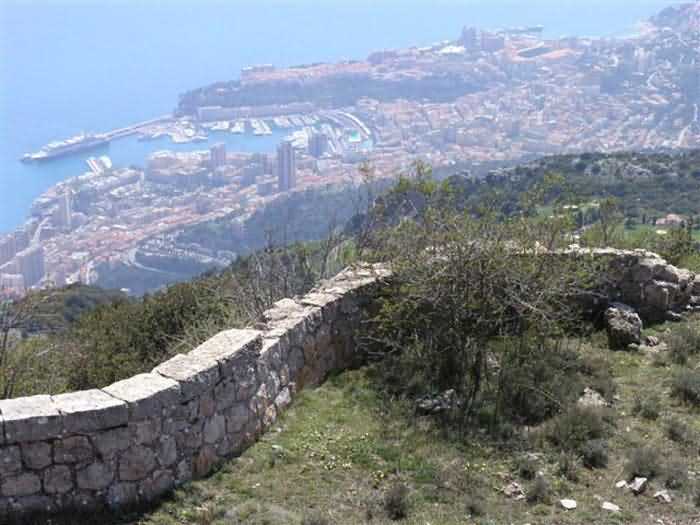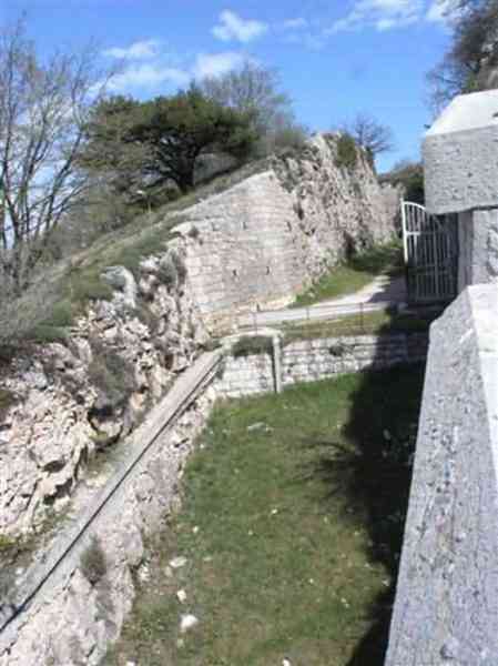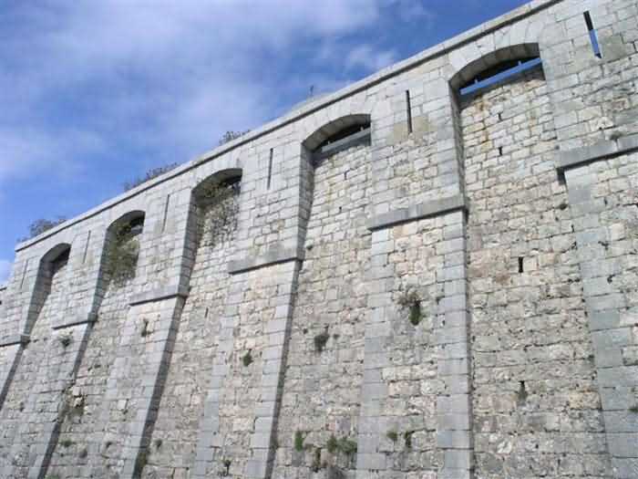 Fortress of Nice, east-north-east of the city, 1889-1892. 1148 m/alt. Named fort Catinat. Of the shape of an irregular parallelogram, the redoubt occupies the extreme west of the eponymous plateau. The visitor can only remain speechless upon arriving at the foot of the scarp, certainly one of the highest of all contemporary forts. In fact, only that of the fort of Six Fours in Toulon can rival it. Of a dazzling whiteness, the limestone plays better than any other with the cast shadows by the numerous embrasures for plunging fire, embrasures which are as many machicolations on arches. The road, in trench in the rock, runs along this scarp and joins the small south side of the parallelogram. Whereas at the fort of Six Fours one emerges facing an entrance of modest size, without common measure with the scarp, the entrance of the redoubt of Mont Agel, with a porch whose interior height is close to seven metres, certainly holds the record of France, always for the period 1874-1914 understand. Two enormous pilasters frame a porch with a barrel vault culminating at the start at about eight metres before initiating a rear splayed vault in quarter circle of the finest effect. Set back a few metres in this porch, the entrance properly speaking opens, in a second porch four metres high, slightly ogival this time, and surmounted by four embrasures. In the first porch, two cartouches recall that "on the surrender of an advanced place or delayed by a single day may depend the salvation of the country" and that the construction works of the redoubt took place under the direction of Captain of Engineers Chavardès. The facade extends in height over more than three metres, displaying in passing the cartouche of the name of the place, in full: FORTRESS of MONT-AGEL. Stone consoles leaning on this cartouche supported a balcony with murder holes which enhanced the whole by a good metre fifty additional, bringing the total height to about 12.5 m. Alas, shots from the naval artillery during the fights for the liberation of the city in 1944 brought down the central part of the top of the entrance, thus giving even more relief to the lateral pilasters. Like an English court, a pit was dug in front of the entrance. It was provided with a lateral sliding drawbridge folding back under a room dug into the rock to the right of the entrance, but set back several metres. Thus, and it is a unique case, we have a bridge of the aforementioned type in the open air, which is exceptional, but in addition, before being put to safety, it had to cross on its rails several metres, always in the open air. The withdrawal room is surmounted by a defensive cofferdam with two levels of embrasures. The entrance is protected by a mass of rock in place acting as counterscarp. A staircase allows to gain its tops arranged as a covered way. It is from here that one realizes that the entirety of the redoubt has been rock-cut and that, all in all, the masonries only cover the rock. Except along the west front (I-II), which front does not include a counterscarp, on the rest of the perimeter, the ditches were dug with explosives. The rock was, everywhere, left bare, except in places where the hazards of the limestone formation had provided hollows which could have been used by a possible assailant. Two double caponiers defend these ditches. The first, at salient III, takes in enfilade fronts II-III and III-IV. The second, at salient IV, takes charge of front IV-V (the entrance of the redoubt, slightly set back provides a fifth salient), but also a ditch attached to salient IV and running straight towards the east-north-east where it debouches on a precipice. This ditch had the mission to isolate the plateau, to bar any approach. These are rare cavern caponiers, whose faces are absolutely not defended, thus constituting dangerous dead angles. That of salient IV includes only rifle embrasures, as for that of salient II, its flanks have been transformed and we could not pronounce on this subject. The tunnel of the entrance is extremely long, about 30 metres. At the risk of repeating ourselves, the masonries only cover the rock; everything, including the court of the redoubt, has been dug into the mountain. When one emerges in this court, ideally on a sunny afternoon, the facade of the barracks surprises by its amplitude. Composed of seven bays aligned on two levels, its look is unique. Its bays are separated from one another by piers of nearly six metres width. Each bay is surmounted by a masonry arch, but, unique case, not round arch, but well slightly ogival. Captain Chavardès wanted to imprint his mark, and he fully succeeded. This barracks is a splendour. The quarters are surmounted by a wall four metres high nicely decorated with two setbacks and thirteen false brattices. The masons have moreover harmoniously alternated zones in headers and opus incertum. This barracks, were it not for its two levels, with its bays thus equidistant, has an air of cavern shelter… which it is besides! Conceded that for a cavern shelter, it nevertheless has some additional options, in fact all the attributes of a fort: various magazines, cisterns, subsistence, and…a rock powder magazine. Rare are the examples of forts combining a cavern shelter and a rock magazine, at most one can cite the Pipaudon in Toulon or still the work of the Côte d'Essert in Belfort (and still the barracks of the Côte d'Essert has no opening in the facade). Others, with variants, such as the fort Mont Chauve de Tourrette, respond more or less to this configuration but less clearly than at Mont Agel which is really a unique case. All the bays giving onto the court are connected on their rear by a circulation corridor. Whether on the ground floor or on the first floor, in the extension of the magazines and quarters (the ground floor had only one casemate devoted to lodging, namely the second counting from the left), beyond the circulation corridor, the piercing was extended over v