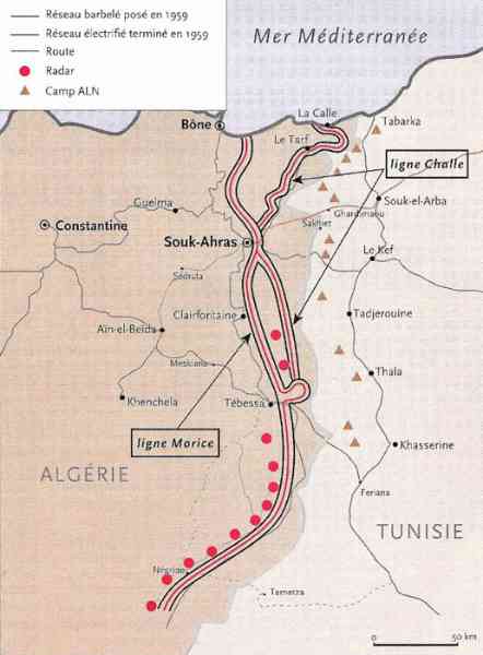 Je zřejmé, že pokud se pod opevněnou linií rozumí nepřerušovaná linie pevností a bunkrů, linie Morice této definici neodpovídala. Byla to dlouhá bariéra z ostnatého drátu s elektrifikovaným plotem o napětí 5 000 voltů a minovými poli, osvětlená světlomety a sledovaná radary tam, kde byla detekce možná. Každé překročení překážky bylo okamžitě hlášeno a lokalizováno přerušením elektrifikovaného plotu. Bunkry byly nahrazeny „branou“, tanky a polopásy, což nebyly nic jiného než mobilní bunkry. A záložními pluky, podporovanými letectvem a dělostřelectvem, pověřenými zadržováním vetřelců, kteří dokázali překážku překonat. Celkem měla „brána“ na konci roku 1957 šest obrněných pluků a zálohu zajišťovalo pět pluků „všeobecné zálohy“, tedy v tomto případě výsadkářů a cizinecké legie. Nemluvě samozřejmě o „sektorových“ jednotkách. Od 21. ledna do 28. května 1958 se rozpoutala „bitva o hranice“, která byla nejvýznamnější války v Alžírsku. Vyvrcholila v Souk-Ahras. Jednotky ALN, které se po čtyři měsíce pokoušely vynutit si průchod hranicí, byly zdecimovány. Ztráty byly na obou stranách těžké. Dne 23. dubna 1958 v Ghardimaou se štáb ALN z politických i taktických důvodů rozhodl nechat překážku současně prolomit třemi faïleky (prapory), tedy asi 3 000 bojovníky. Tyto jednotky byly velmi dobře vycvičené a lépe vyzbrojené než většina francouzských pluků, kterým měly čelit. Kulomety MG 42 zejména převyšovaly FM 24-29 a dokonce i AA 52, které se zaváděly u výsadkových pluků. Průchod jednotek ALN proběhl v noci z 27. na 28. dubna. Překážka je rychle odhalila a jejich pronásledování a zničení vedly ke střetům nebývalé zuřivosti, jakou tato válka dosud neznala. Jako příklad, in memoriam, uveďme 3. rotu 9. pluku RCP (Régiment de Chasseurs Parachutistes – Pluk výsadkových myslivců) kapitána Beaumonta na hoře Džabal Muádžin [36.217285, 7.895737], 9 kilometrů jihozápadně od Souk-Ahras, 29. dubna 1958. V 15 hodin byla vyloděna z vrtulníků na této hoře, jediné vhodné přistávací zóně v sektoru, a rota narazila přímo na dvě katiby (roty) 4. faïleku ALN. Stopy jeho průchodu o dvě noci dříve, zákopy vyhloubené pod překážkou, byly zaznamenány „branou“. Francouzské velení tedy vědělo o přítomnosti nepřítele, ale neznalo jeho počet, záměr a postavení. Obě katiby odpočívaly, soustředěny na a kolem kóty 749, která označuje severovýchodní konec hory Muádžin. Čekaly na noc, aby mohly pokračovat v postupu na západ. Byly samozřejmě ve střehu. Když uslyšely přilétat vrtulníky, zaujaly bojová postavení. Výsadkáři byli skoseni palbou z kulometů MG ihned při přistání vrtulníků. Několik z nich bylo zasaženo. Strhla se strašlivá bitva. Třikrát zraněný, kapitán Beaumont zemřel vstoje poté, co rádiem požádal o nemožný svržen munice. Jeho radista, myslivec Desmares, byl zabit po jeho boku. Poté poručík Thierry, seminarista a pozoruhodný velitel, rotmistr Pfender, rotmistr Colle, desátník Andrejak, který před smrtí schoval svůj 57mm kanón do křoví, myslivec Briswalter, který káral své kamarády a nechtěl ustoupit ani o píď země, myslivec Rioton, střelec z lehkého kulometu, zabitý u svého kusu, když chránil soustředění roty, a mnozí další, kteří zde nemohou být všichni jmenováni. Když se 3. rota konečně kolem 18. hodiny mohla vyprostit s pomocí jednotek, které dorazily jako posily, zejména 2. roty kapitána Gueguena, ztratila 28 mužů, včetně kapitána Beaumonta a poručíka Thierryho. Měla také 28 zraněných. Dodejme, že 9. pluk RCP, kterému velel podplukovník Buchoud, byl pluk složený převážně z odvedenců, stejně jako většina jednotek nasazených v bitvě u Souk-Ahras. Alžírská válka byla skutečnou válkou, a ne tou, kterou po 64 let vyprávějí někteří shovívaví nebo špatně informovaní autoři. Od roku 1958 byla zahájena stavba druhé linie, zdvojující první co nejblíže hranici, linie Challe. Na jihu, mezi Tébessou a Négrine, byla instalována dělostřelecká postavení s radarem řízenou palbou. Na alžírsko-marocké hranici začaly práce již v listopadu 1956 z iniciativy generála Pédrona, velitele armádního sboru Oran. Ještě více než na východě se často pouštní terén hodil pro instalaci radarem řízených baterií. Celkem se hraniční zábrany se svými zdvojenými úseky a propojkami rozkládaly na 2 600 kilometrech. Tato poslední francouzská opevněná linie se ukázala jako mimořádně účinná, protože vedla k téměř úplnému zničení udušením ALN z „vnitrozemí“, které již nemohlo být zásobováno z Tuniska a Maroka.
