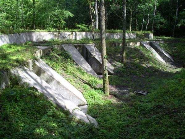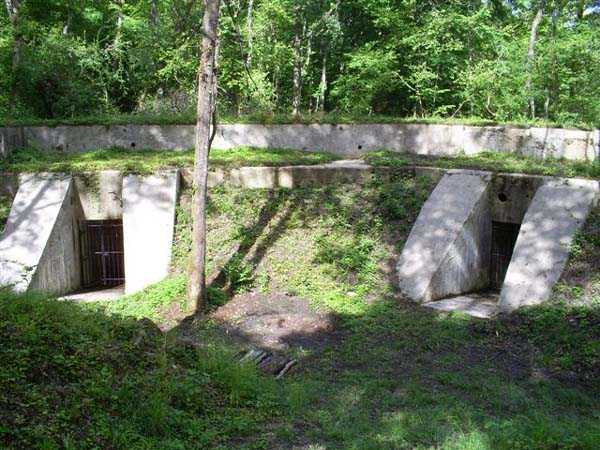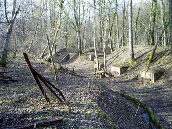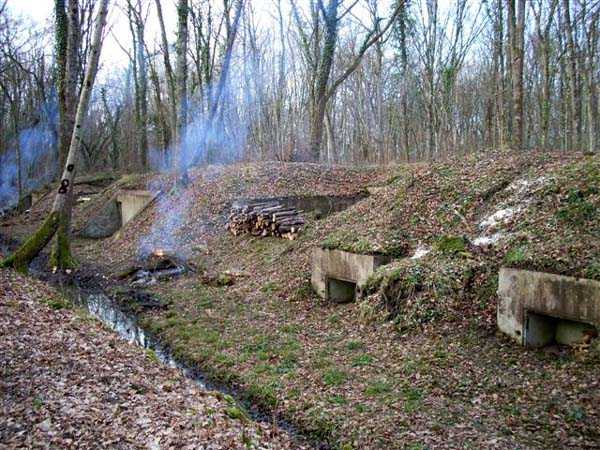 Toul fortified camp, NE of the city. 1887. 225 m/alt. Small infantry fort about 1100 m behind the fort of Vieux-Canton. Originally, it was a semicircular infantry fort, whose ditch with crumbling earth escarpment only occupied the front, and which was equipped with 1 to 3 small section shelters, barely buried and equipped with stone benches. In 1907, a structure was concreted, the plan of which was derived from that of a combat shelter, but improved with three entrances, two rooms for personnel, a telegraph station, latrines, a post for the commander, and a room for a machine gun section. It has a chevron shape and its sky slab is flush with the surrounding terrain.
