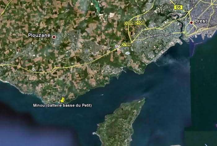 Festung von Brest, Norden der Enge, 1887-1888. Zuerst, bereits 1876, erwägt man eine Brechbatterie, eventuell unter Turm. 1882 schlug man eine Brechbatterie von 2 × 32 c vor, die auf Barbette schießt. Endgültig ist es eine kasemattierte Brechbatterie, in den Felsen gegraben und bewaffnet mit 2 Marinekanonen 32 c Modell 1870-84 auf M-Lafetten Modell 1888, die knapp über der Meeresoberfläche schießen, die man installieren wird. Das Sitzungsprotokoll der Kommission für Küstenverteidigung vom 19. Februar 1886 meldet sie als in erster Dringlichkeit zu bauen. Von einem sehr einfachen Plan stieg man dort über eine Treppe hinab, an deren Fuß und zu deren Linken sich ein kleines Pulvermagazin befand. Sechs Meter weiter befand sich, rechts, der erste der Geschützkeller, dem unmittelbar der zweite folgte. Diese Geschützkeller maßen zwölf Meter Länge und waren durch eine Mauer von drei Metern Dicke geschützt. Sie wurde im August 1915 außer Dienst gestellt. Die Batterie wurde umgebaut, insbesondere durch die Franzosen nach dem zweiten Weltkrieg. Der Zugangstreppe, gelegen im gedeckten Durchgang des Eingangs des alten Forts, wurde durch eine dicke Panzertür versperrt und die Schießscharten wurden betoniert. Heute ist das Innere unzugänglich und vor die Schießscharten hinabzusteigen erweist sich als eine ziemlich gefährliche Übung. Siehe Stellung des Minou.