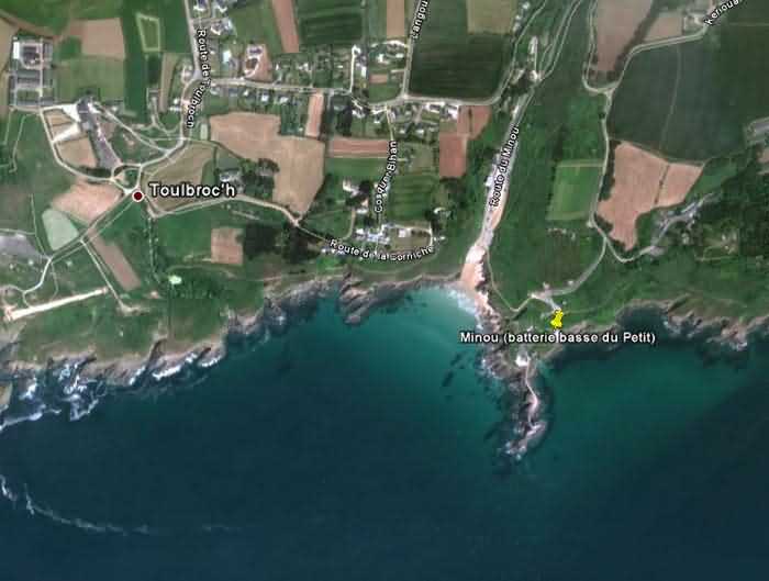 Pevnost Brest, sever průlivu, 1887-1888. Nejprve, již roku 1876, uvažuje se o průlomové baterii, eventuálně pod věží. Roku 1882 byl navržen průlomová baterie 2 × 32 c střílející na barbetu. Nakonec je to kasematovaná průlomová baterie, vyhloubená ve skále a vyzbrojená 2 námořními děly 32 c model 1870-84 na M lafetách model 1888, střílející těsně nad hladinou moře, která bude instalována. Zápis Komise pro obranu pobřeží z 19. února 1886 ji uvádí jako stavět v první naléhavosti. Velmi jednoduchého půdorysu, sestupovalo se tam po schodišti, u jehož paty a nalevo se nacházel malý prachový sklad. Šest metrů dále se nacházel, vpravo, první z dělostřeleckých sklepů bezprostředně následovaný druhým. Tyto dělostřelecké sklepy měřily dvanáct metrů délky a byly chráněny zdí tři metry tlustou. Byla odzbrojena v srpnu 1915. Baterie byla přestavěna, zejména Francouzi po druhé světové válce. Přístupové schodiště, ležící v kryté chodbě vchodu starého fortu, bylo zataraseno tlustými pancéřovými dveřmi a střílny byly zabetonovány. Dnes je vnitřek nepřístupný a sestoupit před střílny se ukazuje jako dosti riskantní cvičení. Viz postavení Minou.