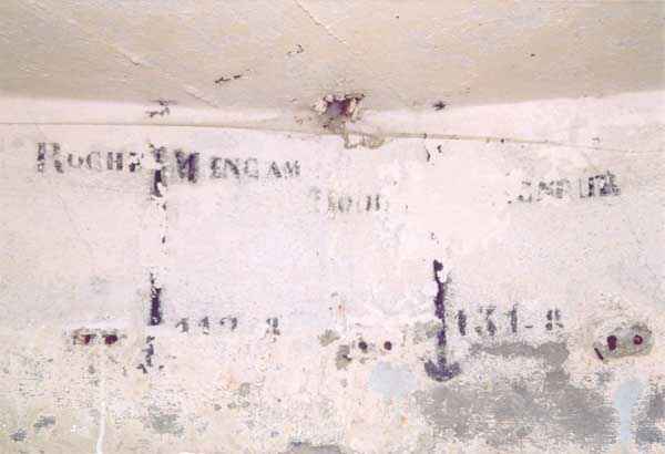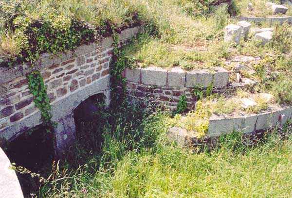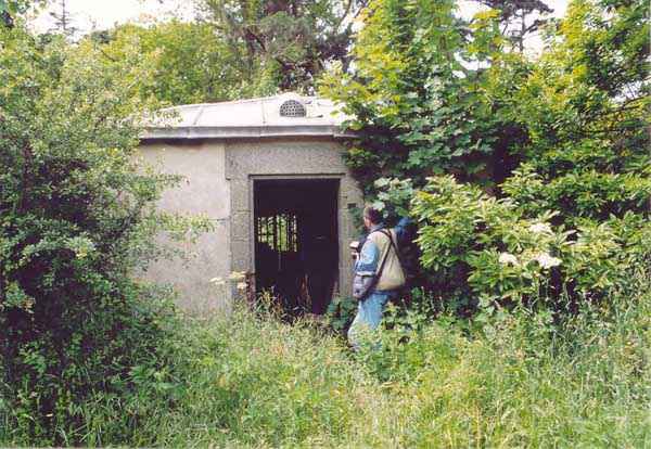 Fortress of Brest, north of the strait. Decided in 1888, the construction of 12 batteries of 6 × 100 mm was only materialized by the development of 5 of them including 2 with 6 pieces and 3 with 4 pieces. The one with 6 pieces of Minou was built in 1896-1897. Its M guns 100 mm model 1881 quick fire on M mounts model 1897 P.C. are still listed in the armament states of 1900 and 1914. It was developed, at the extreme east of the position east of the hamlet of Kérangoff. It consists of a line of 6 emplacements for guns of 100 mm. It is located on the lands of the lord of the manor of Kérangoff who made the road leading to the hamlet of the same name a private way. Fortunately, from the road leading to the old fort of Minou, a communal path leads directly to the battery which is in a very good state of preservation. A fine well is located a little behind the firing emplacements. On the right of the latter is a small concreted shelter topped with an observation post and, on their left, a second observation post (cast in 1904). A third, in concrete and having preserved some wall inscriptions, is located a little in front of the battery, but it dates from the Interwar period. From its visor, one embraces the entire west face of the peninsula of Roscanvel. We will note, finally, the small guardhouse at the entrance of the battery, which has preserved its original frame and, above all, an unusual roof ventilation device. See position of Minou.