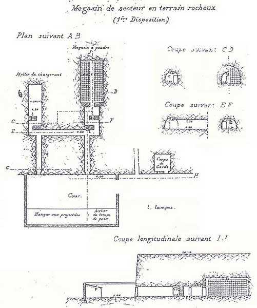 In each stronghold, one finds central magazines, of large capacity. They supply sector magazines which themselves supply intermediate depots which are responsible for supplying battery magazines. The sector magazines and intermediate depots are often dug into the rock, but not always, especially concerning the intermediate depots. This structure does not exist in all strongholds.
