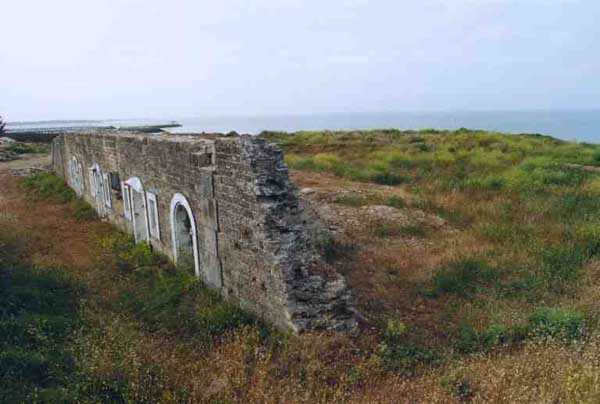Dépt 56 (Morbihan) Presqu'île de Quiberon. Situé au sud-est du port Haliguen, à la pointe de Riberan. Ancienne batterie complètement remaniée en 1879 et 1880 (parfois 1883 est renseigné) et comportant une petite caserne de 3 chambrées et 3 traverses-abris. L'armement prévu se portait à 3 canons de 24 c Mle 1876 G et 6 de 95 mm. Lors de notre passage sur place le 15 juin 2005, nous n'avons pu que constater que seules demeuraient l'enceinte et la façade du casernement. Les traverses-abris, les plates-formes de tir et le magasin à poudre, tout avait été arasé.