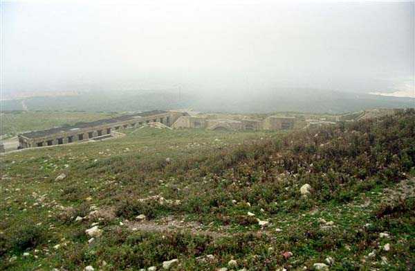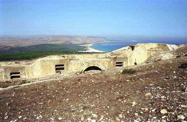 Bizerte. The Nador work is built on Djebel Nador, which peaks at 261 meters, south of Cape Blanc. Built in 1900, it housed, in 1914, an infantry company and a battery of 4 G guns 95 Mle 1888 on carriage G Mle 1904, whose mission was to prevent a landing on the beaches of Oued Damous, northwest of Bizerte. It is a very simple construction, its gorge wall pierced with rifle loopholes. This wall, against which the quarters are placed, is defended by a caponier, which also flanks the northwest side of the defensive grill that surrounds the rest of the work. Another caponier provides flanking for the northeast and north sides of the same grill. The east side is defended by a tower, defined as an optical post in the engineering plan, but which one could just as well call a redoubt. The work has a small cavern magazine. It also houses, within its enclosure, the Cape Blanc semaphore. In 1940, only 2 guns 95 remain, forming the Cape Blanc warning battery. Nowadays, the site is still military, the semaphore still operational. The defensive grill has disappeared. Nearby, one can see the auxiliary FCB of the main artillery battery at Metline, built in 1942, which remained at the shell construction stage. JJM 14/10/07