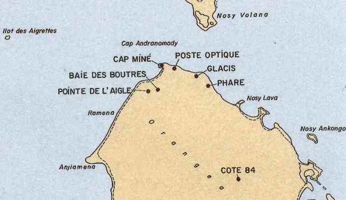 Diega-Suarez. Le groupe d’Orangéa est, de loin, le plus important du front de mer. En effet, c’est lui qui est chargé de la défense des approches et de l’entrée de la baie de Diego-Suarez. Les autres fronts étant chargés, en 1914, de la défense intérieure de la baie. Il est donc pourvu de tous les éléments que l’on peut trouver dans les grands ports de guerre métropolitains, batterie de rupture, de mortier, de bombardement, et légère à tir rapide. En 1942, la batterie de la Cote 84 répond aux derniers standards, mais ce n’est qu’une batterie d’artillerie secondaire, incapable d’opposer une résistance prolongée à des cuirassés, ou même à des croiseurs lourds. Die Gruppe Orangéa ist bei weitem die wichtigste der Küstenfront. Tatsächlich ist sie für die Verteidigung der Anfahrtswege und des Eingangs zur Bucht von Diego-Suarez zuständig. Die anderen Fronten waren 1914 für die innere Verteidigung der Bucht zuständig. Sie ist daher mit allen Elementen ausgestattet, die man in den großen Kriegshäfen des Mutterlandes finden kann: Sperrbatterie, Mörserbatterie, Bombardierungsbatterie und leichte Schnellfeuerbatterie. 1942 entspricht die Batterie der Höhe 84 den neuesten Standards, ist aber nur eine Sekundärartilleriebatterie, die unfähig ist, Schlachtschiffen oder sogar schweren Kreuzern längeren Widerstand zu leisten. De groep Orangéa is verreweg de belangrijkste van het zeefront. Immers, het is deze die belast is met de verdediging van de toegangen en de ingang van de baai van Diego-Suarez. De andere fronten waren in 1914 belast met de binnenverdediging van de baai. Het is dus voorzien van alle elementen die men in de grote oorlogshavens van het moederland kan aantreffen: sperbatterij, mortierbatterij, bombardementsbatterij en lichte snelvuurbatterij. In 1942 voldoet de batterij van Hoogte 84 aan de laatste normen, maar het is slechts een secundaire artilleriebatterij, niet in staat om langdurig weerstand te bieden aan slagschepen of zelfs zware kruisers. The Orangéa group is, by far, the most important of the seafront. Indeed, it is the one responsible for the defence of the approaches and the entrance to the Bay of Diego-Suarez. The other fronts being responsible, in 1914, for the interior defence of the bay. It is therefore provided with all the elements that can be found in the major metropolitan war ports: blocking battery, mortar battery, bombardment battery, and light rapid-fire battery. In 1942, the Contour 84 battery meets the latest standards, but it is only a secondary artillery battery, incapable of offering prolonged resistance to battleships, or even heavy cruisers. Skupina Orangéa je zdaleka nejdůležitější na pobřeží. Je totiž pověřena obranou přístupů a vjezdu do zátoky Diego-Suarez. Ostatní fronty byly v roce 1914 pověřeny vnitřní obranou zátoky. Je tedy vybavena všemi prvky, které lze nalézt ve velkých válečných přístavech metropole: zábranná baterie, minometná baterie, bombardovací baterie a lehká rychlopalná baterie. V roce 1942 baterie Kóta 84 splňuje nejnovější standardy, ale je to pouze baterie sekundárního dělostřelectva, neschopná klást delší odpor bitevním lodím nebo dokonce těžkým křižníkům. © JJM 25/03/2026