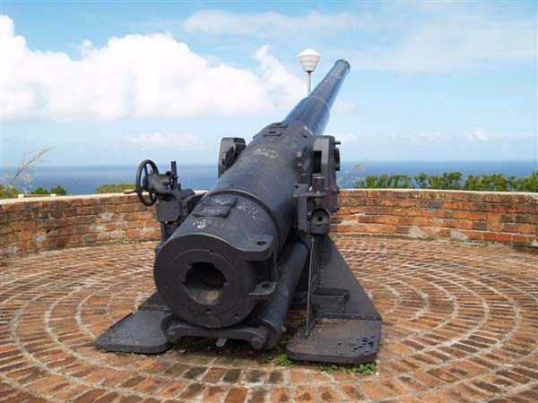 Nouméa. La batterie de Ouen Toro, ou du Ouen Toro, est située à la cote 128, à l’extrémité sud de la presqu’île de Nouméa. Réalisée en 1897, elle est armée de 4 canons M de 19 cm Mle 1870 N° 1, provenant du désarmement de la corvette cuirassée Thétis. L’armement de ce navire de 3 569 tonnes, lancé en 1867, comprenait 6 canons de ce modèle, dont 4 sur affût à châssis bas de réduit, et 2 en deux tourelles barbettes. Les 2 pièces de tourelle armeront la batterie d’Ouémo. Ce matériel, d’un calibre réel de 194 mm, expédie à 9 000 mètres, à l’angle de 30°, un obus en fonte, chargé à la mélinite, d’un poids de 78 kg. La vitesse initiale de 448 m/s est obtenue par une charge de 5,180 kg de poudre BM 3. Mais, avec les affûts à châssis bas, la portée ne dépasse pas 5 000 mètres. Cet armement ne donne pas satisfaction, et un ordre du général inspecteur de l’artillerie recommande de ne l’employer qu’avec circonspection… C’est pourquoi il est remplacé en 1902 par 4 canons M de 19 cm Mle 1870-93, sur affût M Mle 1886 PC. Ce matériel moderne expédie le même projectile à 10 000 mètres, à l’angle de 20°, avec une vitesse initiale de 675 m/s, obtenue avec une charge de 13,900 kg de poudre BM 7. Cette batterie est déclassée en 1913, puis réarmée avec du personnel de l’aviso Kersaint en septembre 1914, après le bombardement de Papeete par les croiseurs cuirassés de l’escadre de l’amiral von Spee. Elle est à nouveau désarmée après la destruction des navires allemands à la bataille des Falkland, le 11 décembre 1914. Son matériel est démonté et renvoyé en métropole en octobre 1917. La batterie de Ouen Toro est la seule de Nouméa à répondre aux normes en vigueur à cette époque dans la métropole. Elle possède un magasin caverne avec monte-charge, et un magasin à projectiles bétonné. Malheureusement, il ne reste pratiquement plus rien à voir en surface de ce bel ouvrage, tant la Marine nationale, propriétaire actuel des lieux, les a transformés pour y construire un centre de transmission, hérissé d’antennes et gardé comme une forteresse. Les magasins souterrains existent peut-être encore, mais il ne nous a pas été donné de les voir. Il resterait sur le site 2 tubes de 19 cm Mle 1870 N° 1, mais nous n’avons pu en voir qu’un, bizarrement placé sur un châssis d’affût Mle 1847 bricolé. De l’ouvrage proprement dit, on ne voit plus qu’un porche maçonné, dont la clé de voûte porte un chronogramme, daté 1897. À leur arrivée, en juillet 1941, les Australiens installent, en contrebas de l’ouvrage, 2 pièces de 6 Inch Mark IV. Ces matériels, fabriqués en 1900 et 1901, proviennent d’un navire néo-zélandais désarmé. Ils sont placés sur des plateformes bétonnées, décorées de briques rouges, et partiellement protégées par un mur de béton, également recouvert de briques. Un PDT, placé en arrière des pièces et aujourd’hui disparu, assure la conduite du tir. Nous ignorons la portée de ces canons, mais, compte tenu de l’angle de tir autorisé par la faible hauteur des affûts, elle ne devait pas dépasser 15 000 mètres. Ces pièces sont encore en très bon état, mais hélas très taguées. En août 1942, une batterie du 244th Coast Artillery Regiment de l’US Army installe ses 4 canons de 155 mm M1 « long tom » sur le Ouen Toro. Le canon de 155 M1, est une amélioration du canon de 155 GPF français. Il peut expédier un obus de 43 kg à près de 24 000 mètres, avec une vitesse initiale de 853 m/s. Deux pièces sont disposées, sur plateforme bétonnée, dite « Kelly » mount, qui permet le tir sur 360°, sur les superstructures de l’ancienne batterie française. Les 2 autres sont placées, sur des plateformes identiques, sur le petit Ouen Toro, replat situé à mi-pente et à l’ouest du Ouen Toro. Outre les 2 emplacements de pièces, la position comprend une petite construction bétonnée, à usage de soute ou d’abri, et un bâtiment à usage de casernement dont il ne reste que les fondations. Sur une des 2 plateformes, on peut lire, gravés dans le béton, les noms des servants, comme c’est souvent le cas dans les installations américaines réalisées au cours de la Seconde Guerre mondiale. Les matériels et leurs servants partent pour Guadalcanal en janvier 1943. JJM 30/06/07