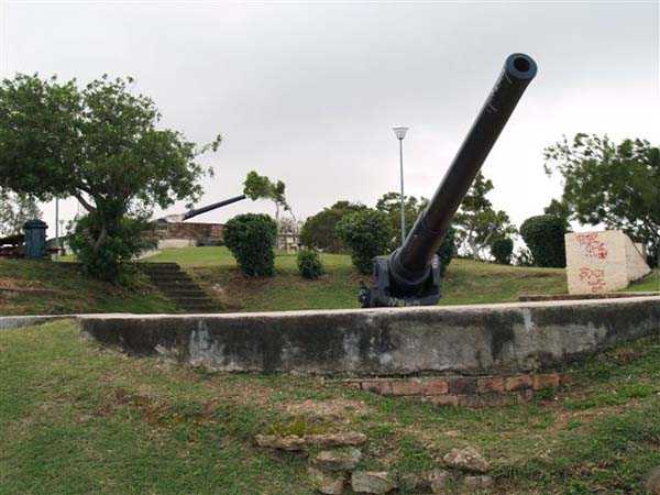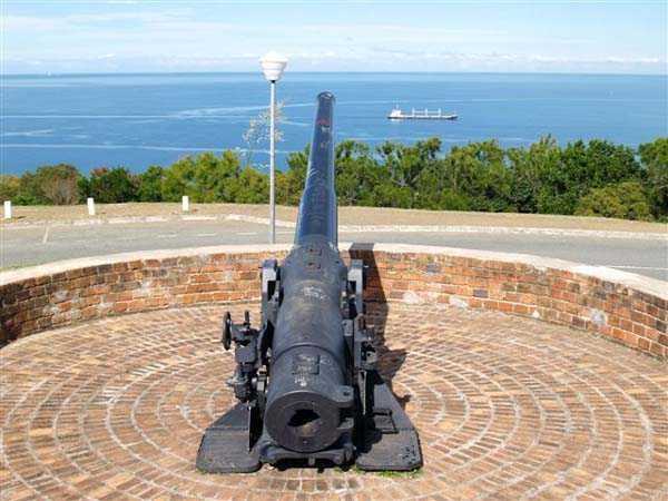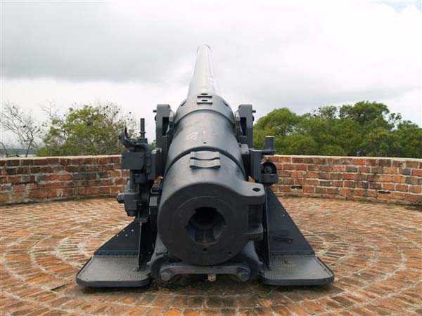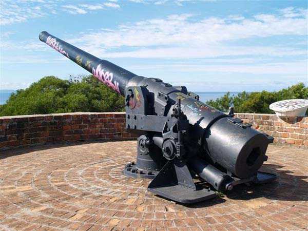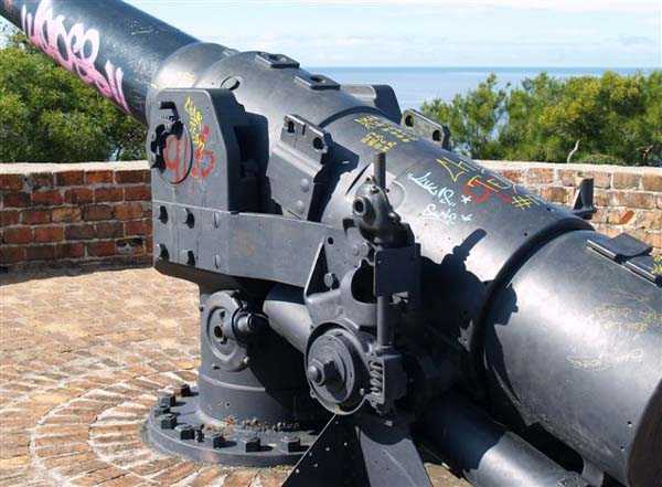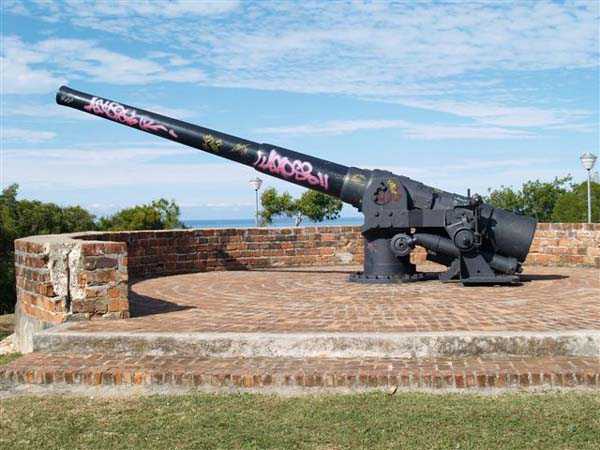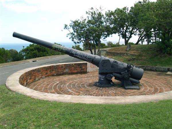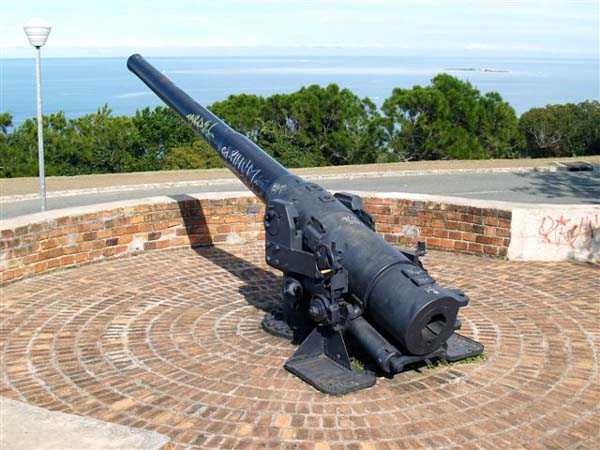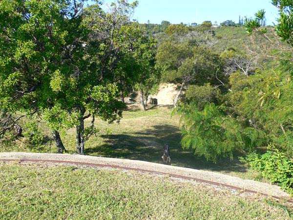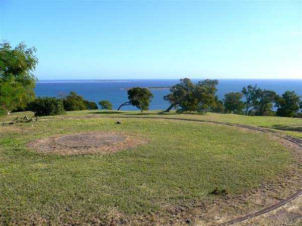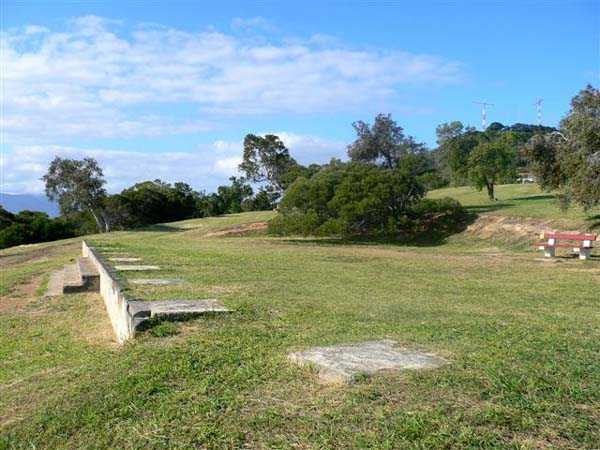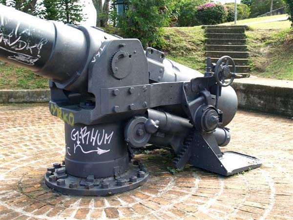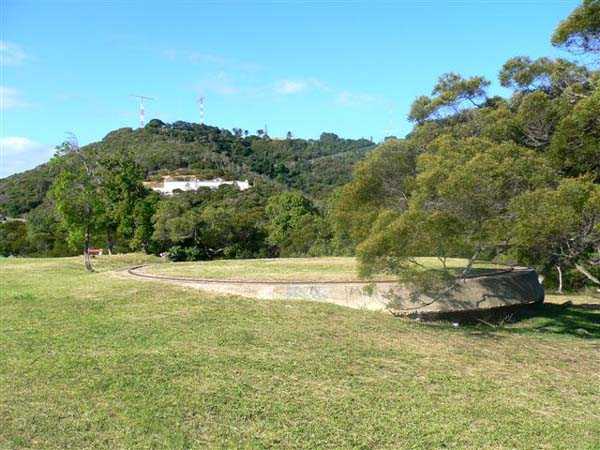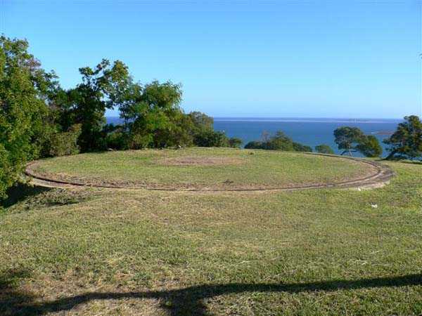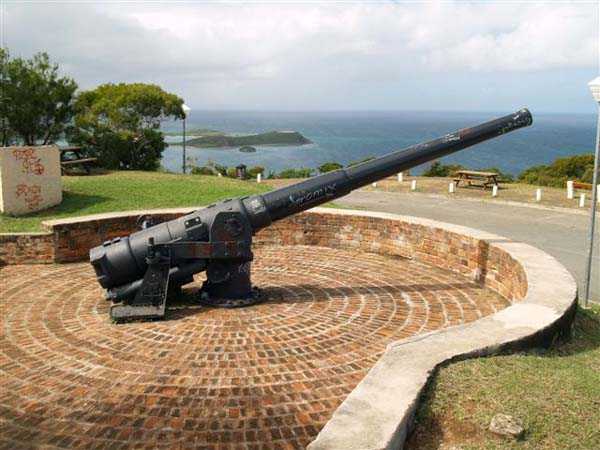 Nouméa. Die Batterie Ouen Toro, oder du Ouen Toro, liegt auf Höhe 128 am südlichen Ende der Halbinsel von Nouméa. 1897 erbaut, ist sie mit 4 M-Kanonen 19 cm Mle 1870 Nr. 1 bewaffnet, die von der Außerdienststellung des Panzerkorvettes Thétis stammen. Die Bewaffnung dieses 1867 vom Stapel gelaufenen Schiffs von 3 569 Tonnen umfasste 6 Kanonen dieses Modells, davon 4 auf Niedrigwagenlafetten für Reduits und 2 in zwei Barbettetürmen. Die beiden Turmgeschütze werden die Batterie Ouémo bewaffnen. Dieses Material, mit einem tatsächlichen Kaliber von 194 mm, verschießt auf 9 000 Meter bei einem Höhenwinkel von 30° einen mit Melinit gefüllten Gussgranaten mit einem Gewicht von 78 kg. Die Mündungsgeschwindigkeit von 448 m/s wird mit einer Ladung von 5,180 kg BM 3-Pulver erreicht. Doch mit den Niedrigwagenlafetten übersteigt die Reichweite 5 000 Meter nicht. Diese Bewaffnung ist unbefriedigend, und eine Anordnung des Generalinspekteurs der Artillerie empfiehlt, sie nur mit Vorsicht einzusetzen… Daher wird sie 1902 durch 4 M-Kanonen 19 cm Mle 1870-93 auf M-Lafette Mle 1886 PC ersetzt. Dieses moderne Material verschießt das gleiche Geschoss auf 10 000 Meter bei 20° Erhöhung, mit einer Mündungsgeschwindigkeit von 675 m/s, die mit einer Ladung von 13,900 kg BM 7-Pulver erreicht wird. Die Batterie wird 1913 außer Dienst gestellt, dann im September 1914, nach dem Beschuss von Papeete durch die Panzerkreuzer des Geschwaders von Admiral von Spee, mit Personal des Avisos Kersaint neu bewaffnet. Sie wird nach der Zerstörung der deutschen Schiffe in der Schlacht bei den Falklandinseln am 11. Dezember 1914 wieder abgerüstet. Ihr Material wird abgebaut und im Oktober 1917 ins Mutterland zurückgeschickt. Die Batterie Ouen Toro ist die einzige in Nouméa, die den damals im Mutterland geltenden Normen entspricht. Sie besitzt ein Kavernenmagazin mit Aufzug und ein betoniertes Geschossmagazin. Leider ist an der Oberfläche von diesem schönen Werk praktisch nichts mehr zu sehen, so sehr hat die nationale Marine, derzeitige Eigentümerin des Geländes, es umgebaut, um dort ein Nachrichtenzentrum zu errichten, das mit Antennen gespickt und wie eine Festung bewacht ist. Die unterirdischen Magazine existieren vielleicht noch, aber wir hatten nicht die Gelegenheit, sie zu sehen. Am Standort sollen noch 2 Rohre 19 cm Mle 1870 Nr. 1 vorhanden sein, aber wir konnten nur eines sehen, seltsam platziert auf einem zusammengebastelten Lafettenfahrgestell Mle 1847. Vom eigentlichen Werk sieht man nur noch ein gemauertes Portal, dessen Schlussstein ein Chronogramm trägt, datiert 1897. Bei ihrer Ankunft im Juli 1941 installieren die Australier unterhalb des Werks 2 Geschütze 6 Inch Mark IV. Diese Geräte, gebaut 1900 und 1901, stammen von einem außer Dienst gestellten neuseeländischen Schiff. Sie stehen auf betonierten Plattformen, die mit roten Ziegeln verziert und teilweise durch eine ebenfalls mit Ziegeln verkleidete Betonmauer geschützt sind. Ein PDT, hinter den Geschützen platziert und heute verschwunden, sichert die Feuerleitung. Wir kennen die Reichweite dieser Kanonen nicht, aber angesichts des durch die geringe Lafettenhöhe erlaubten Schusswinkels dürfte sie 15 000 Meter nicht überschritten haben. Diese Geschütze sind noch in sehr gutem Zustand, aber leider stark mit Graffiti besprüht. Im August 1942 installiert eine Batterie des 244th Coast Artillery Regiment der US Army ihre 4 Kanonen 155 mm M1 „Long Tom“ auf dem Ouen Toro. Die Kanone 155 mm M1 ist eine Verbesserung der französischen Kanone 155 GPF. Sie kann ein 43 kg-Geschoss auf fast 24 000 Meter schießen, mit einer Mündungsgeschwindigkeit von 853 m/s. Zwei Geschütze sind auf einer betonierten Plattform, genannt „Kelly“ mount, die Rundumfeuer über 360° erlaubt, auf den Überresten der alten französischen Batterie aufgestellt. Die beiden anderen sind auf identischen Plattformen auf dem Petit Ouen Toro platziert, einer Terrasse auf halber Höhe westlich des Ouen Toro. Neben den 2 Geschützstellungen umfasst die Position einen kleinen Betonbau, als Munitionsraum oder Unterstand genutzt, und ein Gebäude für Unterkünfte, von dem nur noch die Fundamente übrig sind. Auf einer der beiden Plattformen kann man, in den Beton graviert, die Namen der Bedienungen lesen, wie es oft in amerikanischen Anlagen aus dem Zweiten Weltkrieg der Fall ist. Die Geräte und ihre Bedienungen verlassen den Ort im Januar 1943 in Richtung Guadalcanal. JJM 30/06/07