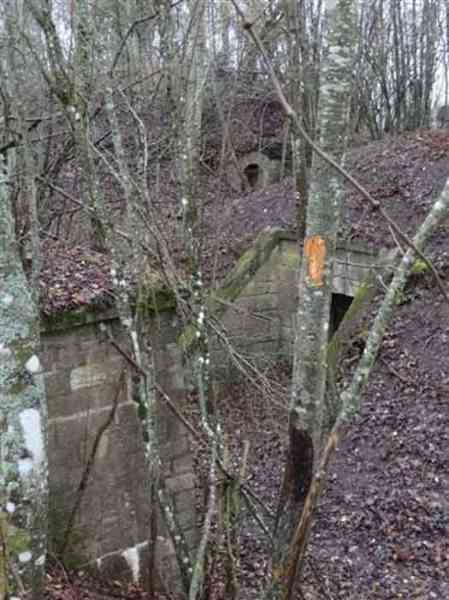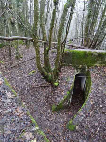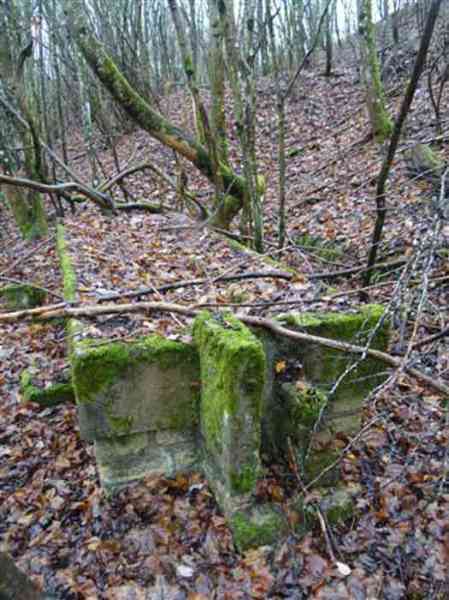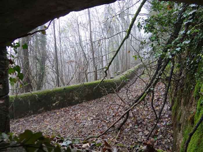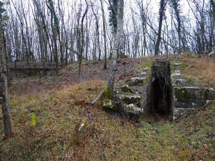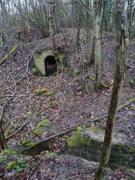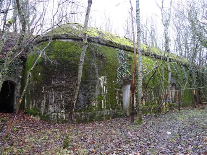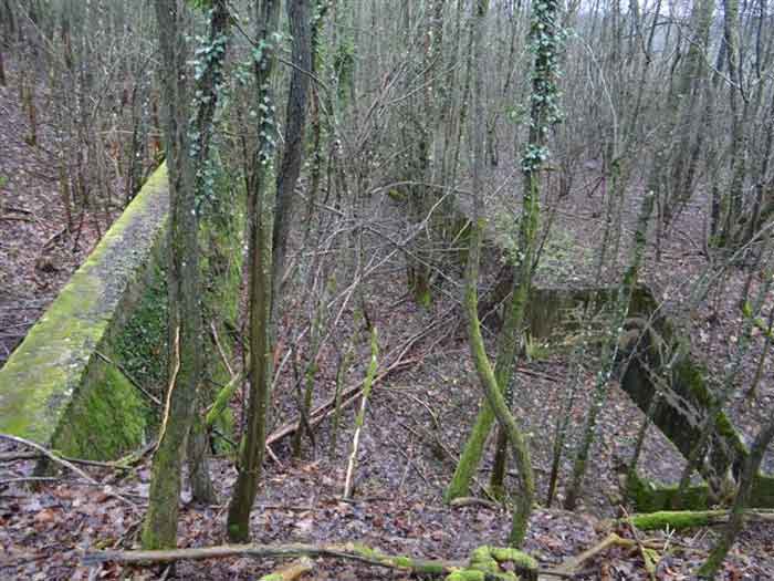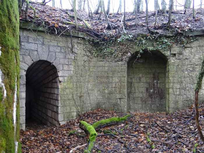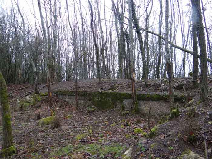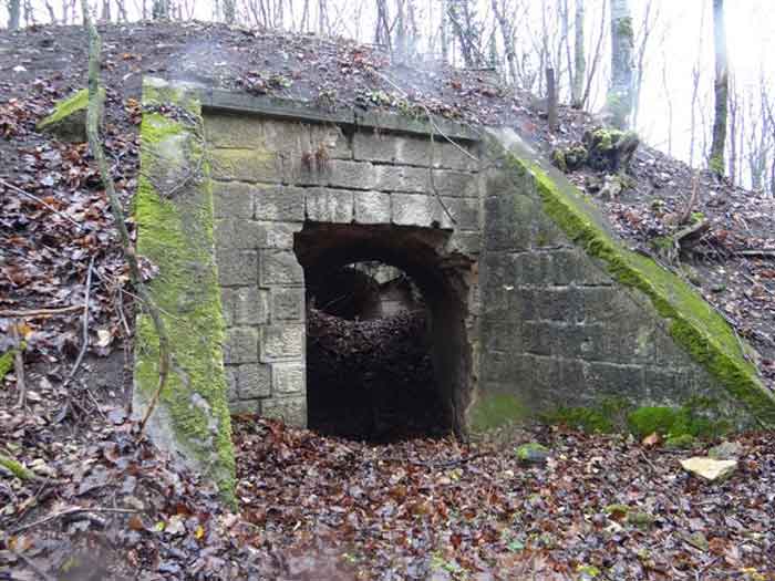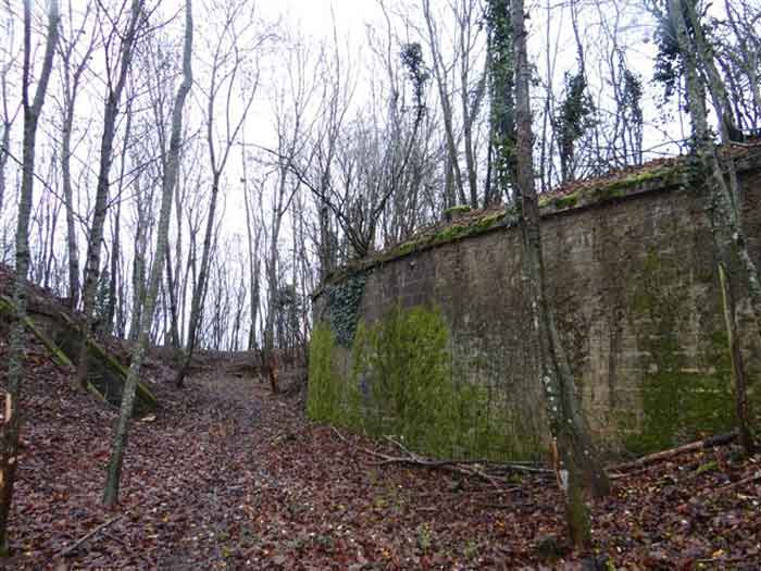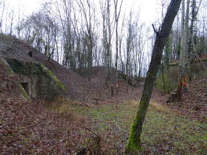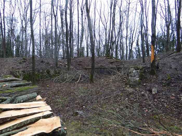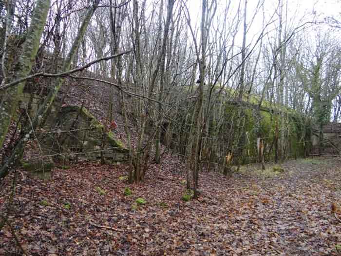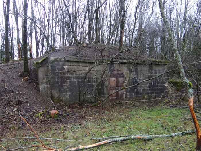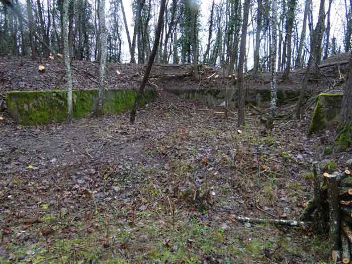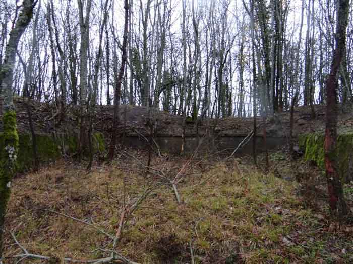 Toul fortified camp, north of the city, 1874-1877. 370 m alt. Battery forming an integral part of the envelope of the fort of Mont Saint-Michel. We only found mention of it under this name on a plan subsequent to the concreting of the redoubt. It occupies the northeastern part of this envelope. Originally, it comprised six shelter traverses, the fourth of which from the left was anchored to an earthen mound extending to behind the eastern battery of the envelope (see envelope of the fort of Mont Saint-Michel). Eleven cannons were placed on the platforms, one firing due west, three oriented north, three others to the NNE and the last four to the ENE. In 1885, a competition was held at the Cotroceni polygon in Romania, between builders, with a view to equipping the Bucharest forts with armor. France participated with a cupola which, in short, was an improvement on that of Commander Mougin's Mle 1876. It is known as the Saint-Chamond cupola. The diameter was now only 4.80 m and the height outside the shaft no longer exceeded 1.20 m. The embrasures were smaller, thanks to a new device for damping the recoil of the guns. The rollers allowing the rotation of the assembly were moved under the voussoirs and the weight relief thanks to the use of a glycerin water pump was not only retained, but improved so as to be able to raise the cupola by 50 cm to facilitate certain maintenance work. The armament consisted of two long 155 mm cannons of the de Bange system. By six votes to three, the French cupola was adopted over its German competitor. However, it was not until 1891 that Romania placed a firm order for 34 examples. This order, however, concerned a modified armor. Indeed, from a cylindrical turret, a domed cap had been chosen, which required a change to a diameter of 6.30 m, despite which the volley of guns still protruded by 50 cm, but a further 0.15 m in height was gained. This modified armor underwent trials at the Chalons camp between October 1887 and May 1888. As an opponent, it had the turret of Lieutenant-Colonel Bussière. Neither really convinced. Better was expected and this improvement would arrive two years later with the turret of Captain Galopin. The two turrets of the competition were recovered and transferred, one (Mougin) here to the fort of Mont Saint-Michel and the other (Bussière) as an annex of the fort of Souville. Around 1890, behind the third traverse, the substructures of the turret were poured, substructures connected by a corridor of about fifteen meters with a small concrete barracks. The block of the turret includes an annular gallery from which starts, straight towards the redoubt, a very long gallery comprising only two diverticula plus a small magazine, diverticula in a dead end. Shortly before reaching the height of salient V of the redoubt, the gallery slants to the left and goes, not far from salient VI of this redoubt, to end at the head of the goods lift going up from the sector magazine (see Mont Saint-Michel). An emergency exit was made towards the ditch of the redoubt near this hoistway head. To sink the barracks and install the impressive (approximately 15 m in diameter) concrete block of the turret, it was necessary to remove crosspieces 4 and 5 of the initial battery. To the right of the barracks, a small gallery leads, after a staircase, to a special construction. In fact, this construction is completely identical to the casemated tower that forms the outer wall of the Mont Saint-Michel fort in front of the Bruley battery. Of its seven musketry loopholes, this defensive structure could only have actions in the ditch of the outer wall. The turret was scrapped by the occupier around 1943 or 1944. Today (12/2011), some walls of the turret block are tagged but not excessively compared to what some forts in the same place have. The support for the glycerin water pump is still there, as are the four pieces of the press pot, which measured 120 cm. The annular gallery and the gallery towards the freight elevator are still immaculate. Opposite the barracks, a shelter traverse remains, while three others remain visible beyond the turret massif, including one that is singularly damaged and the one leaning against the massif accessible only by a narrow corridor forming a traverse arm. An observatory with access through a narrow trench precedes this battery, which we would not bet a cent that it was still armed in 1914. On the other hand, directly to its left, beyond a small covered passageway allowing access to a short portion of the parapet of the envelope escarpment, of the three shelter traverses of the battery of the north curtain wall, only the central one remains, framed by two platforms with concrete sides and parapets. This, however, seems to testify to a late armament. Moreover, the platforms of the Pont-à-Mousson battery would have been made (very) uncomfortable by the shots from the turret if they had to be directed over them. Like the rest of the mountain, the Pont-à-Mousson battery is private property.